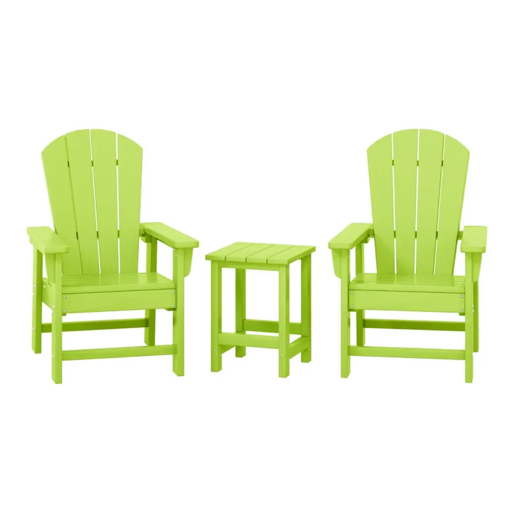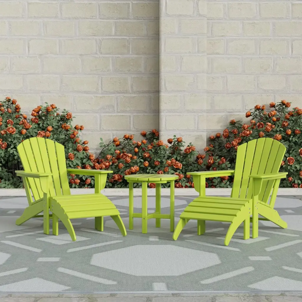 Sit back, relax, and catch a tan or enjoy some family time on these stunningly crafted 5-piece Adirondack chairs with ottoman set. Designed with comfort and style in mind, with a broad armrest for extra armroom, a seashell design and curved reclined backrest for a more comfortable seat, and a high back that helps create less tension on your back. Constructed from a durable and solid HDPE material that is weather resistant and, unlike wood, won't rot, crack, chip, peel, or splinter. A UV-protective coating prevents fading, keeping the colors vibrant and amazing all year long. These attractive chairs are easy to clean, making them perfect for the outdoors, and they are sure to make your backyard the place to be.While we strive to accurately represent product colors, please be aware that actual colors may vary slightly due to individual screen settings and lighting conditions. FeaturesSet includes two (2) Adirondack chairs with two (2) ottomans and one (1) side tablestain-resistant in case of any accidentsWeather-resistant material safeguards against the elements and UV ray coating stops color fadingSturdy construction that is long-lasting and resistant to chipping, flaking, or splintersSimple to clean with just soap, water, and a soft brushVariety of lovely fade-resistant colorsMade of weather-resistant material that can survive the outdoor elementsDetails:Product Type: Patio Conversation SetsWhat's Included: (2) Adirondack Chair; (2) Ottoman; (1) Side TableAdirondack ChairDimensions: 31.75" W x 33.5" D x 36.5" HWeight: 42 lbs.Seat Width: 22"Seat Depth: 20"Seat Height: 15"Weight Capacity: 450 lbs.OttomanDimensions: 20" W x 13.5" D x 18.75" HWeight: 8.75 lbs.Seat Width: 22"Seat Depth: 20"Side TableDimensions: 17.5" W x 17.5" D x 18" HWeight: 10.5 lbs.Weight Capacity: 180 lbs.