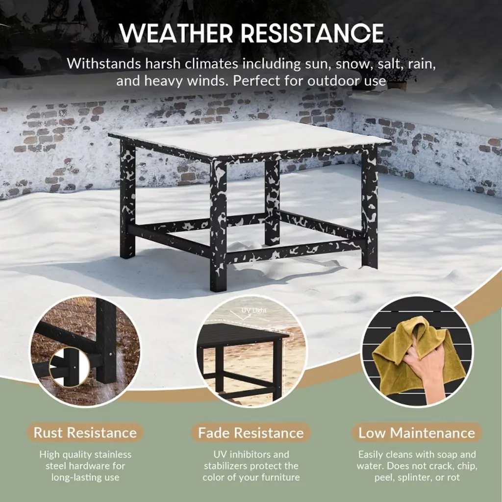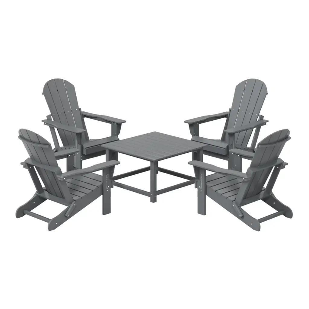 Gather around with your loved ones around our charming 5-piece Adirondack conversation set. Crafted with a durable HDPE all-weather material that is perfect for the outdoors with its resistance to UV and fading. Foldable chairs for easy storage and contoured seats to help relieve tension on your lower half and combined with the wide 30" Square coffee table that provides plenty of space for all your drinks and a center umbrella hole that can fit 1.6" umbrella poles for added shade.While we strive to accurately represent product colors, please be aware that actual colors may vary slightly due to individual screen settings and lighting conditions. FeaturesSet Includes: Four (4) Adirondack Chairs, One (1) 30" Round Coffee TableConstructed from Durable HDPE Material and Designed to be Stable and SturdyWeather Resistant to Protect Against the Harsh Outdoor Elements and Fade and UV Resistant to Protect Against the Sun30" Inch Wide Table Top Fitted with a 1.6" Center Umbrella Hole to that Fits Most Standard Umbrellas (Umbrella Sold Seperately;Hole Cover Included)Folding Design for Simple and Easy Storage and Contoured Seat for Tension Relief on your Lower HalfReinforced Table Top Design for Added Durability and Thick Legs with Beam Connection for Added StabilitySmooth and Rounded Edges for Added Protection Against Scratches or BruisesDetails:Product Type: Patio Conversation SetsWhat's Included: (4) Adirondack Chair; (1) Coffee TableAdirondack ChairDimensions: 29" W x 31.5" D x 34.5" HWeight: 32.75 lbs.Seat Width: 20.25"Seat Depth: 20"Seat Height: 14.5"Weight Capacity: 450 lbs.Coffee TableDimensions: 30.75" W x 30.75" D x 17.5" HWeight: 35.25 lbs.Weight Capacity: 300 lbs.