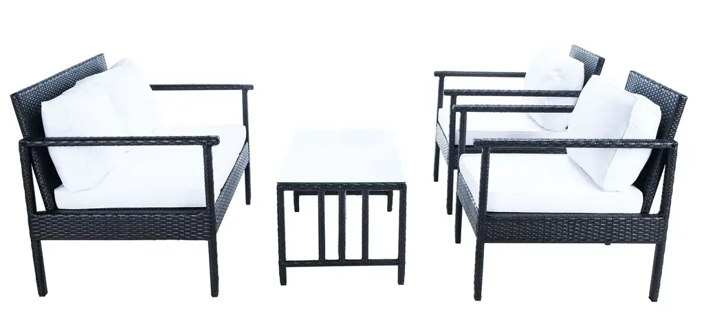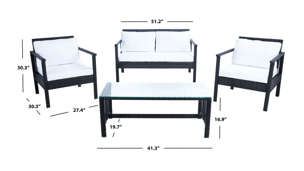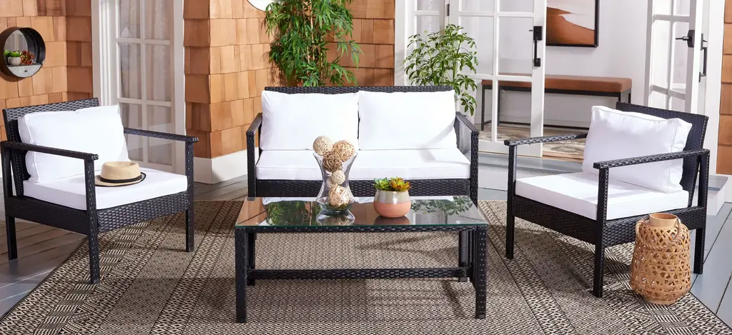 Tropical British Colonial style is given a modern coastal update in this deluxe Winta 4-pc. Patio Set. Winta's modern, clean lined frames are beautifully offset by woven wicker, and the plush cushions on its two armchairs and loveseat are ultra comfortable. Includes matching glass topped coffee table.