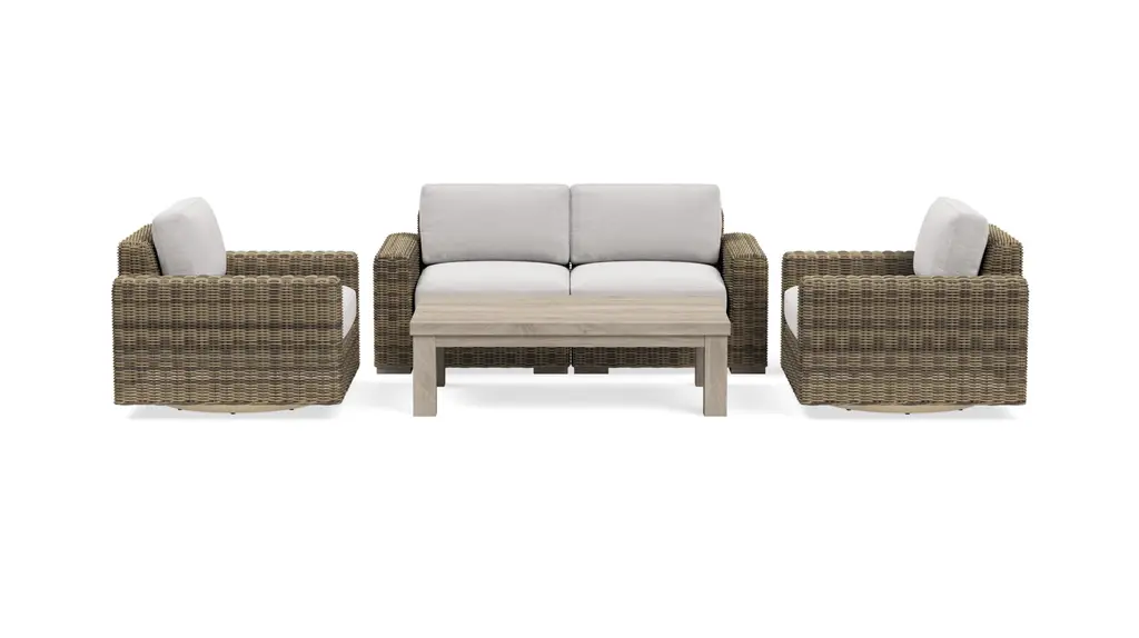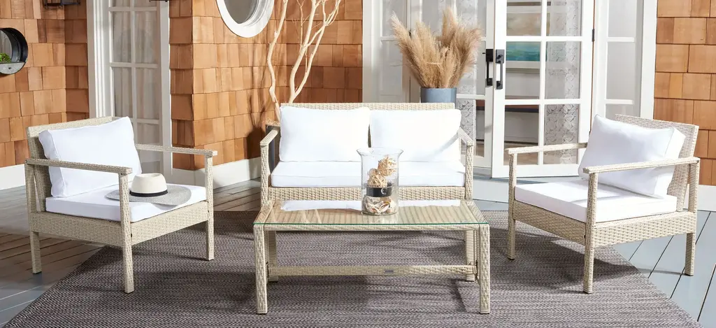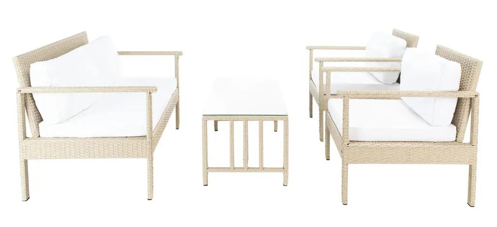 Tropical British Colonial style is given a modern coastal update in this deluxe Winta 4-pc. Patio Set. Winta's modern, clean lined frames are beautifully offset by woven wicker, and the plush cushions on its two armchairs and loveseat are ultra comfortable. Includes matching glass topped coffee table.
