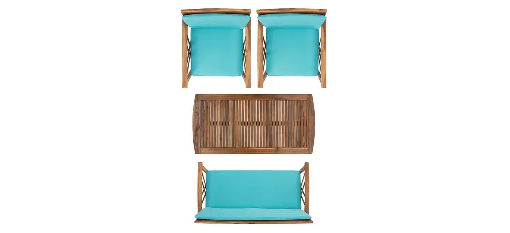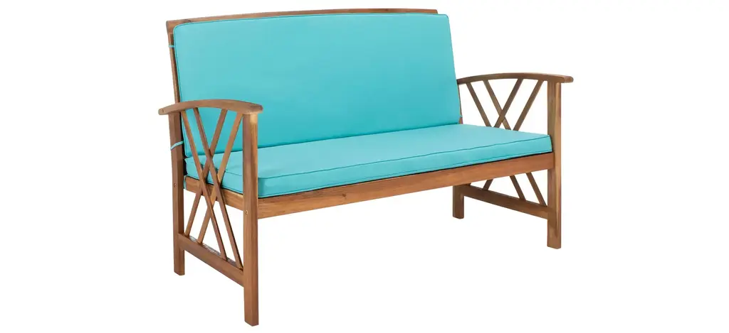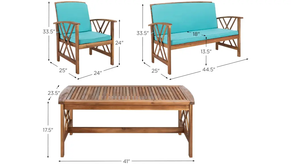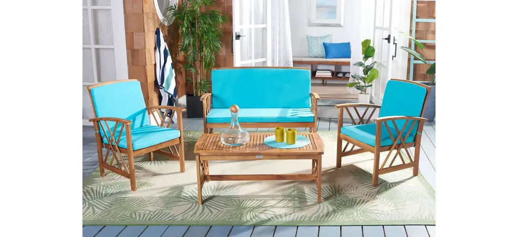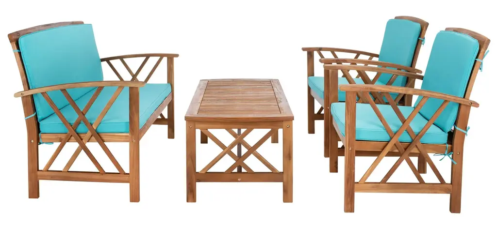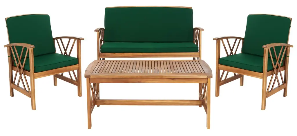 A distinctive double X motif adorns the sides of the Wrangell 4-pc. Patio Set for a luxe transitional look. Masterfully crafted of sustainable acacia wood in a natural finish, the set comes with beige all weather seat and back cushions.