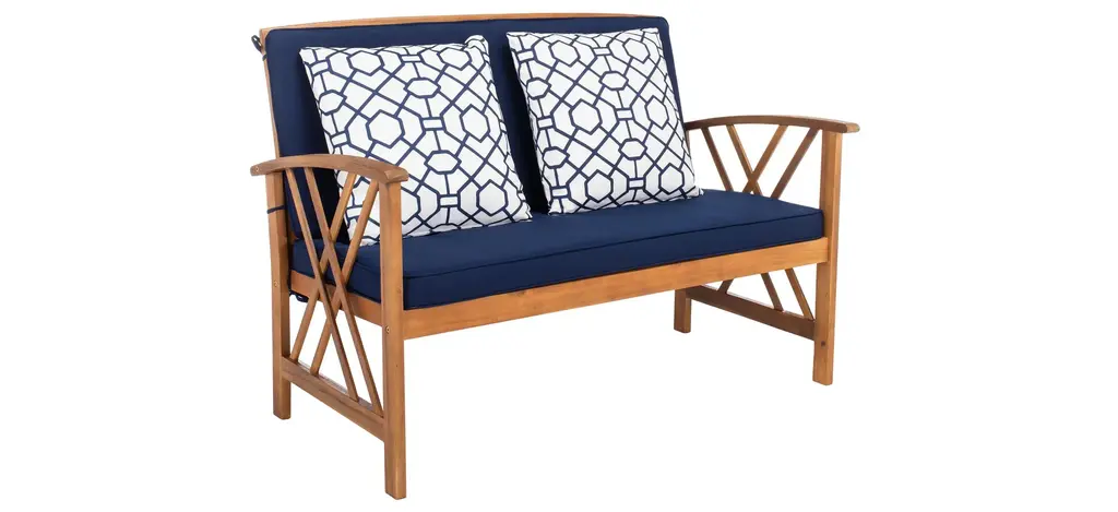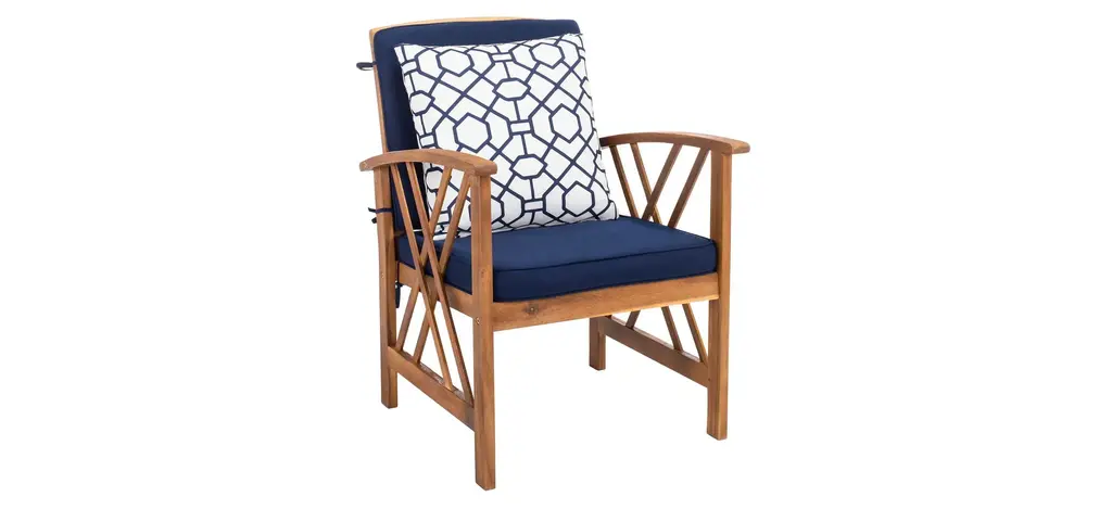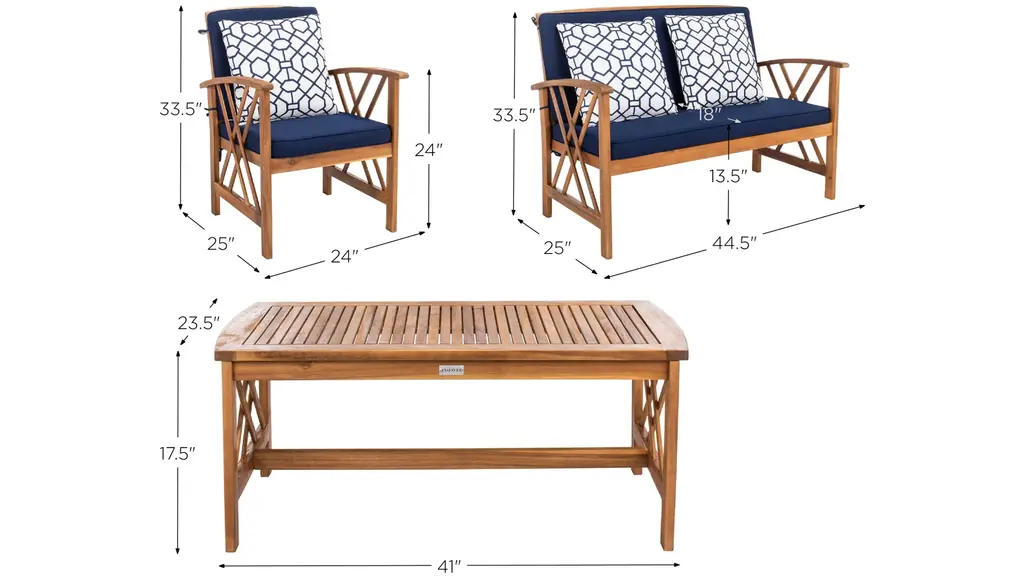 A distinctive double X motif adorns the sides of the Wrangell 4-pc. Patio Set for a luxe transitional look. Masterfully crafted of sustainable acacia wood in a natural finish, the set comes with beige all weather seat and back cushions.