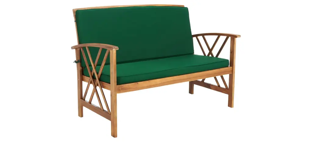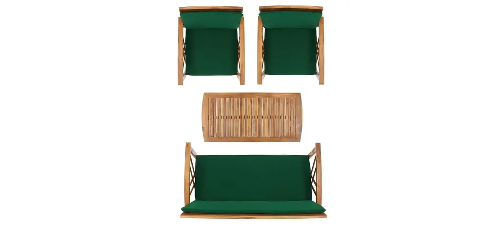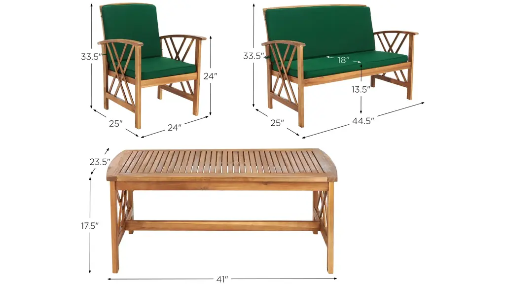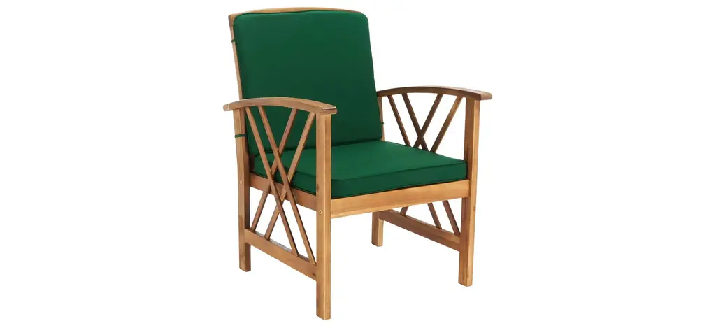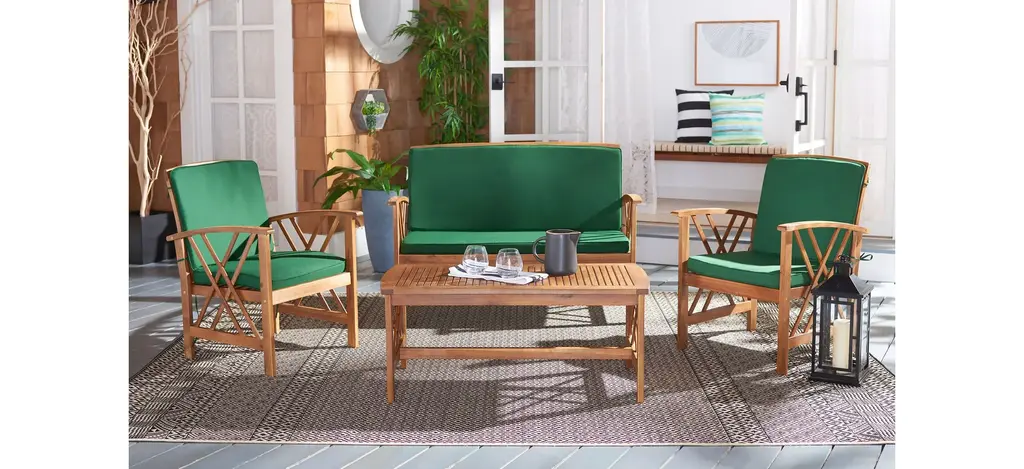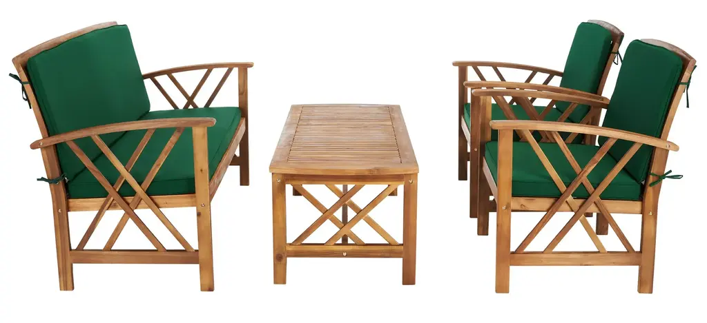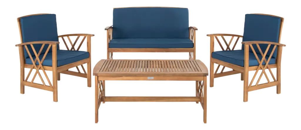 A distinctive double X motif adorns the sides of the Wrangell 4-pc. Patio Set for a luxe transitional look. Masterfully crafted of sustainable acacia wood in a natural finish, the set comes with beige all weather seat and back cushions.