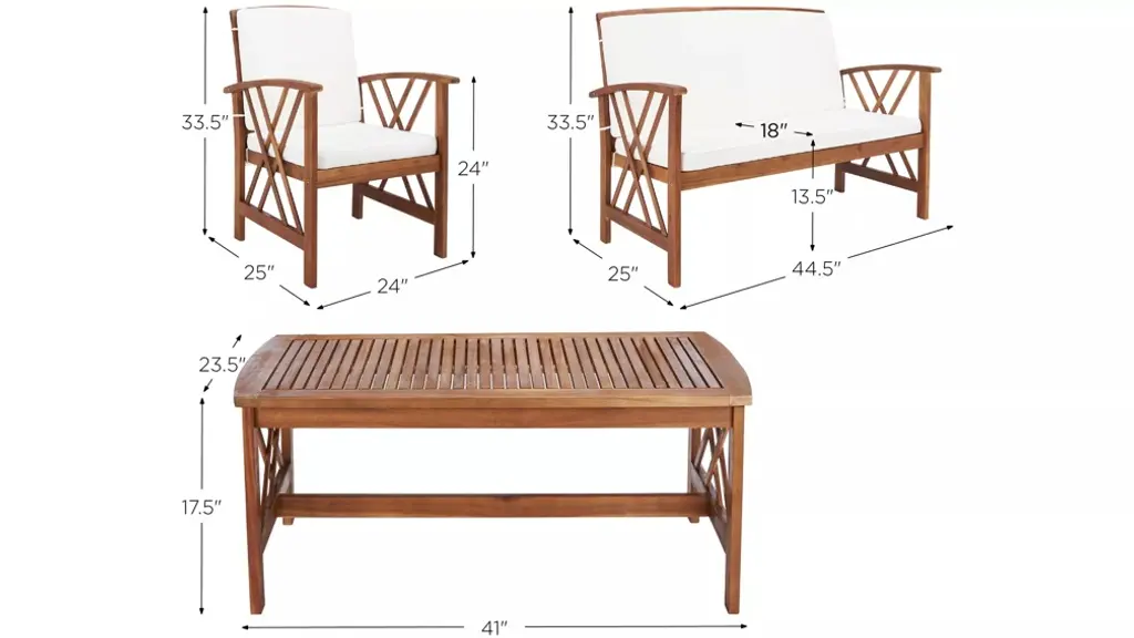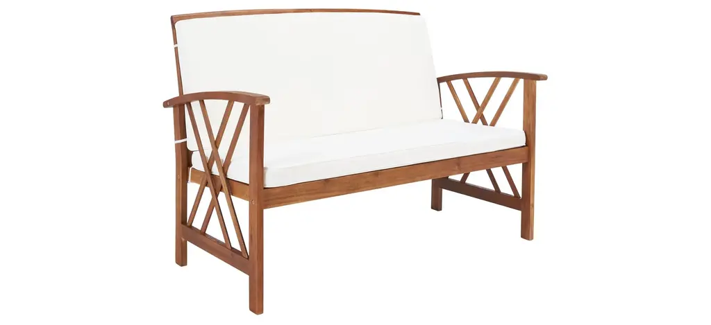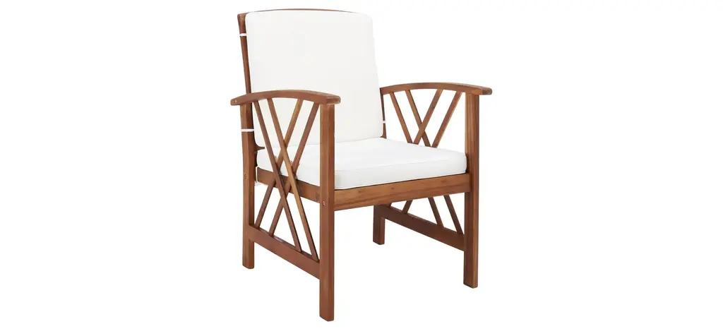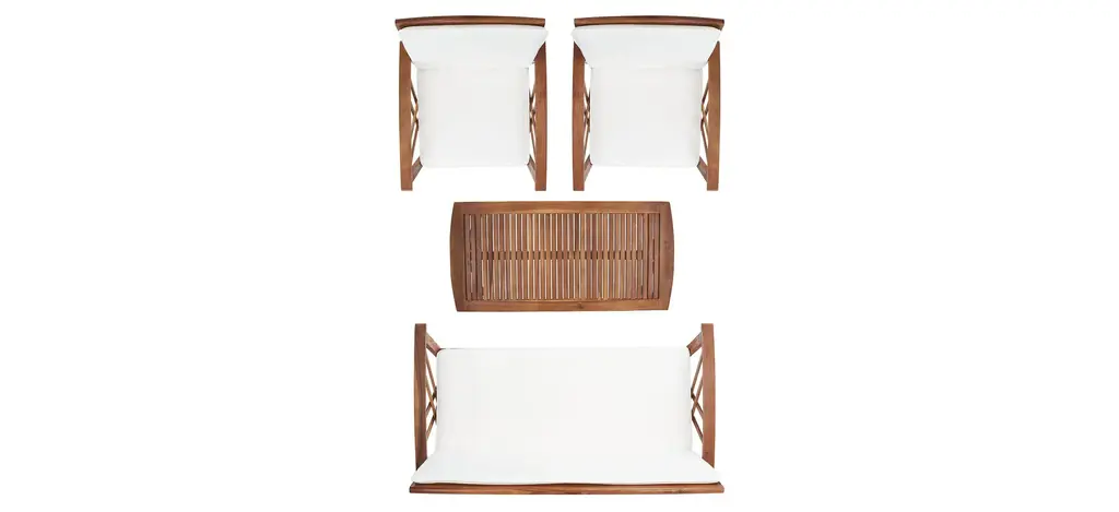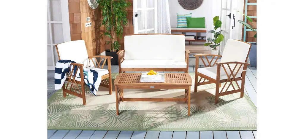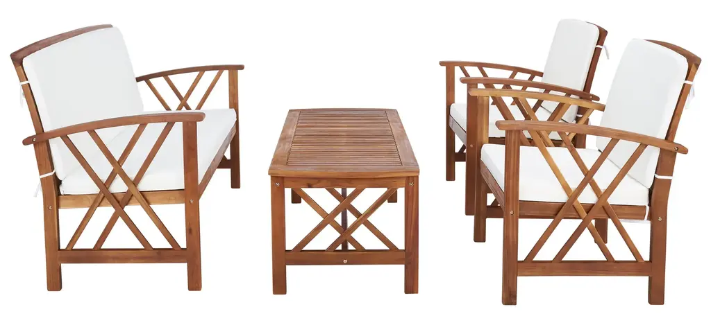A distinctive double X motif adorns the sides of the Wrangell 4-pc. Patio Set for a luxe transitional look. Masterfully crafted of sustainable acacia wood in a natural finish, the set comes with beige all weather seat and back cushions.