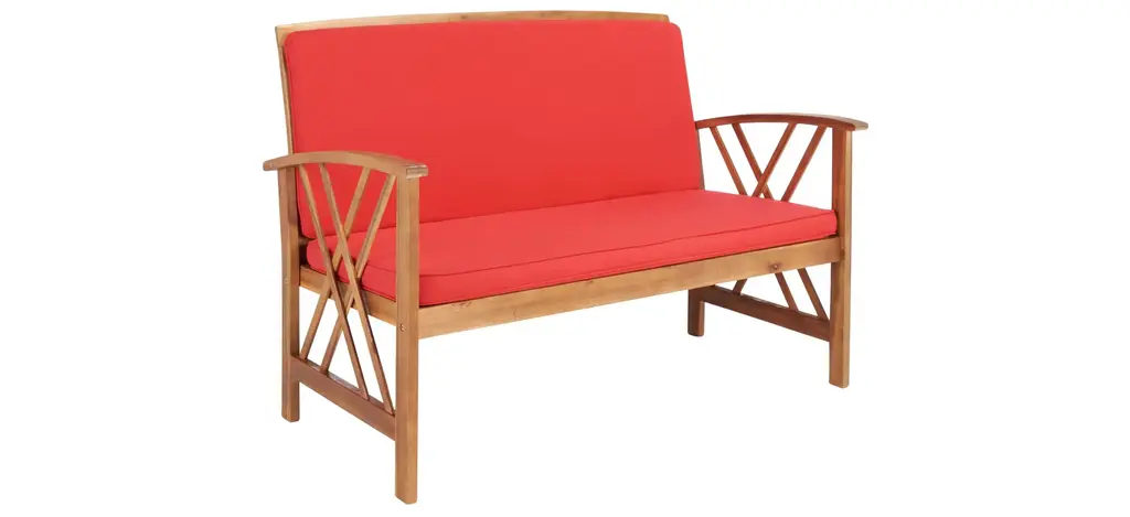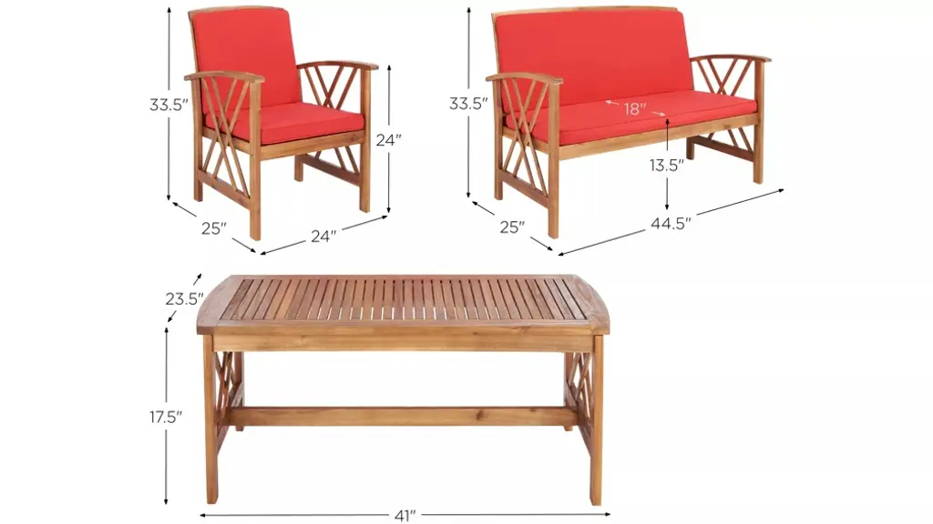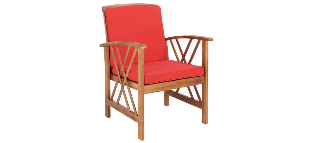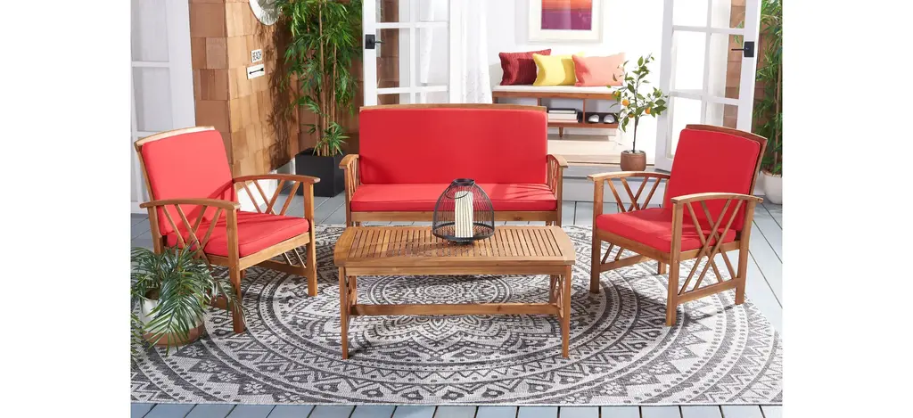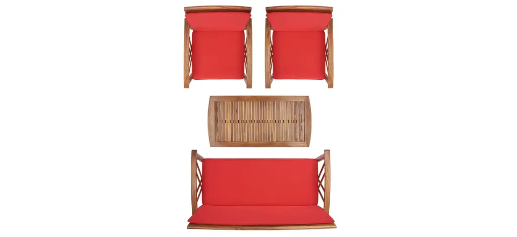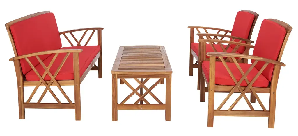 A distinctive double X motif adorns the sides of the Wrangell 4-pc. Patio Set for a luxe transitional look. Masterfully crafted of sustainable acacia wood in a natural finish, the set comes with beige all weather seat and back cushions.