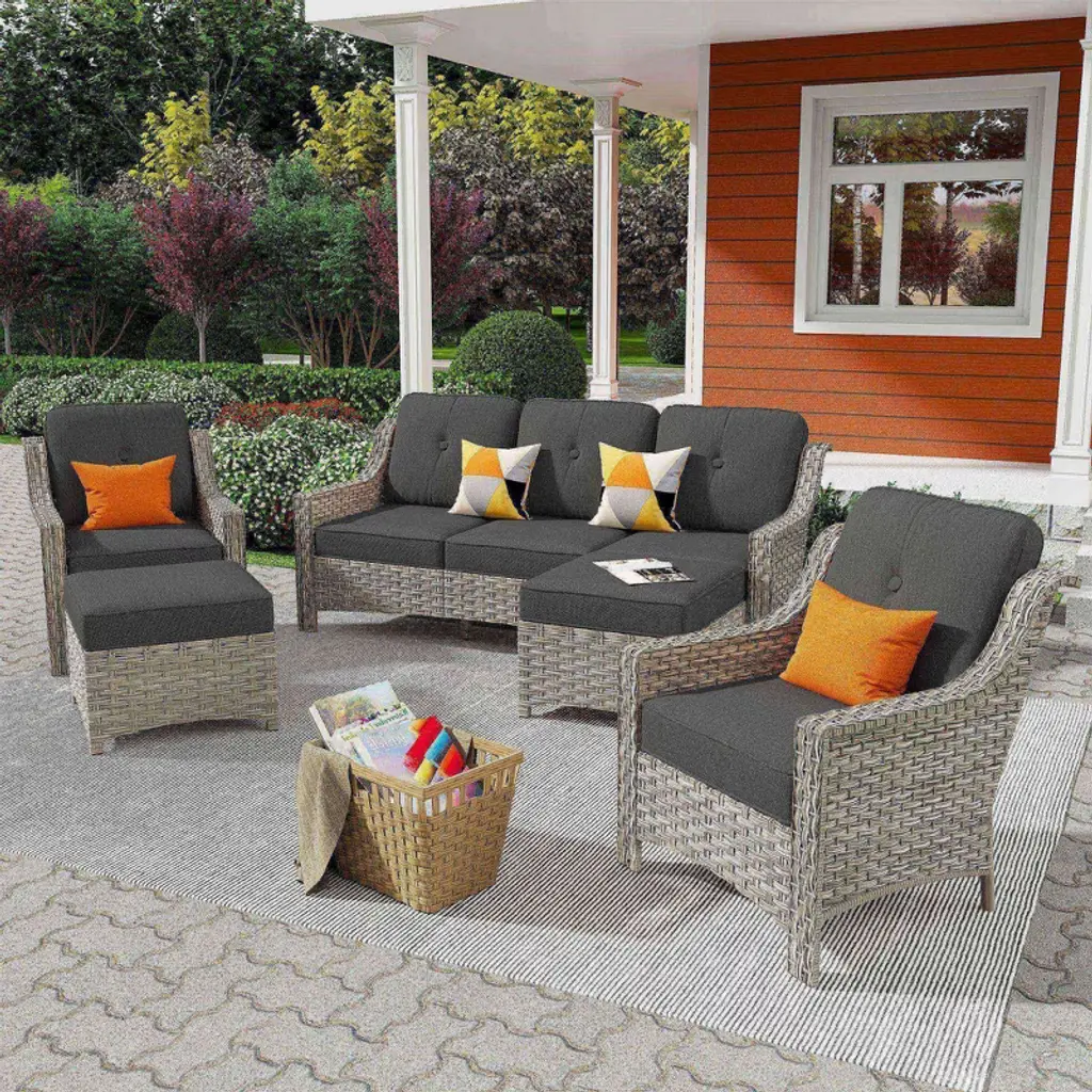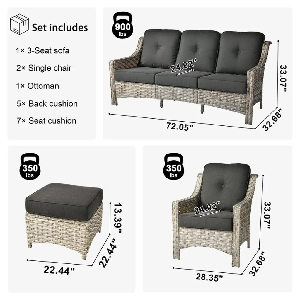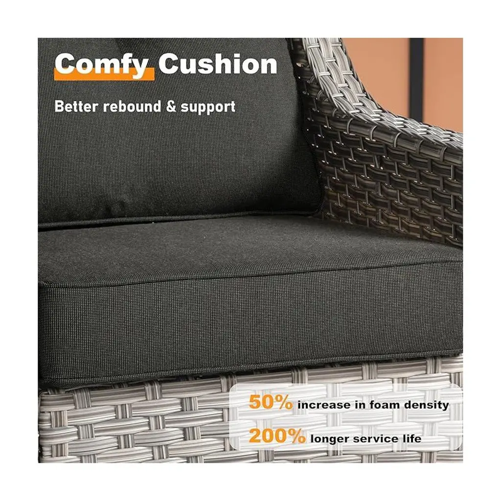 Handcrafted Rattan Seating: Crafted from exquisite PE rattan in a sophisticated light brown hue,our premium wicker furniture exudes a touch of fashionable allure. The sturdy steel frame provides a solid foundation, while the meticulously hand-woven PE rattan offers strength, durability, light weight and water resistance to effortlessly withstand the vagaries of changing weather conditions. Luxuriously comfortable Outdoor outside sofa set Set: Sink into plush cushions generously stuffed with a rich 3.5" sponge that stays irresistibly fluffy and retains its original shape. Say goodbye to sitting fatigue as these cushions provide unwavering support. Ideal for extended outdoor lounging with loved ones or long conversations, they cater to your utmost relaxation needs Free Combination Patio Modular Set: Customize your outdoor oasis with our versatile modular patio furniture set. Embark on a creative journey and explore different layout options to create a cozy outdoor retreat perfect for relaxing, entertaining or simply basking in the splendor of the great outdoors. Design your idyllic setting and take your outdoor living experience to new heights Incomparably Comfortable Upgrade Fabric Cushions: Immerse yourself in pure bliss with our meticulously crafted cushions designed exclusively for outdoor use. These exceptional cushions effortlessly repel water and UV rays, ensuring their longevity and reliability. Whatever the weather, they promise countless moments of relaxation. Plus, they are easy to clean, so you can keep them in pristine condition without hassle Effortless assembly & maintenance: Experience the ease of assembling this set with the tools provided. The combination of splash-proof fabric and rattan materials makes maintenance easy and cleaning a breeze. Cushion covers are easily removed for convenient laundering, ensuring impeccable freshness
