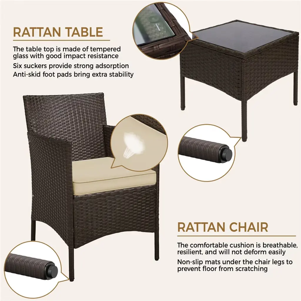 Let this three-piece wicker furniture suit illuminate your veranda, terrace, or living area! The rattan chairs and table are constructed with a high-quality steel frame and waterproof PE rattan, ensuring durability against rain, sun, and wind while maintaining their condition even with prolonged use. The chairs are equipped with soft foam-padded seat cushions that resist deformation. Suitable for both indoor and outdoor use, all necessary hardware and instructions are provided for easy assembly. Bring home this practical chair and table set today! * Specifications: Material: Steel, PE Rattan, Foam, Polyester, Tempered GlassColor: Black/Gray, Brown/Khaki, Black/Khaki, Gray/Dark Blue, Black/CyanQuantity: 2 Chairs + 2 Cushions + 1 TableChair Assembled Dimension: 23" W × 24" D × 32.5" HTable Assembled Dimension: 15.7" L × 15.7" W × 19.5" HSeat Height (include cushion): 18.7"Seat Depth: 17.3"Seat Width: 17.7"Maximum Weight Capacity:Chair: 286 lbTable: 22 lb Please see the image for exact measurements.Please allow ±1/2" measurement tolerance.