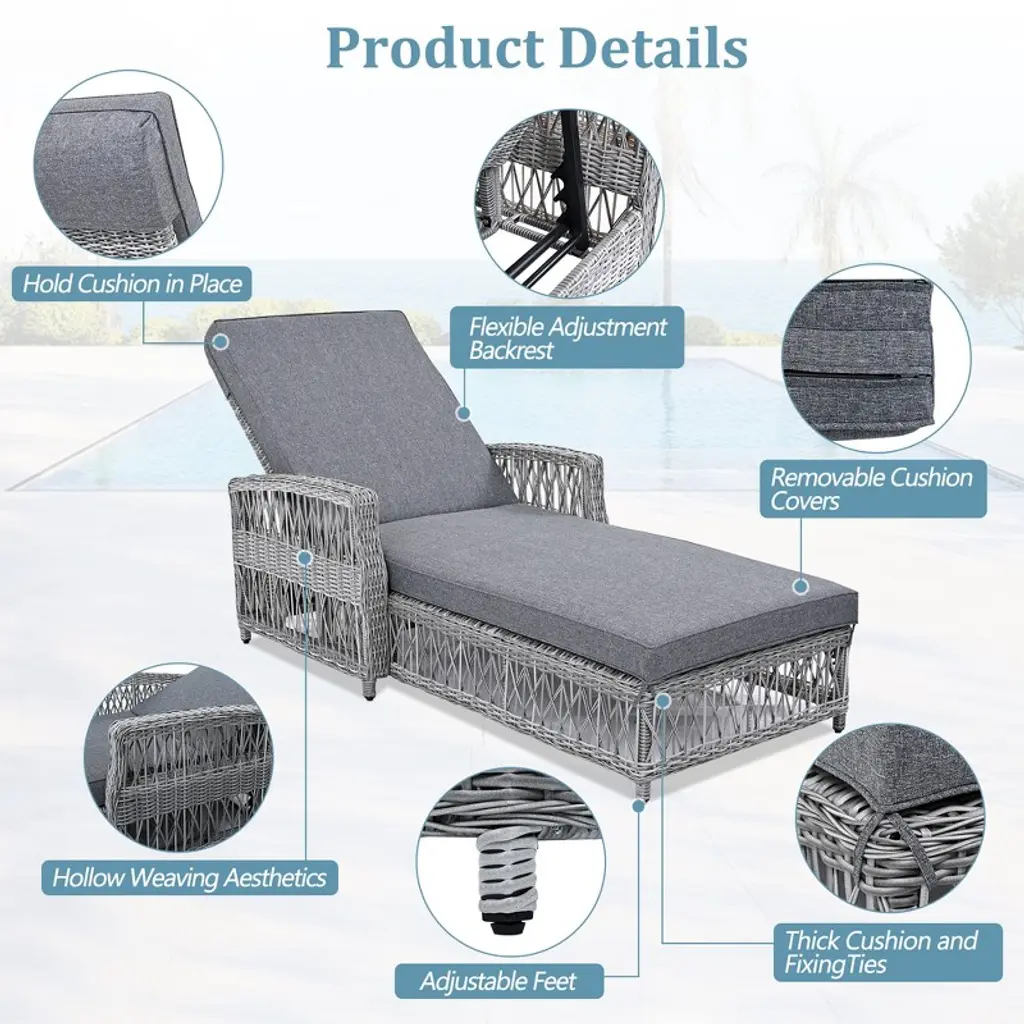 Enhance your outdoor relaxation with our Set of 2 Adjustable Poolside Lounger Chairs. Each chair features ergonomic armrests for added comfort while lounging, reading, or sipping drinks. Crafted from durable semi-circular resin wicker and supported by a sturdy powder-coated iron frame, these chairs are designed to withstand outdoor wear and tear. The 4-inch thick cushions are soft and securely tied to prevent slipping, with removable and washable covers for easy maintenance. The beautifully woven gray PE rattan adds a touch of elegance and is resistant to fading, ensuring long-lasting beauty. These chairs are ideal for patios, poolside areas, decks, balconies, and terraces, creating a perfect outdoor living space for quality time with family and friends.