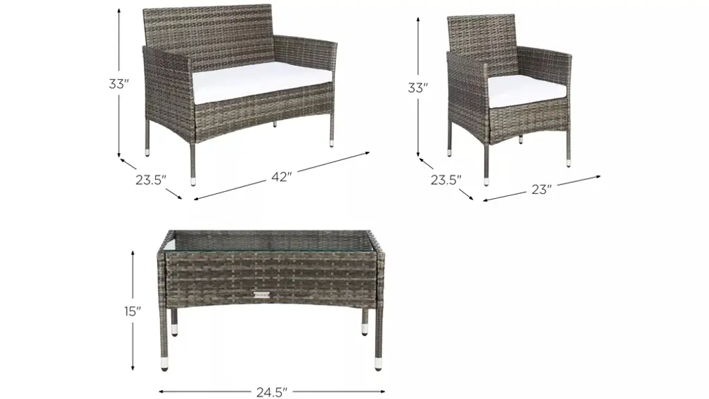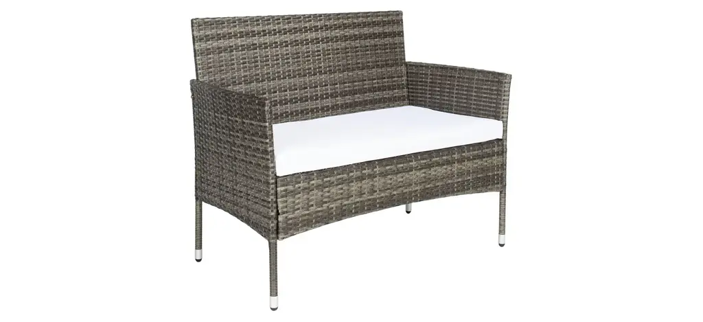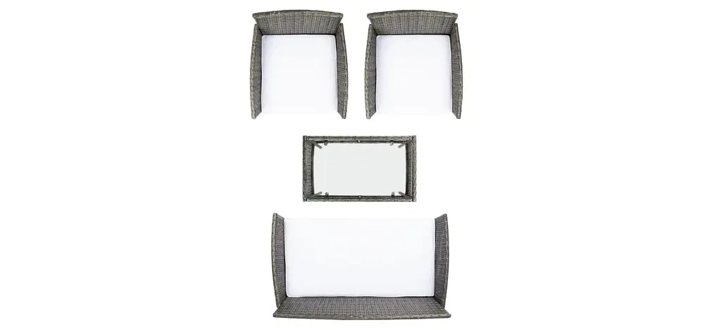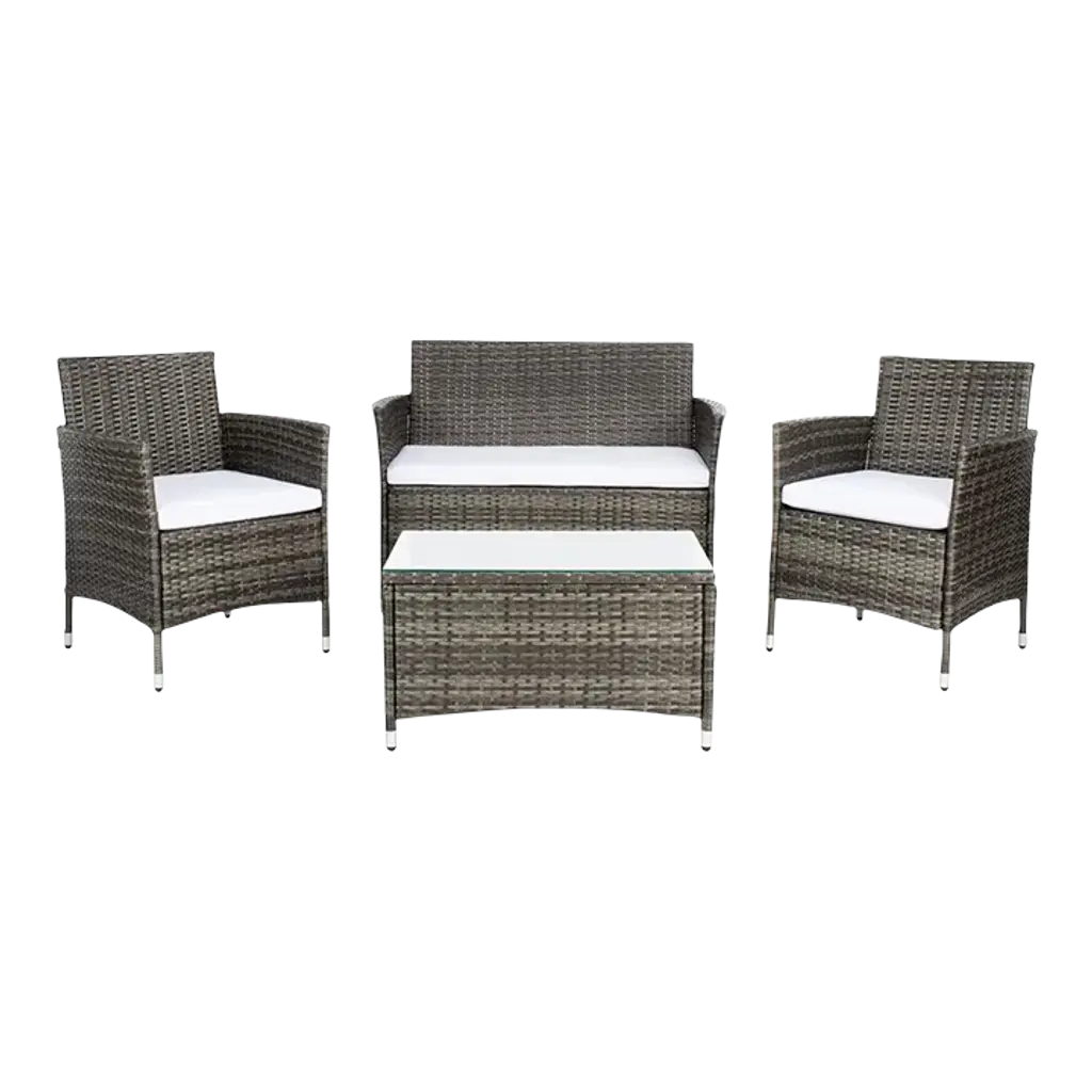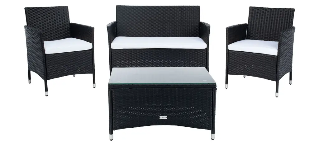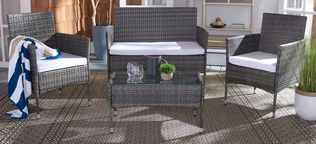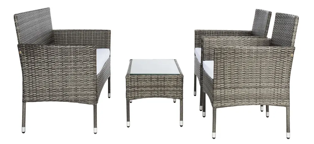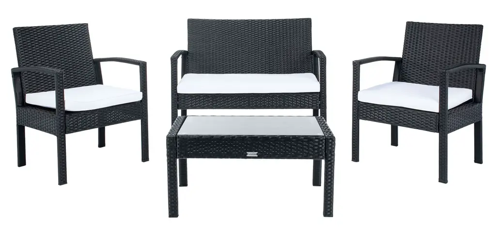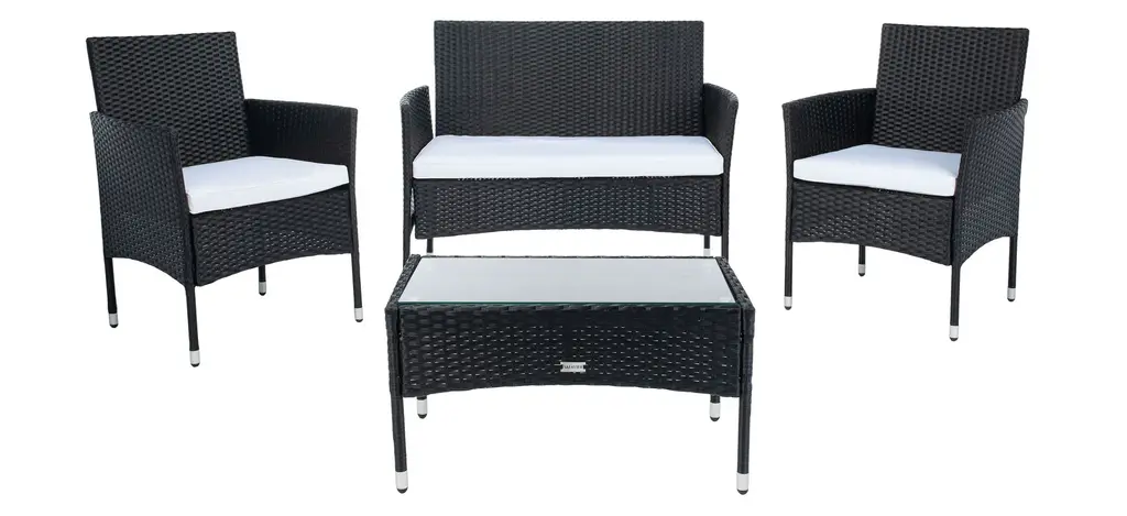 A smart combination of clean angles and smooth curves, the Yves 4-pc. Patio Set updates your outdoor entertaining space with chic modern flair. Yves's chic seats perfectly support plush cushions while its glass topped coffee table provides plenty of space for cocktails or appetizers.