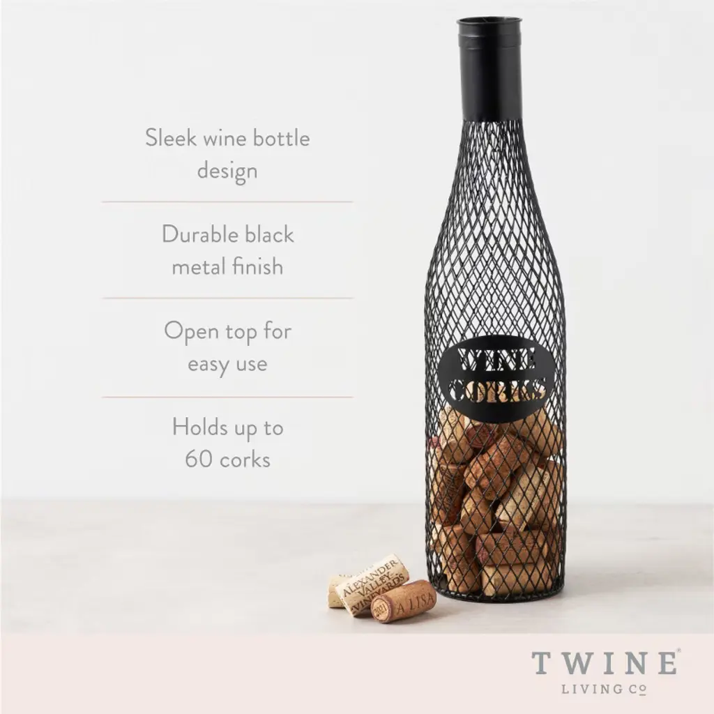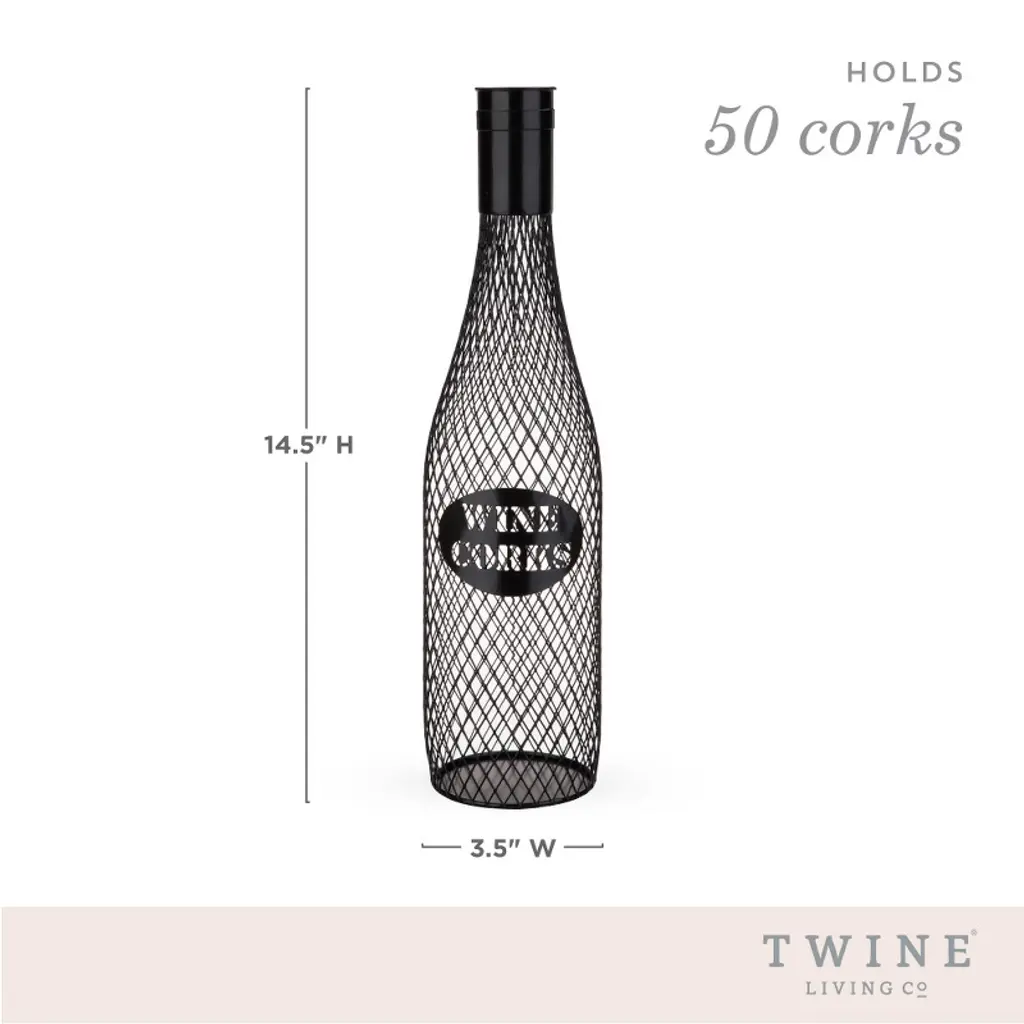 Form and function intertwine to create this metal cork holder. Its quaint wine bottle shape, sleek black finish, and clever label are all sure to charm. Holds up to 60 corks to satisfy even the heartiest wine lovers. Crafted from sturdy metal. Makes a great gift for design-conscious wine lovers. Holds 60 corks, measures 13" H x 3.5" W, cage design.