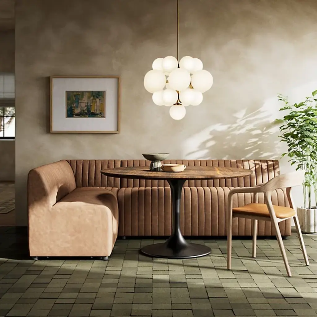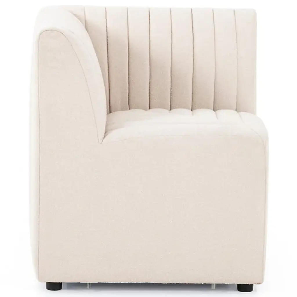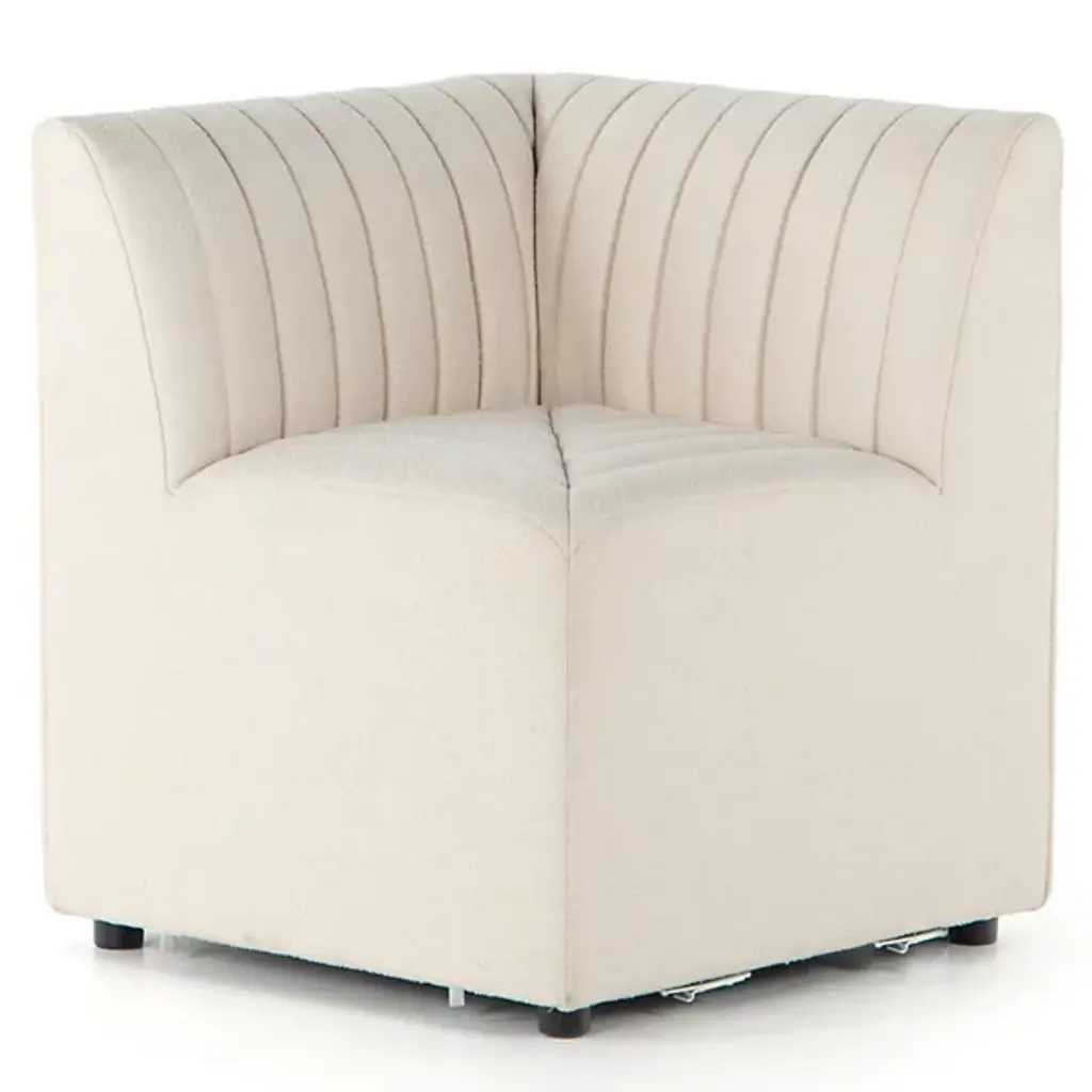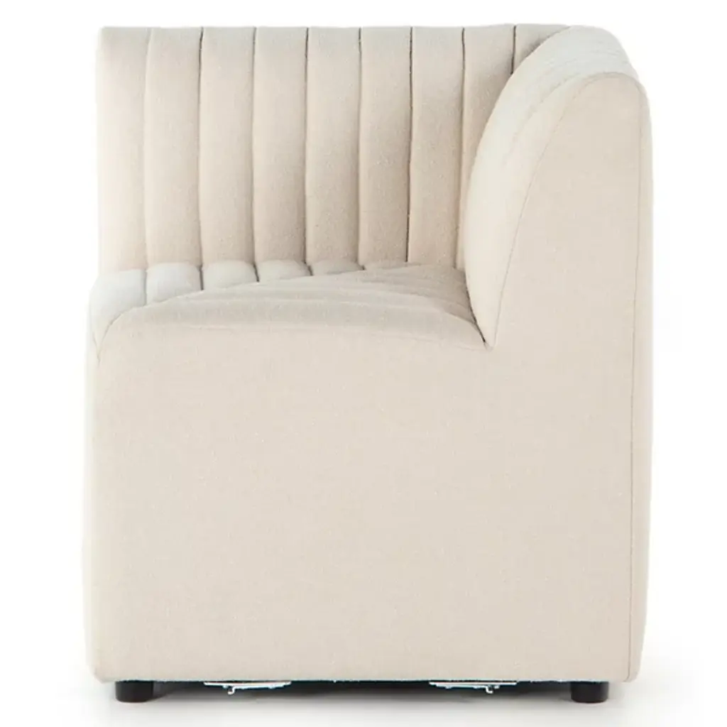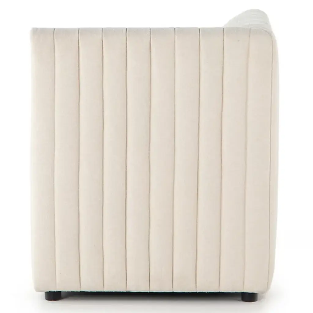 The Augustine Dining Banquette Corner Chair from Four Hands offers flexibility and style with clean lines and inviting design. Each seat sports soft upholstery, and its dramatic vertical channeling adds texture while enhancing comfort. Perfect as a standalone corner chair or combined in pairs for a cozy banquette or spacious lounge seat, this versatile design brings a refined touch to dining or living spaces with its modern, tailored look.
