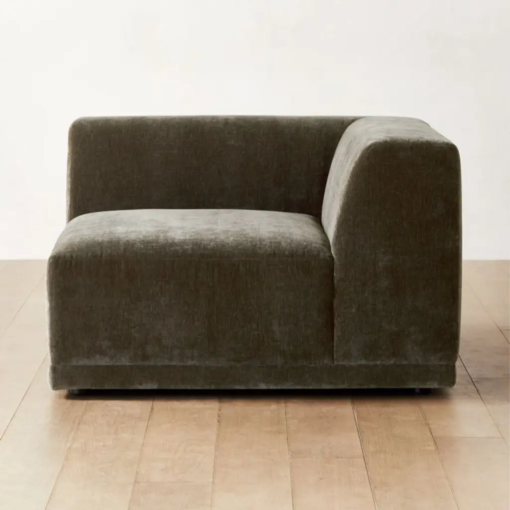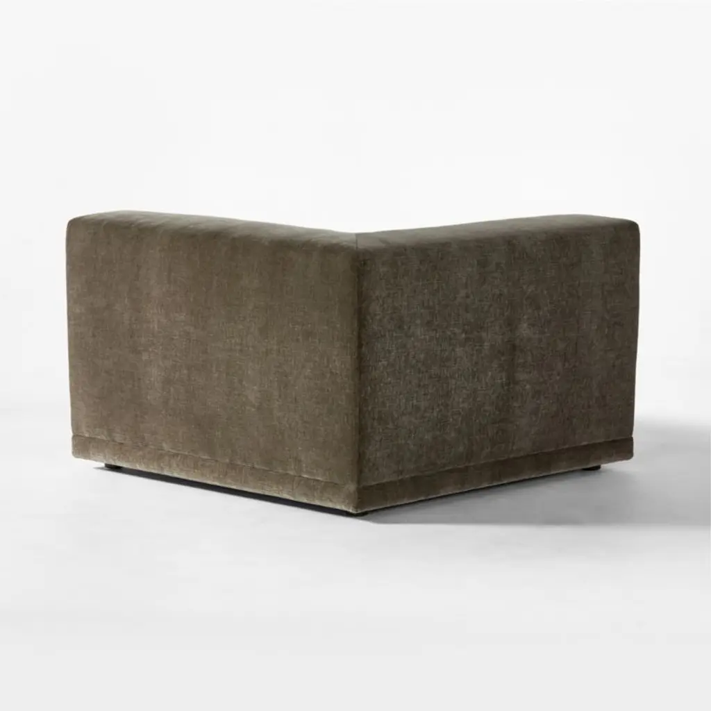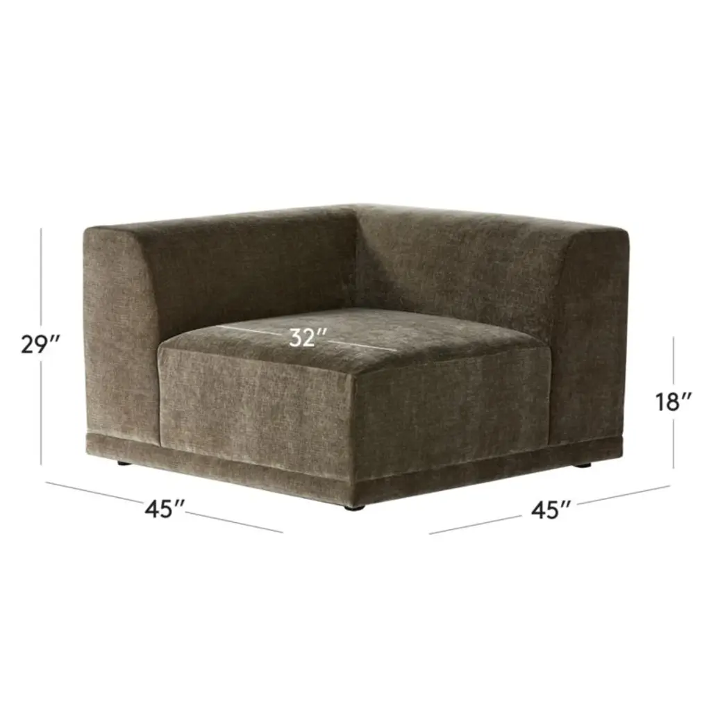 Deep, generously proportioned corner chair Designed by VUUE, is sophisticated in warm grey performance velvet. The oversized profile is perfect for lounging with family and friends without sacrificing style. Performance fabric withstands spills and other stressors, yet retains the lushness of a high-end textile. Add coordinating Faible pieces to create a spacious sectional sofa. CB2 exclusive.