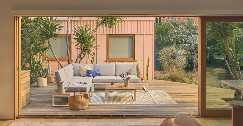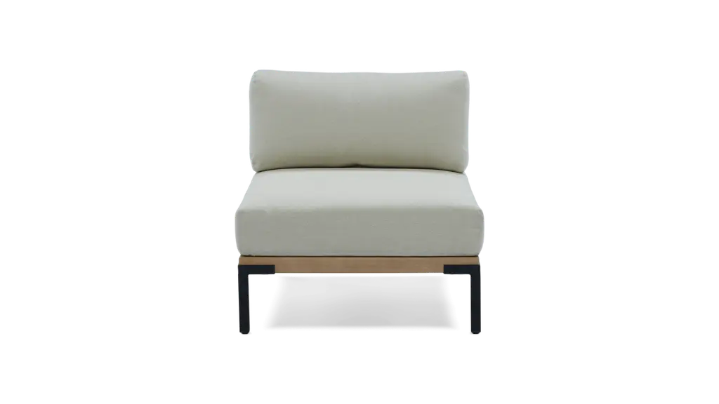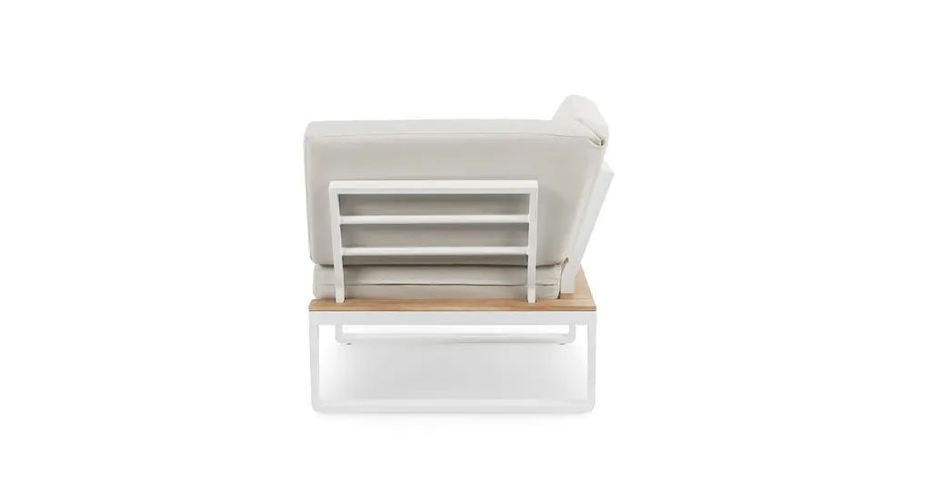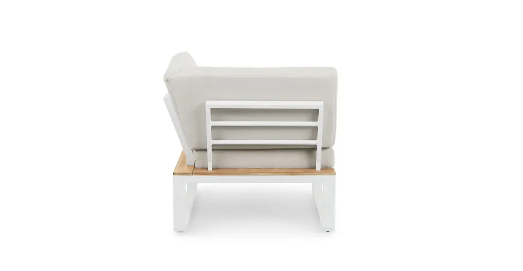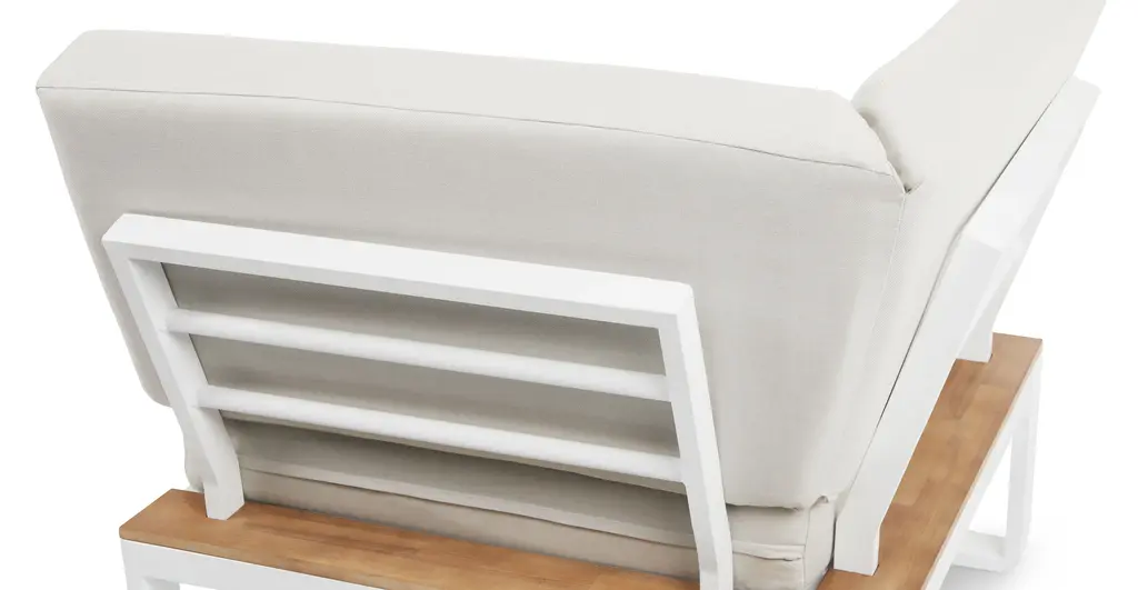Graphic, angular, totally plush. The Kezia is constructed from a tough aluminum base and acacia wood. Upholstered with weather-resistant fabric, the Kezia will see you through many seasons of barbeques and late-night patio beers — shower or shine.
