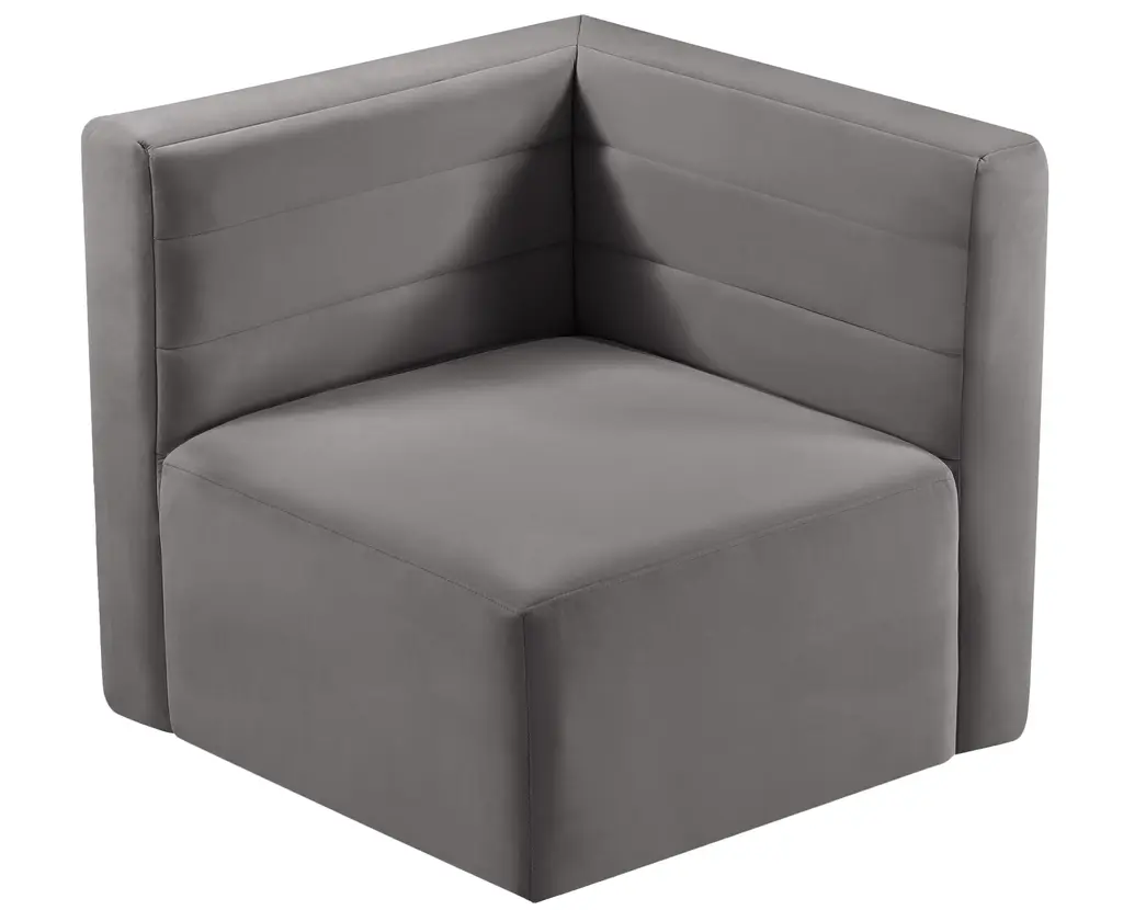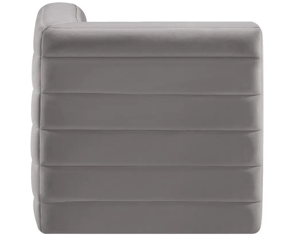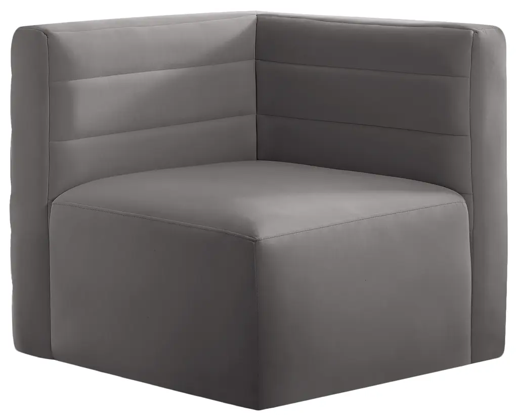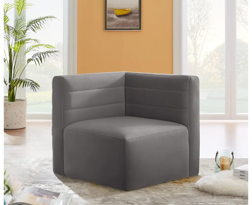 Show them all that less is more with the minimalist look of this Quincy velvet cloud-like comfort modular corner chair. This elegant chair features a simple design that's all about comfort and modern style. The soft grey velvet upholstery is sleek to the touch, and the back of the unit features deep horizontal channel tufting for a look that wows. Because this is a modular seating option, you can pair it easily with other items in the Quincy collection to create a look you love. Latches underneath make it easy to mix and match items from the collection.Overall Product Dimensions: 32" W x 32" D x 31.5" HSoft Grey VelvetDeep Horizontal Channel TuftingModular To Create Infinite ConfigurationsEasily Attach Using Attachment Latch UnderneathContemporary DesignSeat Dimensions:Seat Width: 25"Seat Height: 18"Seat Depth: 25"Arm Height: 30.5"Back Height: 12.5"