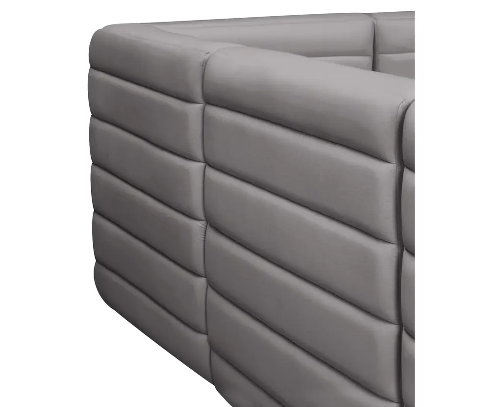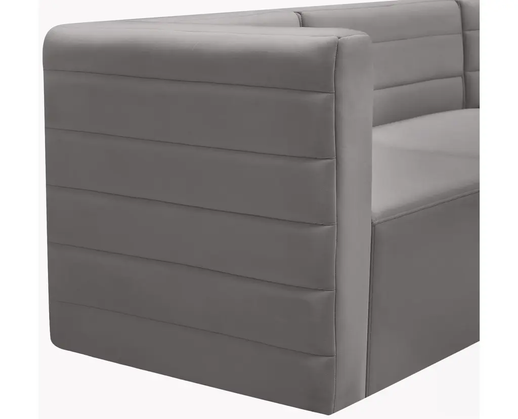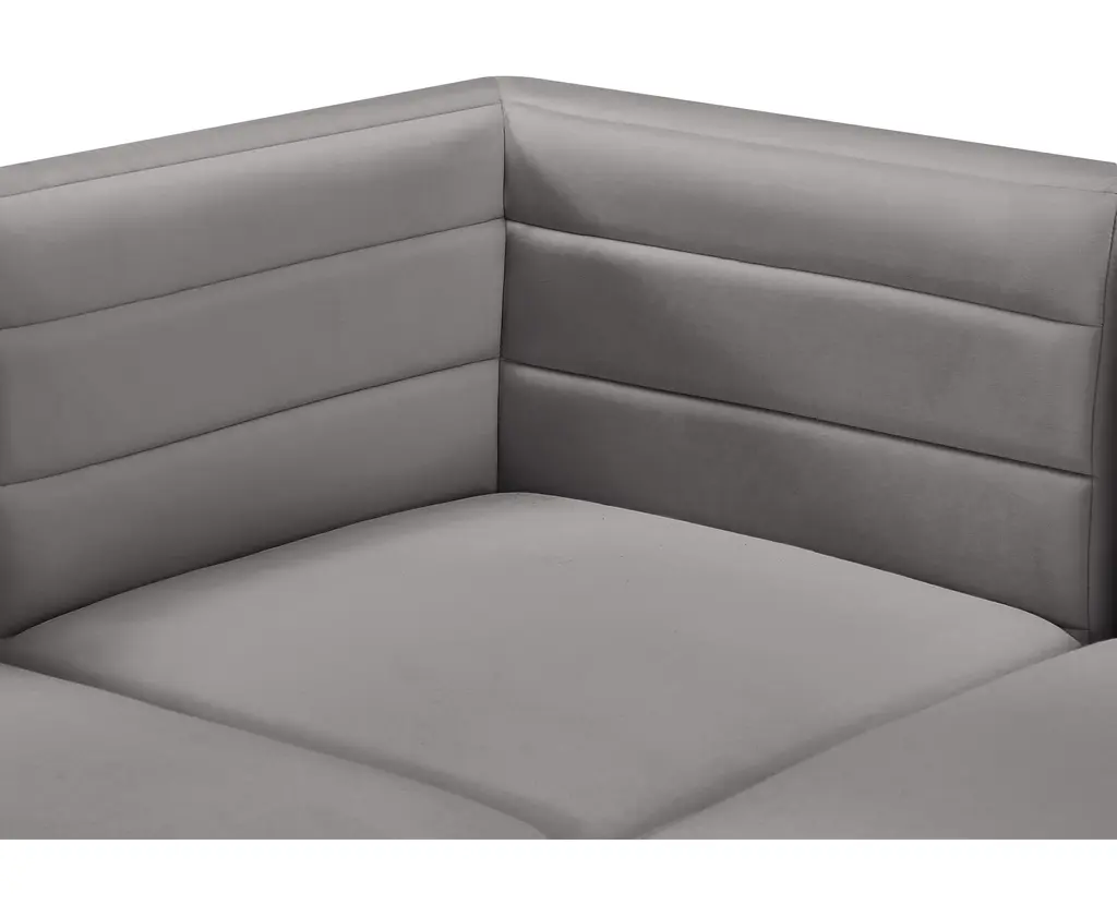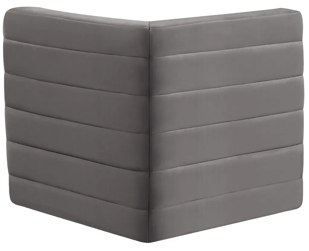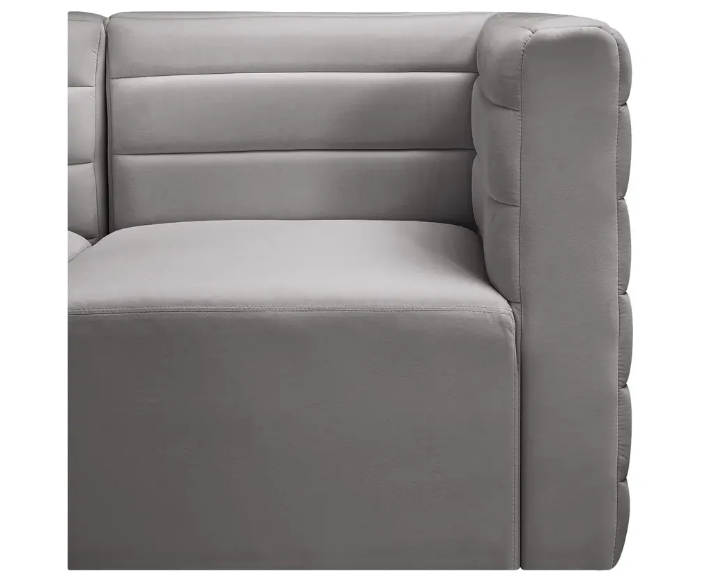 Show them all that less is more with the minimalist look of this Quincy velvet cloud-like comfort modular corner chair. This elegant chair features a simple design that's all about comfort and modern style. The soft grey velvet upholstery is sleek to the touch, and the back of the unit features deep horizontal channel tufting for a look that wows. Because this is a modular seating option, you can pair it easily with other items in the Quincy collection to create a look you love. Latches underneath make it easy to mix and match items from the collection.Overall Product Dimensions: 32" W x 32" D x 31.5" HSoft Grey VelvetDeep Horizontal Channel TuftingModular To Create Infinite ConfigurationsEasily Attach Using Attachment Latch UnderneathContemporary DesignSeat Dimensions:Seat Width: 25"Seat Height: 18"Seat Depth: 25"Arm Height: 30.5"Back Height: 12.5"