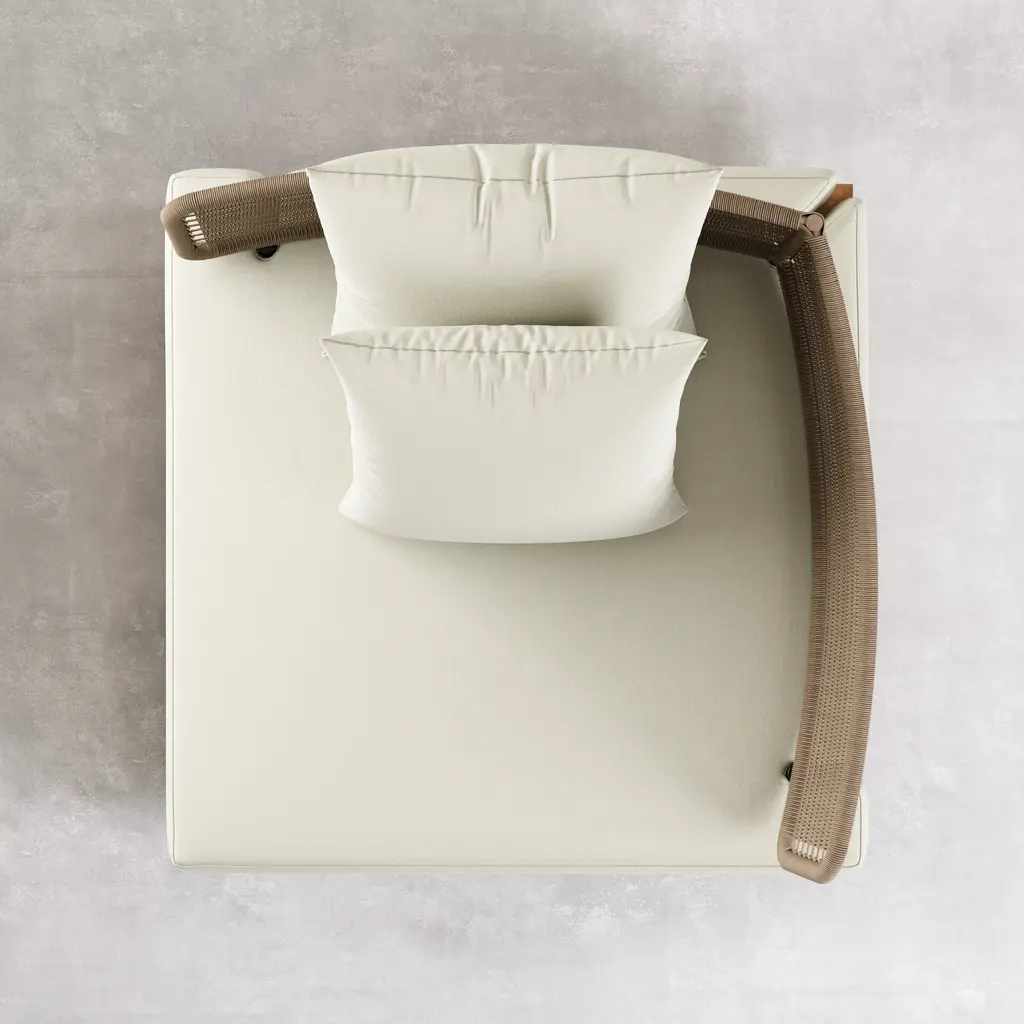 The Valletta sectional (corner piece) is a part of our complete Valletta outdoor set. The base is made from teak wood and the frame is aluminum. With quick-dry foam cushions and our resistant sunbrella fabric, this sofa is as functional as it is chic. Curate your outdoor space with this bespoke set. Our Valletta sofa is easy, breezy, and brimming with sophistication. Dimensions: 37.0''W x 37.0''D x 25.6''H Tear Sheet