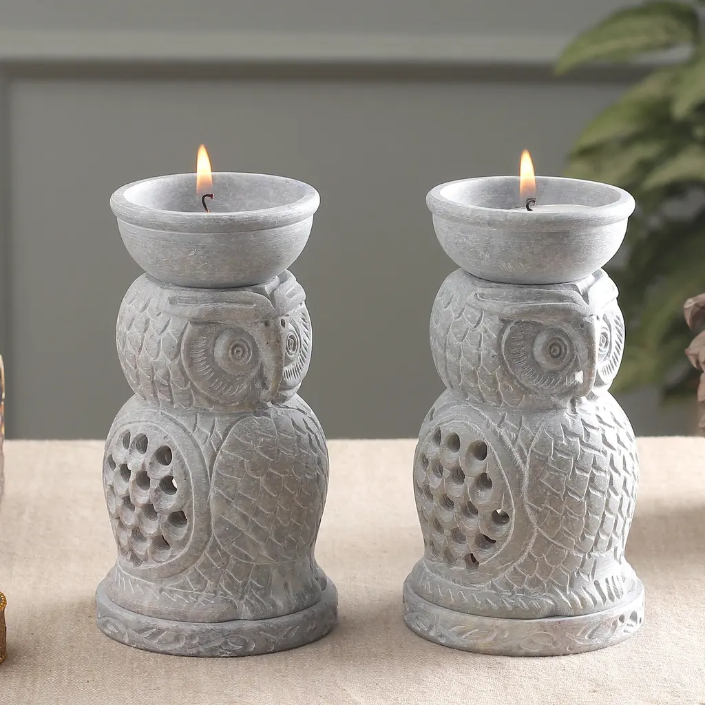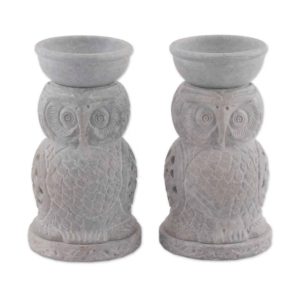 2 Owl-Shaped Jali Openwork Soapstone Oil Warmers From India- Fragrance Of Love