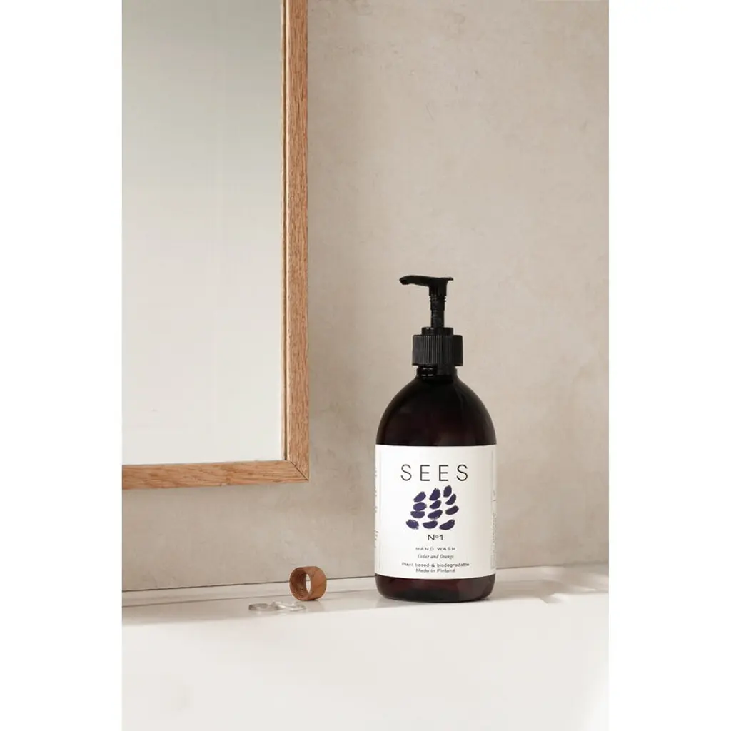 The SEES biodegradable liquid soap No. 1 cleanses and pampers the skin with a thoughtfully crafted blend of essential oils: this eco-friendly hand soap carries the fragrances of woody cedarwood and sweet orange, followed by the calming aromas of lavender and rosemary. Designed for daily handwashing, this gentle liquid soap contains moisturizing glycerin to prevent skin dryness. The soap also effectively removes strong odors like onion and fish, leaving behind a refreshing natural aroma. You can use this biodegradable liquid soap just as easily in the bathroom, kitchen, summer cottage or on outdoor adventures. The SEES Company product range consists of certified, Finnish-made natural cosmetics and home cleaning products, all infused with the natural fragrances of essential oils. All products are vegan and made without animal testing, mineral oils, silicates, or artificial colors or fragrances. Ingredients: Aqua, Cocamidopropyl Betaine, Sodium Coco-Sulfate, Capryl / Capryl Glucoside, Sea salt, Benzoic Acid, Citrus Aurantium Dulcis Oil, Rosmarinus Officinalis Oil, Cedrus Wood Oil, Lavandula Angustifolia Oil, Citric Acid