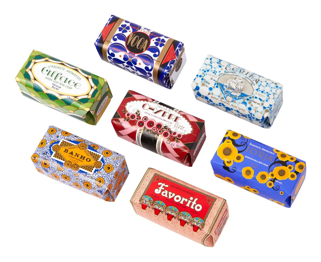 Treat your skin to the enchanting scents of our Claus Porto Bar Soaps. This family-owned brand dates all the way back to the late 1800s, when a pair of German expat entrepreneurs living in Portugal set out to create the country’s first soap and fragrance factory in the historic city of Porto. Fast-forward to today and the company is still there, making their vegetable-based, shea oil-infused soaps the old-fashioned way. Each miniature bar in our collection features a fresh, intoxicating fragrance that will turn a quick wash-up into an indulgent moment. Not to mention their gorgeous paper wrappers, which feature vibrant, Art Deco-inspired designs from the Claus Porto archives. Perfect for gifting or for giving your powder room a chic upgrade, choose from seven captivating scents for a bit of old-school luxury. •100% vegetable base•enriched with shea oil•suitable for all skin types•handmade •2.5"W x 1.75"D x 1"H Banho Citron Verbena •lemon, orange, grapefruit, verbena, lavender, rosemary, mint, basil, musk and vanillaIlyria Honeysuckle•lemon, aldehyde, honeysuckle, jasmine, musk and orange blossomAlface Green Leaf•bergamot, lemon, grapefruit, green leaf, waterlily, neroli, jasmine, cedar, amber and musk Favorito Red Poppy•red berries, green leaves, red roses, patchouli and pepper Voga Acacia Tuberose•fruit accords, mimosa, tuberose and musk Cerina Brise Marine•elemi, sea salt, geranium, pepper, frankincense, cedarwood and sea moss Chypre Cedar Poinsettia•lychee, blackcurrant, mandarin, bergamot, jasmine, rose, apple, cedarwood, peach, leather and vanilla