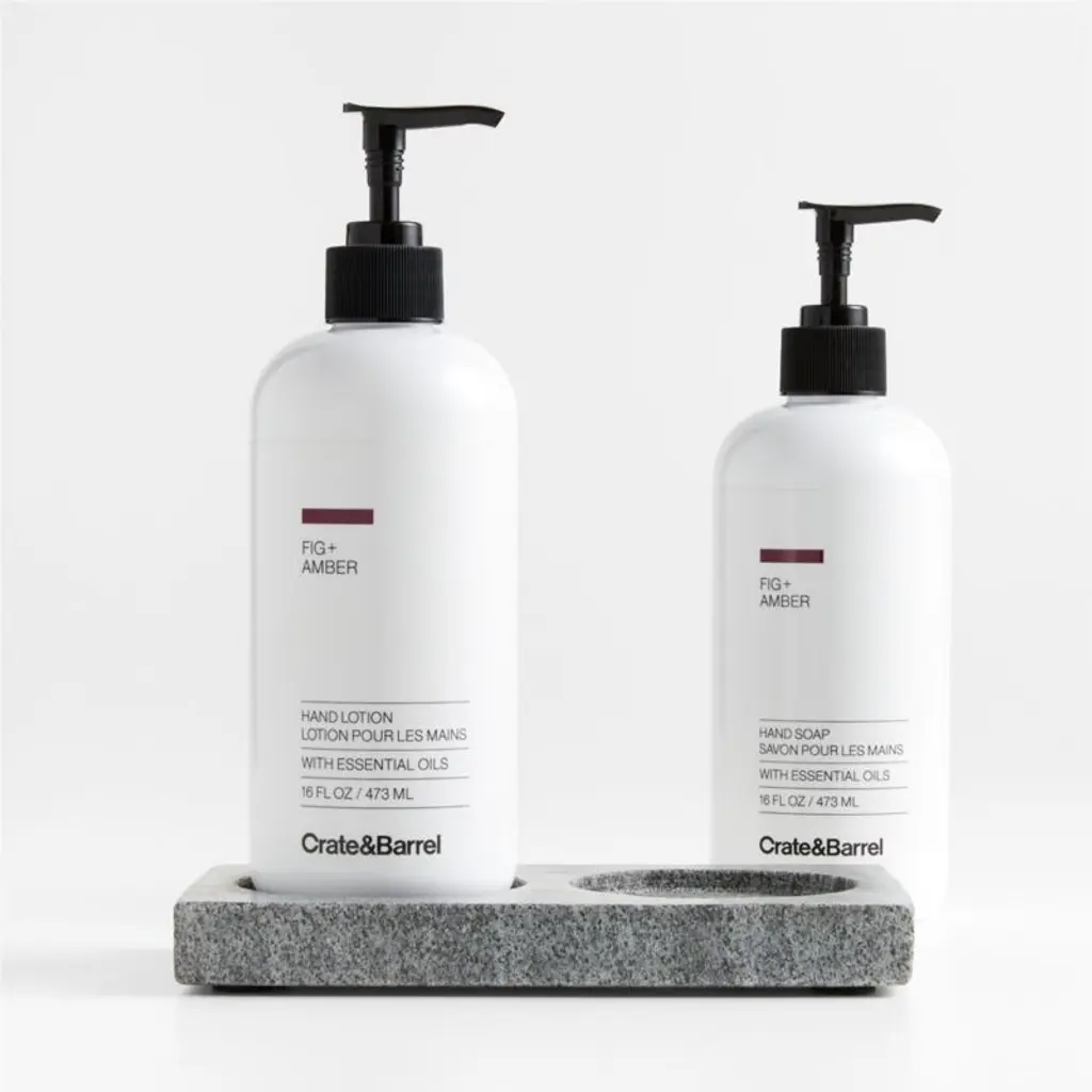 Clean and soothe hands with the rich, sweet fragrances of fig and amber featured in this exclusive three-piece set. The hand soap moisturizes with sunflower seed oil and aloe vera as it cleans, while the hand lotion nourishes with mango seed oil and aloe. Both are made with plant-based formulas scented with essential oils that leave behind a fresh, clean aroma of bergamot, lemon, jasmine and amber against a backdrop of fruity fig. Cut, finished and polished by hand, the black marble caddy keeps the bottles right at hand while looking neat and stylish.View all "The Kitchen by Crate" collection