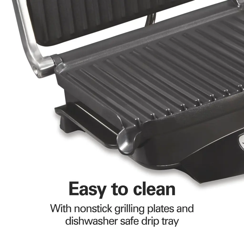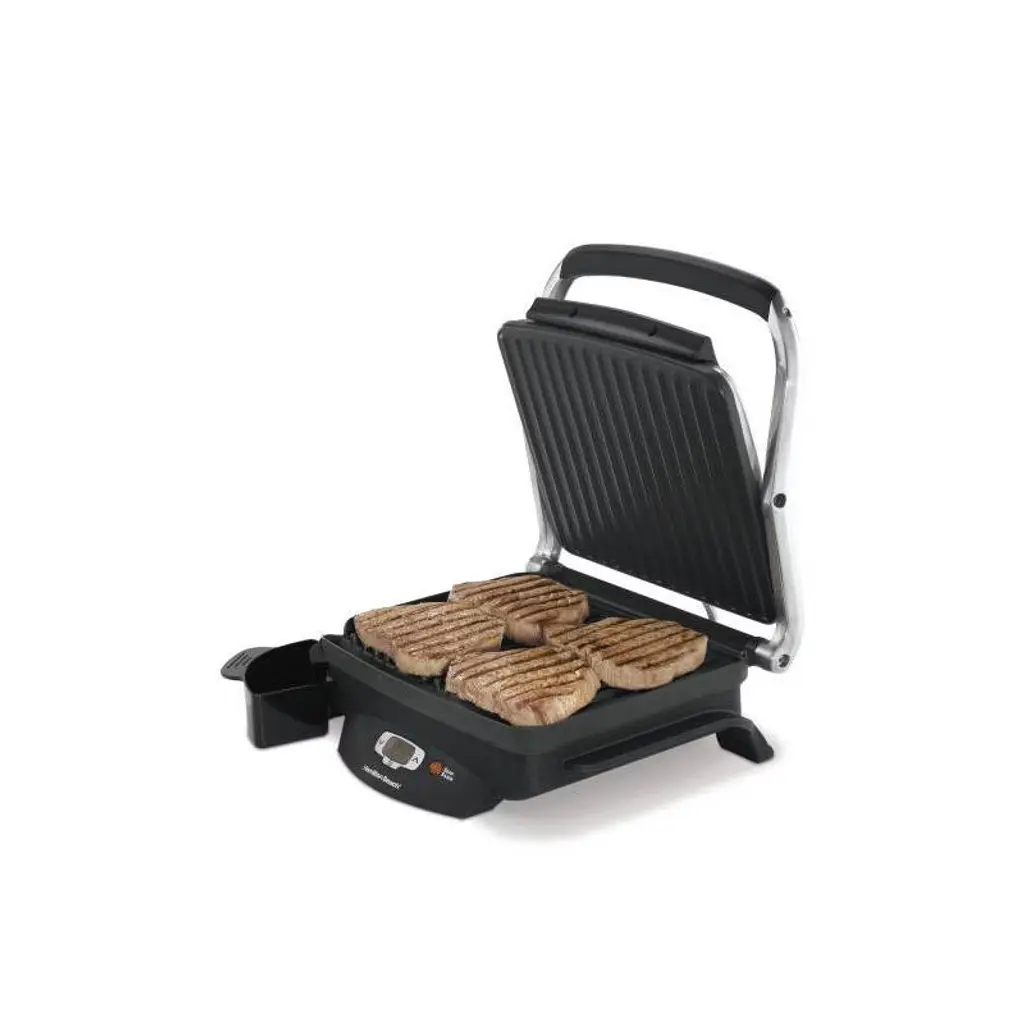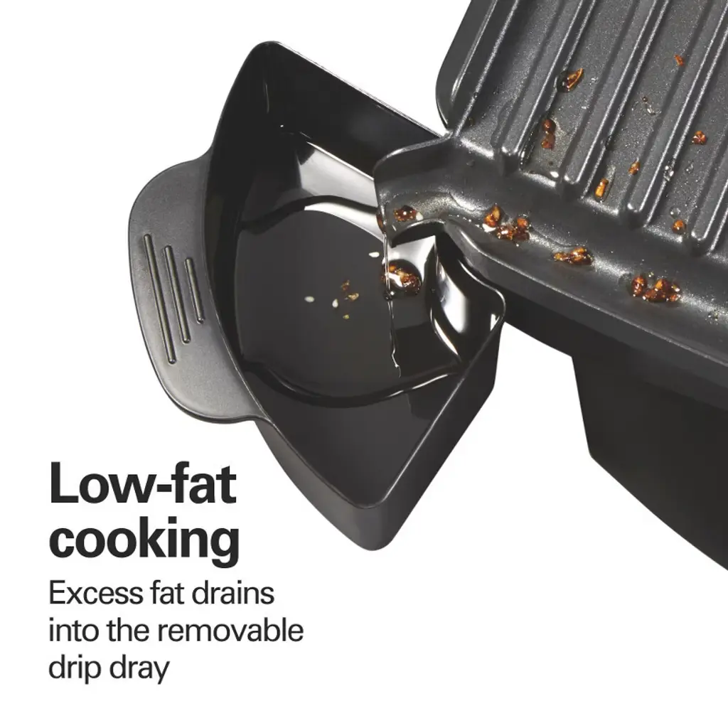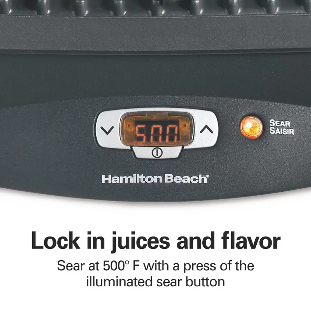 With the Hamilton Beach® Steak Lover's Indoor Grill, there’s no need to fire up an outdoor grill to get great grilled flavor. It features a high searing temperature of 500°F that locks in juices and flavor and makes everything you sear — steaks, burgers, fish, chicken and pork chops — taste delicious. Best of all, food won't stick to the grilling plate since it has a nonstick coating. This grill has an illuminated sear button to make searing easy. Just press the button, and the grill sears at 500°F (260°C) then switches to your selected grilling temperature. The 100 sq. in. nonstick cooking surface has plenty of space for cooking a variety of meats and veggies. You'll get quick, delicious meals on the table in less than 10 minutes. As you grill, fat is directed by the cooking surface away from your food into the removable drip tray. The grill is easy to clean. Simply wipe the PFAS-free ceramic nonstick plates clean after they cool. The removable drip tray is dishwasher safe. Besides meat and vegetables, the grill is great for making hot sandwiches like paninis and grilled cheese with a crispy finish.