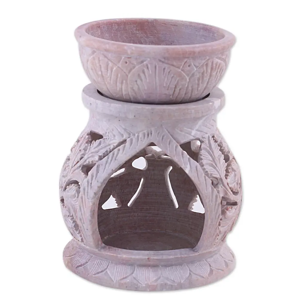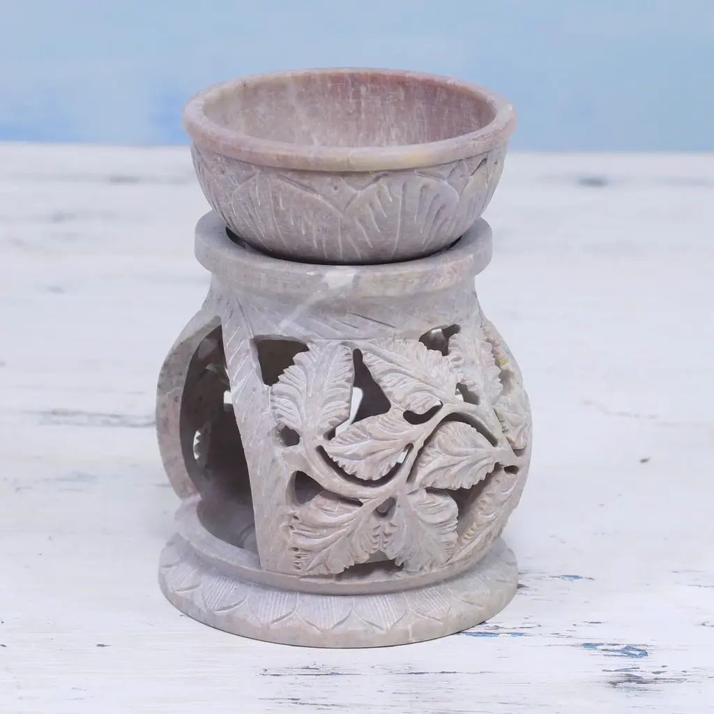Handcrafted Leaf Motif Soapstone Oil Warmer From India- Garden Of Leaves