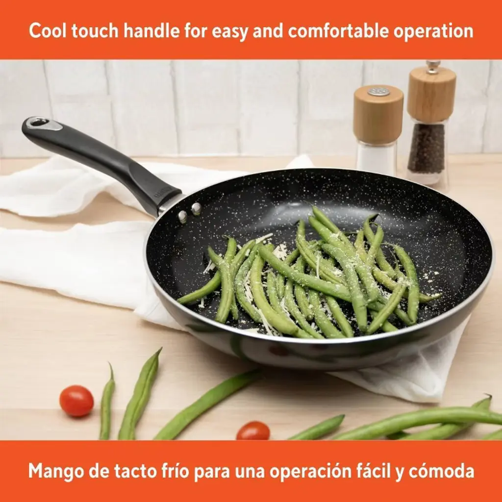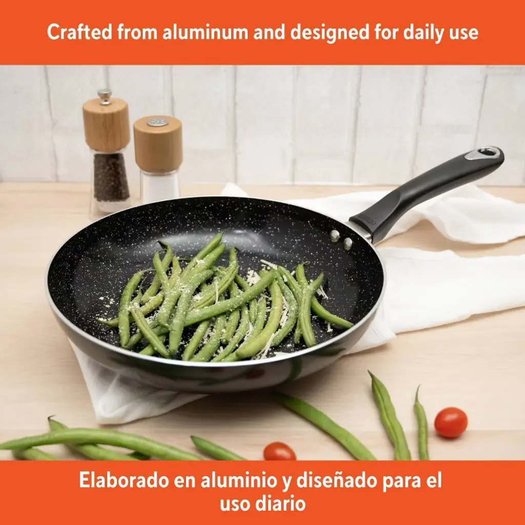 The IMUSA 10” Bistro Ceramic Fry Pan is a compact yet powerful tool for everyday cooking. Crafted from durable aluminum with a black speckled ceramic nonstick coating and sleek black exterior, it ensures effortless food release and healthier meals. The cool-touch handle offers comfort and control during use, making it perfect for pan frying, stir frying, sautéing meat, fish, eggs, and more. Ideal for dry heat cooking, this fry pan is a must-have for quick, delicious meals at home. Trust the IMUSA 10” Bistro Ceramic Fry Pan for balanced, home-cooked meals. It will surely become your kitchen's beloved companion, uniting tradition and innovation in every delectable creation and elevating your culinary experience.