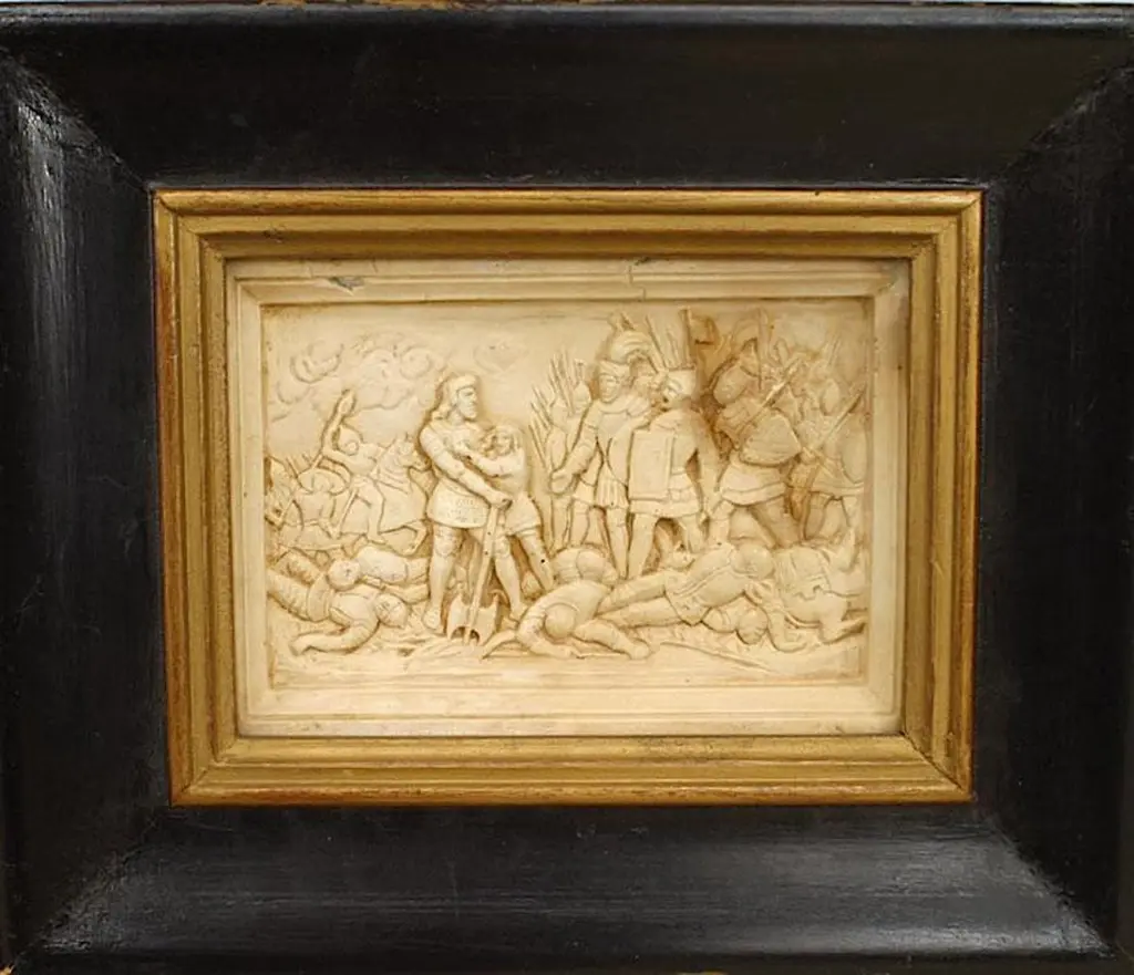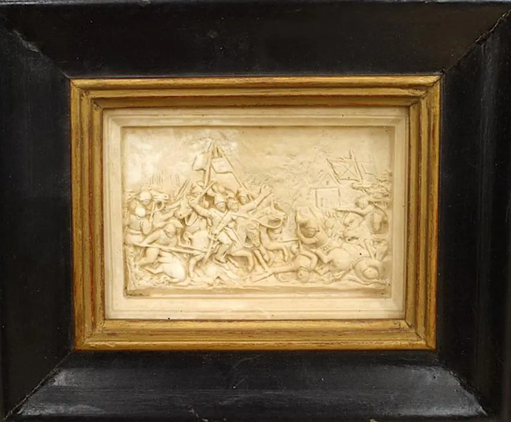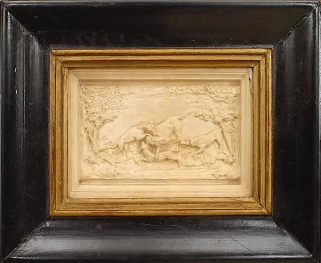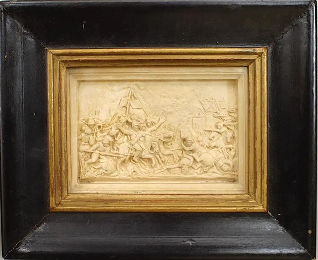 4 Italian Renaissance style (19th Century) carved soapstone wall plaques of Medieval scenes under glass in black frames.