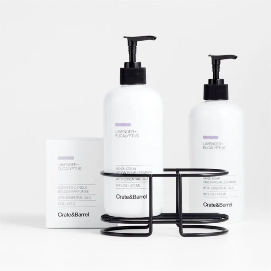 Fill your kitchen with the herbal fragrances of lavender and eucalyptus showcased in this four-piece gift set. Our hand soap moisturizes with sunflower seed oil and aloe vera as it cleans, while the hand lotion boasts mango seed oil and aloe. Along with the long-burning candle, they leave behind a fresh, clean aroma of geranium, lavender, vetiver and eucalyptus against a backdrop of zesty citrus. Echoing the enticing smells of baking and cooking, our exclusive kitchen scent collection features plant-based formulas with deliciously fragrant combinations of essential oils. The matte black caddy keeps the bottles corralled right where they're needed, and our signature black-and-white design looks crisp and modern on the counter.View all "The Kitchen by Crate" collection