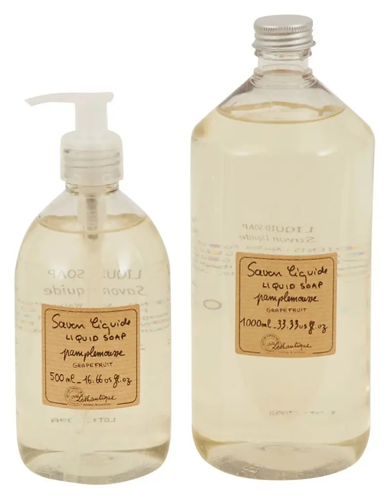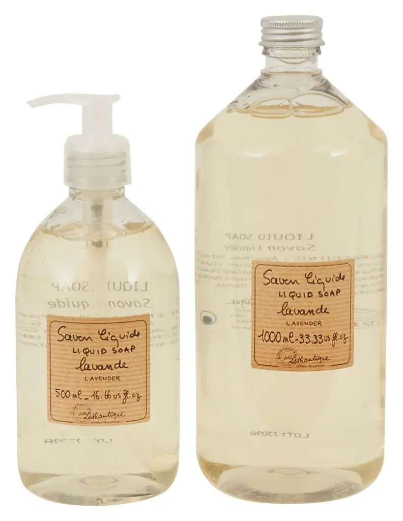 Clean up with our Lothantique Liquid Soaps. Inspired by the soap-making traditions of Marseille, these luxe liquid soaps are carefully crafted from a natural vegetable-based formula, scented with beautifully simple fragrances inspired by the French countryside. Perfect for bringing a piece of old-world Provence to your handwashing, keep a bottle sitting sinkside in the kitchen or powder room. •vegetable based formula •marseille style •sodium lauryl sulphate and paraben free •france Dimensions •soap: 16.66 oz •refill: 33.33 oz