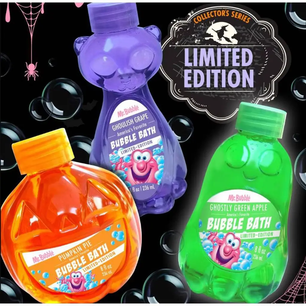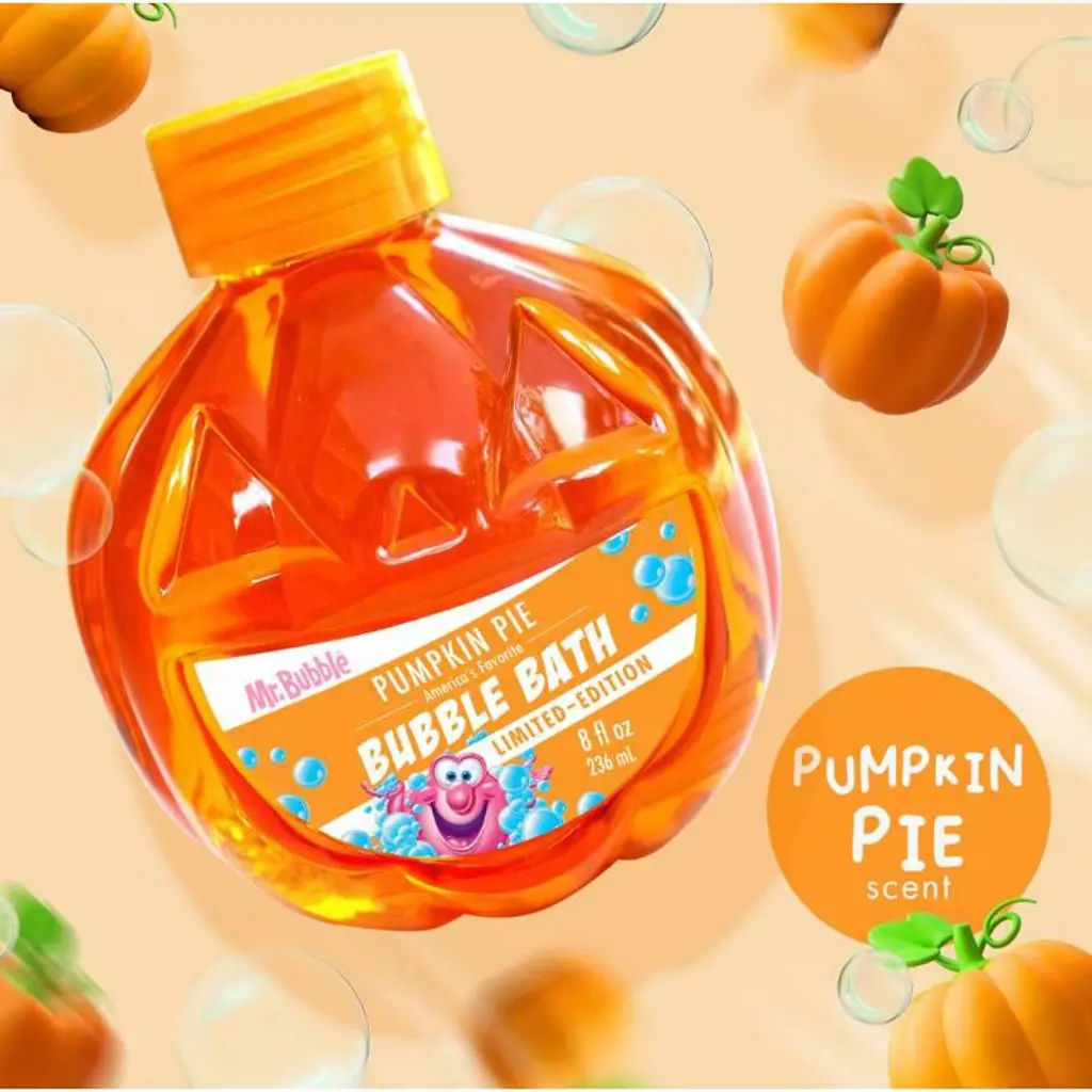 Make bath time a treat! Mr. Bubble Pumpkin Pie Bubble Bath comes in a festive pumpkin-shaped orange bottle filled with cozy pumpkin pie scent. Just a splash creates mountains of bubbles for sweet, seasonal fun. Limited edition and only here for fall!