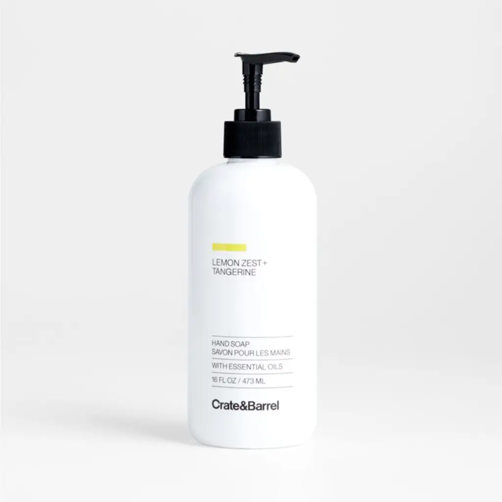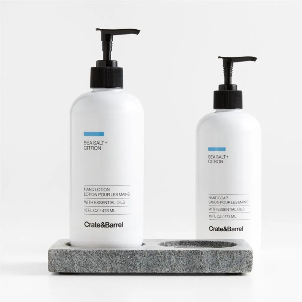 Clean and soothe hands with the fresh, clean fragrances of sea salt and citron featured in this exclusive three-piece set. The hand soap moisturizes with sunflower seed oil and aloe vera as it cleans, while the hand lotion nourishes with mango seed oil and aloe. Both are made with plant-based formulas scented with essential oils that leave behind the invigorating aromas of lemon and bergamot against a backdrop of floral and earthy scents. Cut, finished and polished by hand, the black marble caddy keeps the bottles right at hand while looking neat and stylish.View all "The Kitchen by Crate" collection