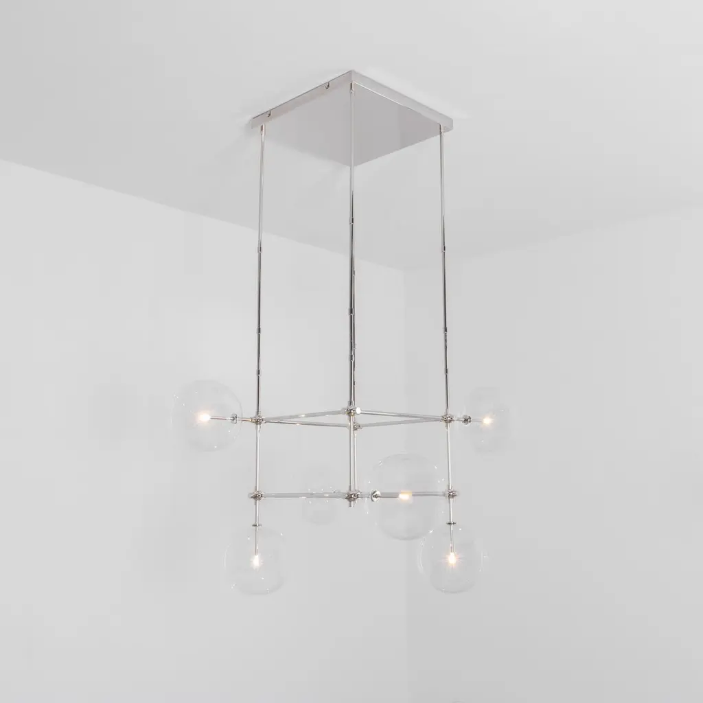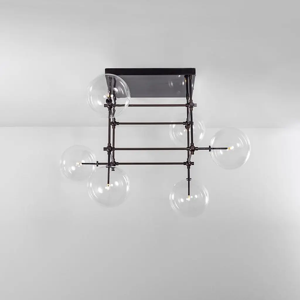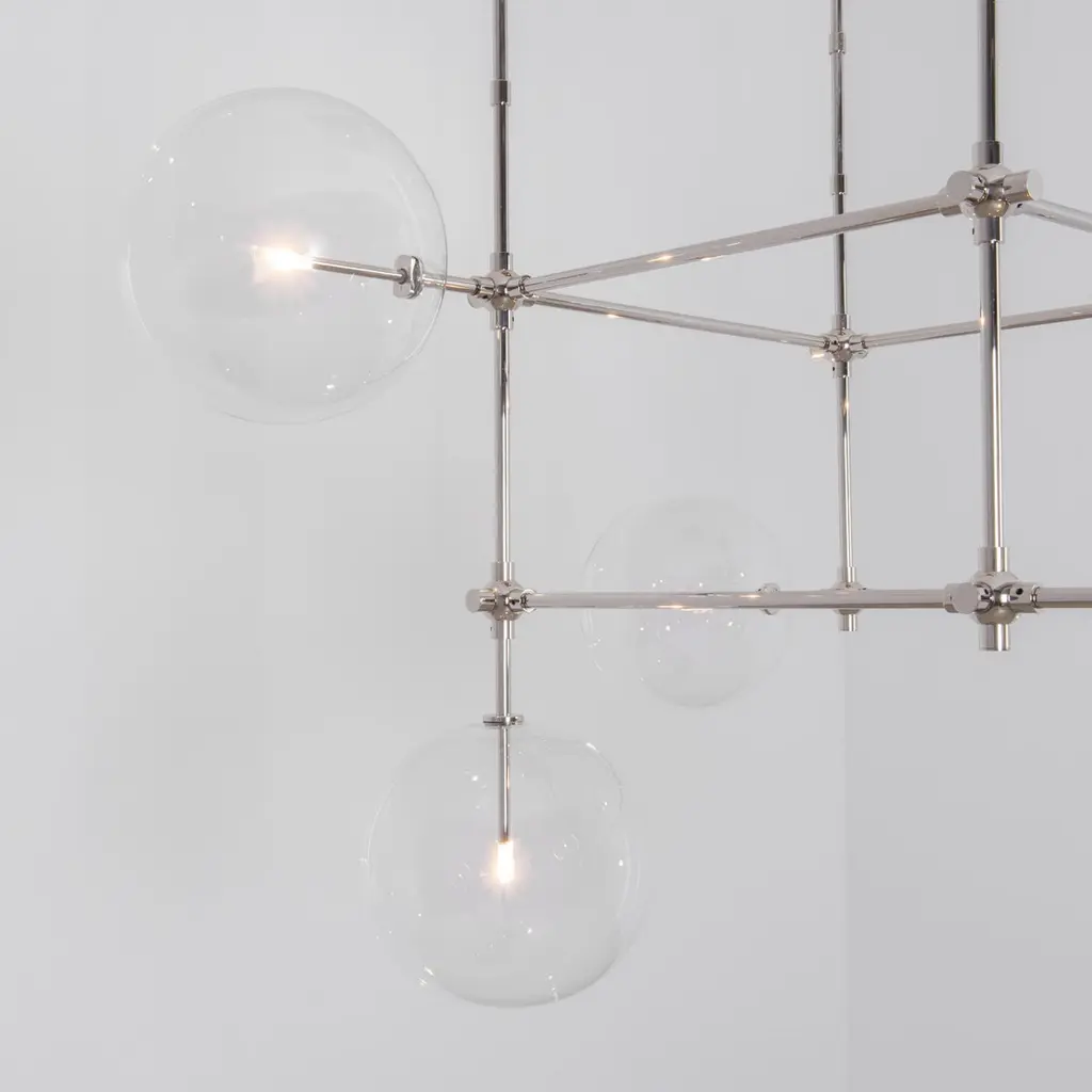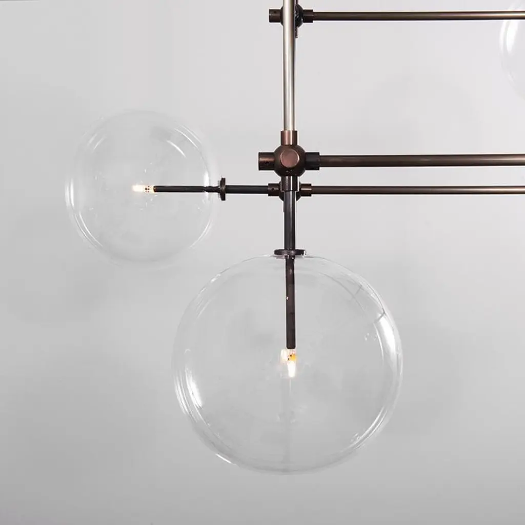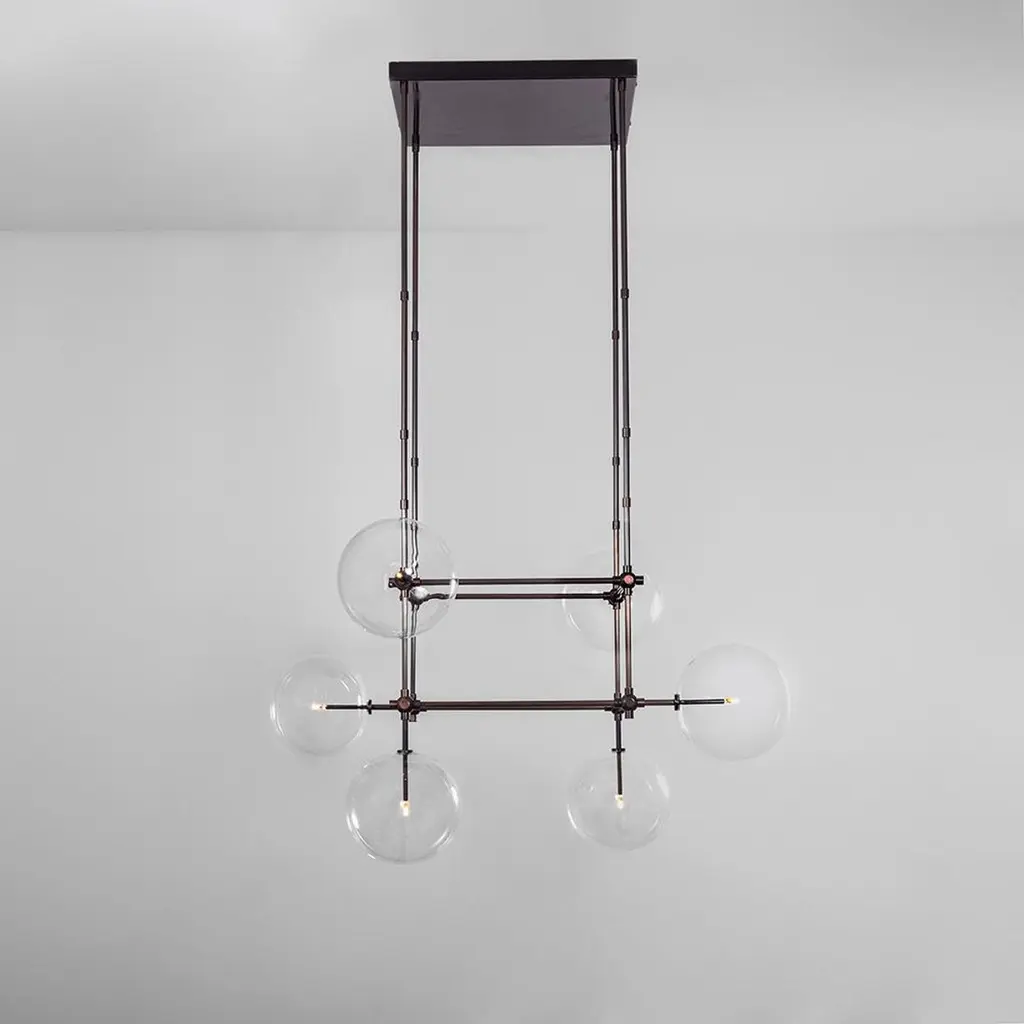 Black Gunmetal 6 arm sculptural Chandelier by SchwungDimensions: D 117.4 x W 117.4 x H 173.1 cmMaterials: Solid brass, hand-blown glass globesFinish: Black Gunmetal.Also available in finishes: Natural Brass or Polished Nickel. All our lamps can be wired according to each country. If sold to the USA it will be wired for the USA for instance. Made entirely of solid brass and handblown glass globes. Extension Rods included. Could be dimmable. Heights available: 83.1 cm, 98.1cm or 128.1 cm. Schwung is a german word, and loosely defined, means energy or momentumm of a positive manner. Synonyms: Verve, zest, panache, momentum.Mission:Developing lighting fixtures through simple and timeless materials, sustainably; we are committed to creating quality products that last. Beginning with the design we are constantly refining aesthetic and function. Both in the lamps themselves and throughout the manufacturing process we pursue a holistic approach to efficiency, and the reduction of environmental impact.Concept:Schwung is a lighting concept, connecting aesthetic and quality through matter. An exploration of history, forms and function, elegantly fulfilling an essential need of modern life, capturing light. Our pieces play with architecture or create spaces of their own. Founded by Dominique sente (Belgium) and rudi nijssen, (Netherlands). What began as a curiosity for objects, a venture in collecting, curating and trading antiques-became a passion to create original designs.Process:From the beginning, schwung home has striven for cutting-edge and quality lighting, handcrafted in Europe. Emphasizing brass and glass, which are not only durable but can be reused indefinitely, our lamps are 98% recyclable. Today the company operates out of an integrated design and manufacturing facility in Poland. This local approach allows us to significantly shorten the product lead time and greatly improve quality standards.All our lamps can be wired according to each country. If sold to the USA it will be wired for the USA for instance.