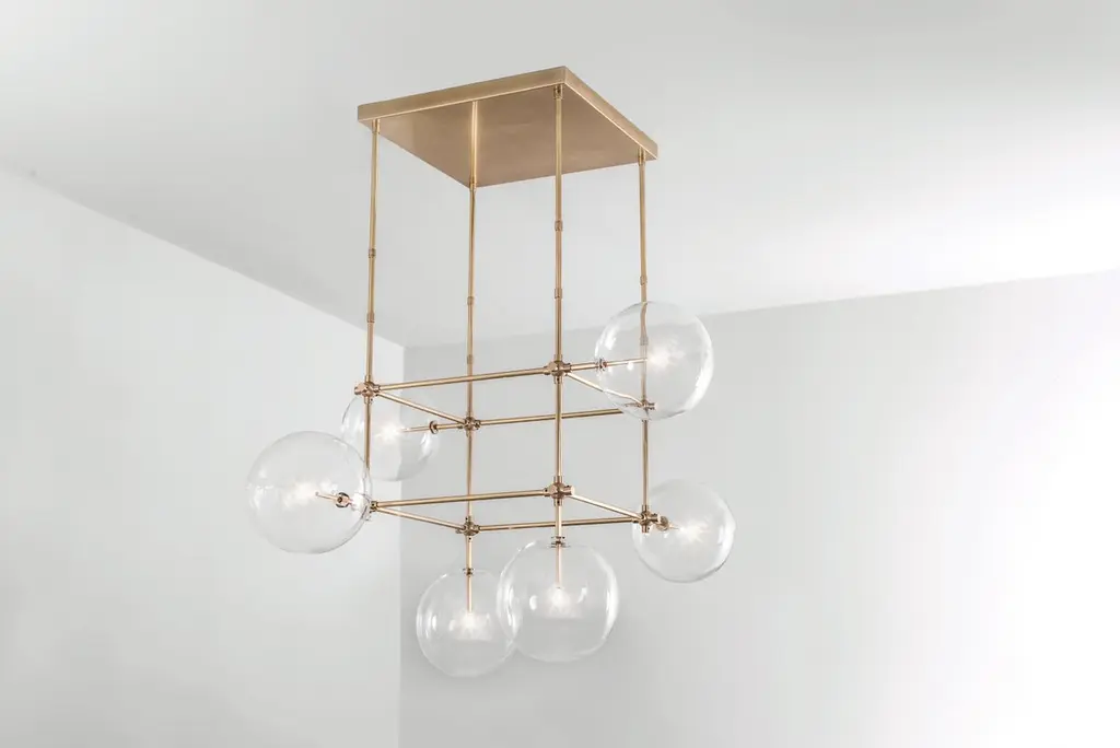 Brass 6 arm sculptural chandelier by SchwungDimensions: D 117.4 x W 117.4 x H 173.1 cmMaterials: Solid brass, hand-blown glass globesFinish: natural brass.Also available in finishes: black gunmetal or polished nickel.All our lamps can be wired according to each country. If sold to the USA it will be wired for the USA for instance. Made entirely of solid brass and handblown glass globes. Extension Rods included. Could be dimmable. Heights available: 83.1 cm, 98.1cm or 128.1 cm. Schwung is a german word, and loosely defined, means energy or momentumm of a positive manner. Synonyms: Verve, zest, panache, momentum.Mission:Developing lighting fixtures through simple and timeless materials, sustainably; we are committed to creating quality products that last. Beginning with the design we are constantly refining aesthetic and function. Both in the lamps themselves and throughout the manufacturing process we pursue a holistic approach to efficiency, and the reduction of environmental impact.Concept:Schwung is a lighting concept, connecting aesthetic and quality through matter. An exploration of history, forms and function, elegantly fulfilling an essential need of modern life, capturing light. Our pieces play with architecture or create spaces of their own. Founded by Dominique sente (Belgium) and rudi nijssen, (Netherlands). What began as a curiosity for objects, a venture in collecting, curating and trading antiques-became a passion to create original designs.Process:From the beginning, schwung home has striven for cutting-edge and quality lighting, handcrafted in Europe. Emphasizing brass and glass, which are not only durable but can be reused indefinitely, our lamps are 98% recyclable. Today the company operates out of an integrated design and manufacturing facility in Poland. This local approach allows us to significantly shorten the product lead time and greatly improve quality standards.All our lamps can be wired according to each country. If sold to the USA it will be wired for the USA for instance.