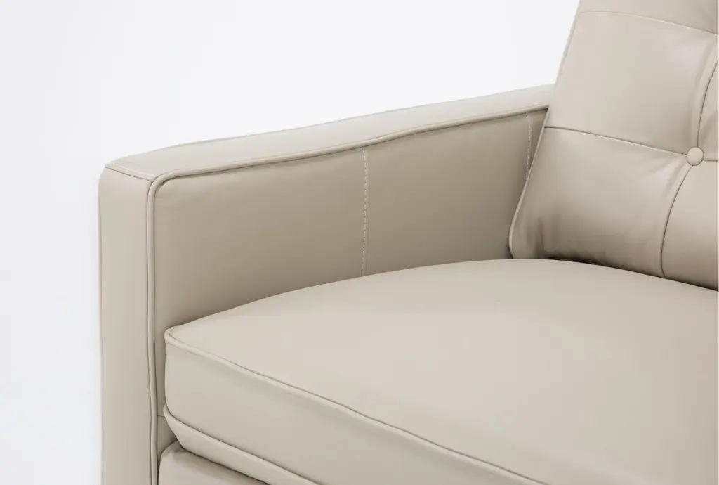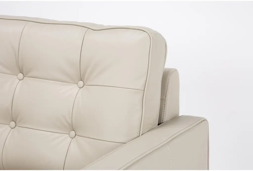 Introducing the Grayson Natural Taupe/Beige Leather 2 Piece Tufted Sofa & Arm Chair Set, a perfect addition to your living room. This mid-century modern set features a sofa and armchair, both upholstered in luxurious Alaska Ivory leather. The tufted design and straight arms add a touch of sophistication to any space.