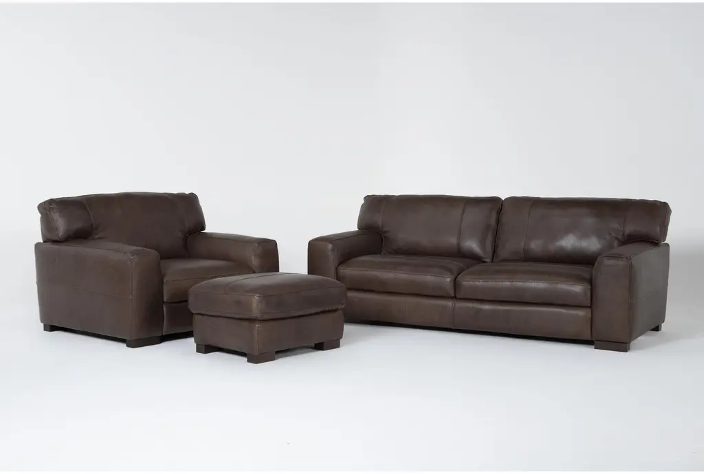 The Grisham Brown 100% Top Grain Italian Leather 4 Piece Sofa Loveseat Oversized Arm Chair & Ottoman Set brings a rustic charm to your living room. Upholstered in rich chestnut-colored top grain leather, this set offers a soft comfort level and a timeless appeal. It's perfect for creating a cozy and inviting atmosphere in your family room or common area.