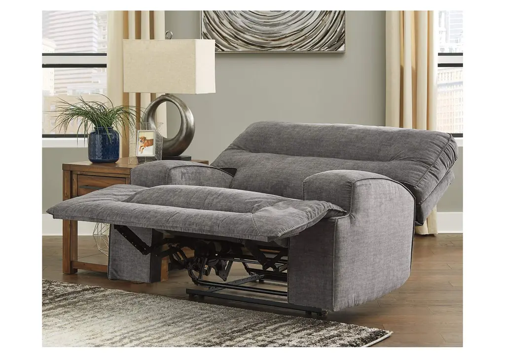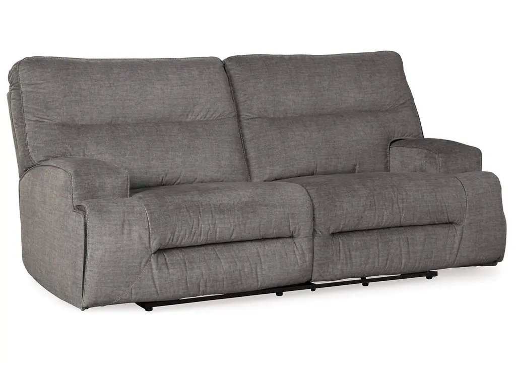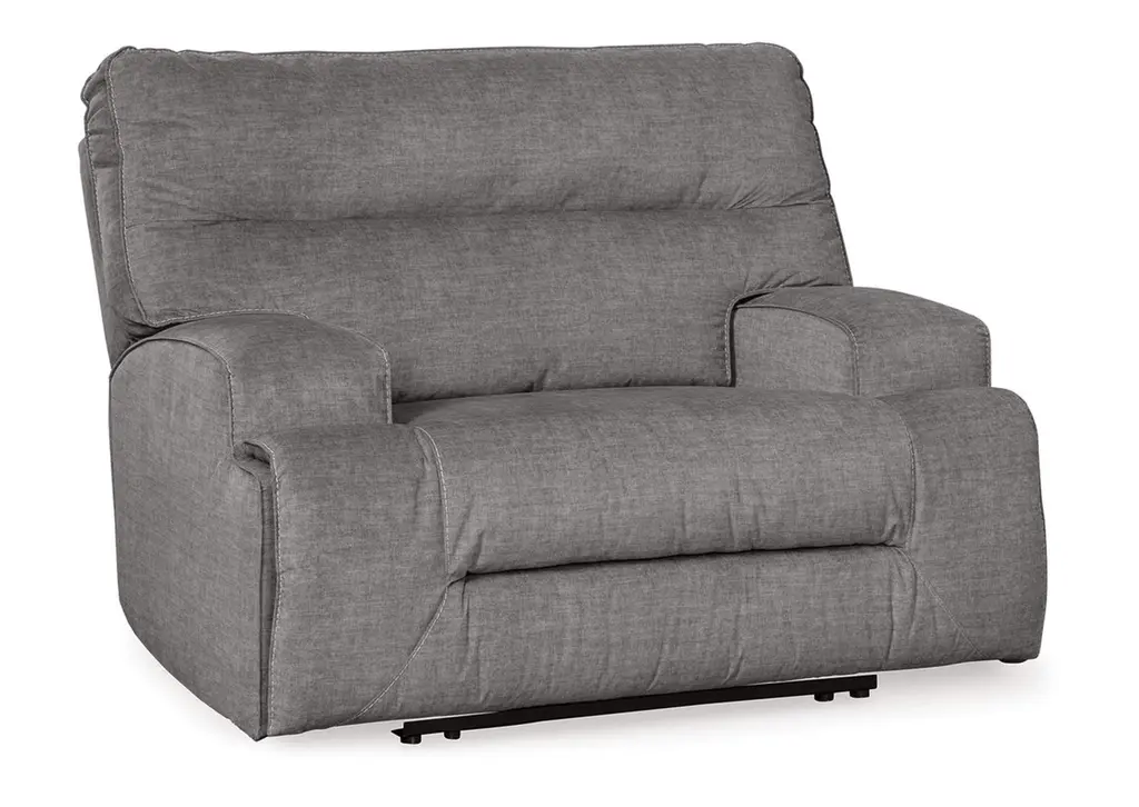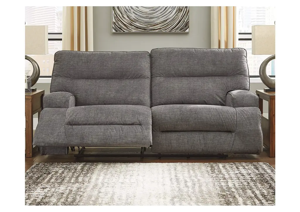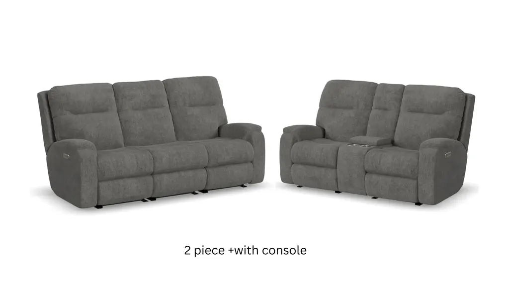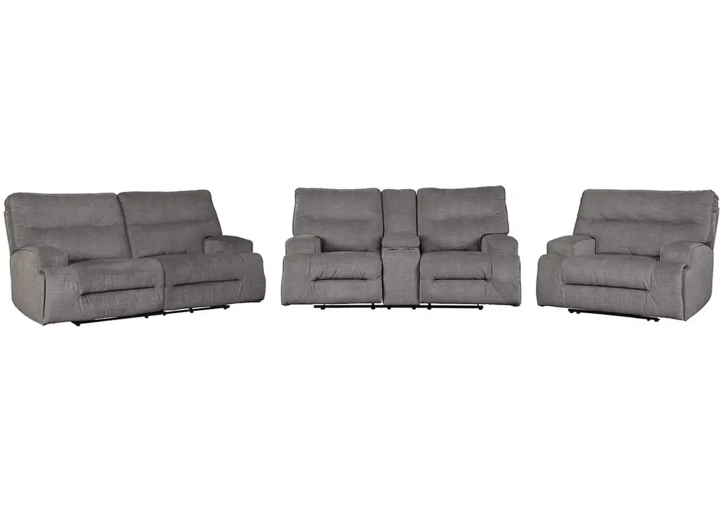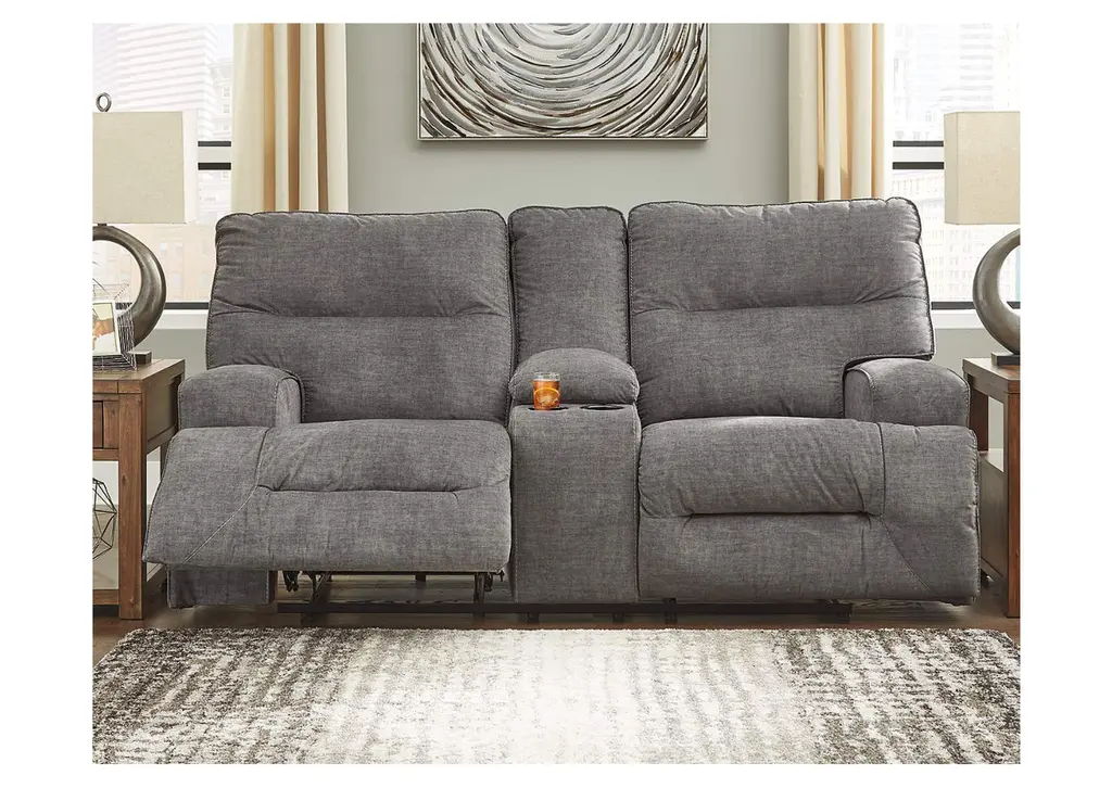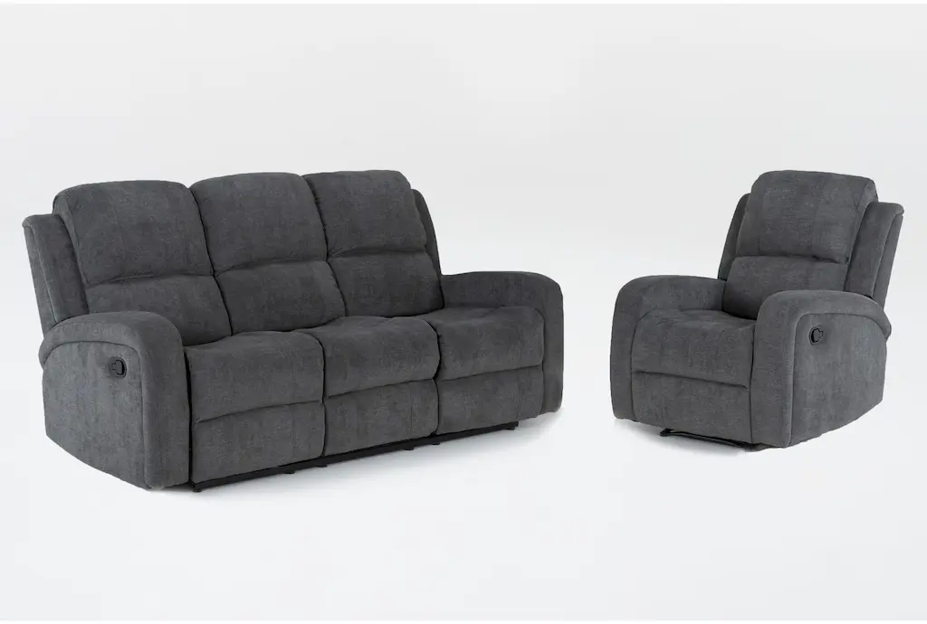 This dual-sided reclining sofa, double reclining loveseat with console, and wide seat recliner set makes it hip to be square. Brilliantly boxy profile and wide track arms infuse a highly contemporary look you don’t often find in reclining furniture. Rest assured, the trendy charcoal-tone upholstery is sumptuously soft—and made all the more enticing with deep channel tufting for clean-lined flair. Dual cup holders and storage in the center console of the loveseat are a mighty handy touch.