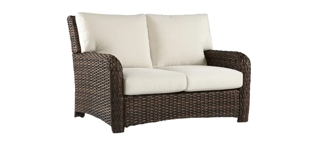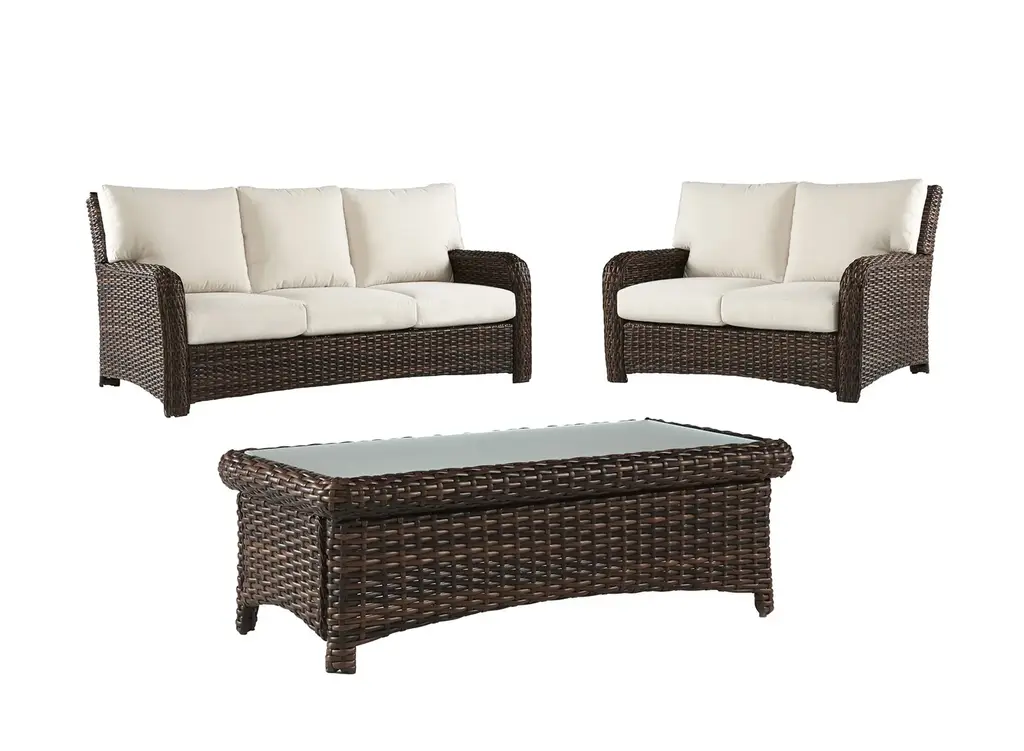 Timeless appeal meets a clean, modern aesthetic in the St Tropez 3-pc. Outdoor Living Outdoor Sofa Set. The perfectly proportioned Saint Tropez Collection features rustproof aluminum framing. Mold and mildew resistant cushion cores are layered, high-density poly fiber and dry conjugate blend. Each seat has an independent suspension. Crafted with high-density polyethylene synthetic wicker,handwoven over fully-welded powder-coated aluminum framing. Included in this set is a loveseat, sofa and a coffee table.