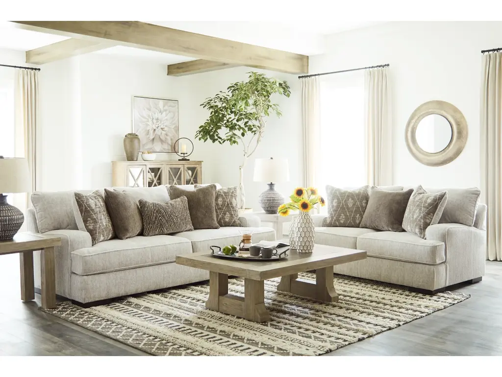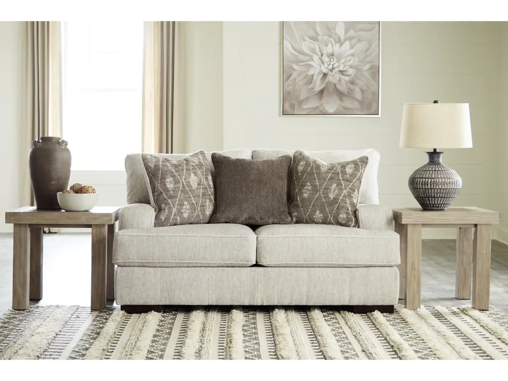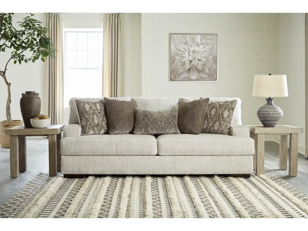 Decidedly modern with a sense of relaxed ease, the Alesandra sofa and loveseat package looks at home in so many different places and spaces. Providing a highly distinctive look: substantial track arms with curved cornering, wrapped t-cushions and low-to-the-floor block feet in a warm wood-tone finish. Sporting a subtle chevron texture, the parchment-tone upholstery takes neutral to new heights.
