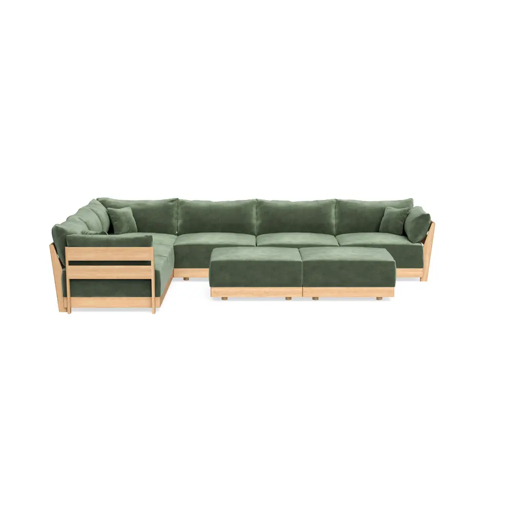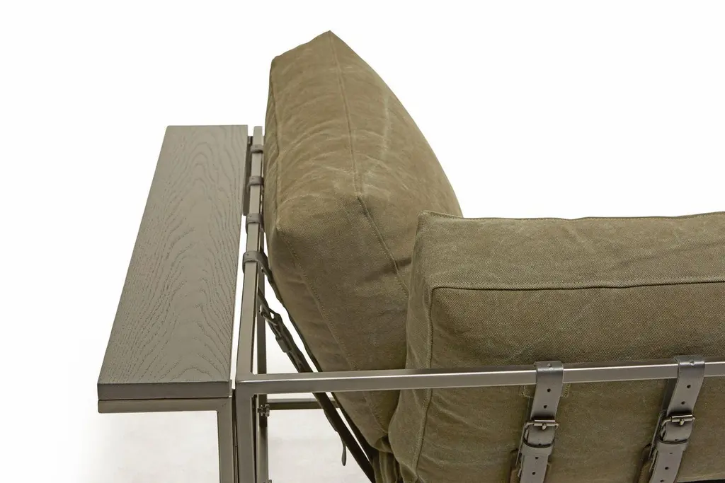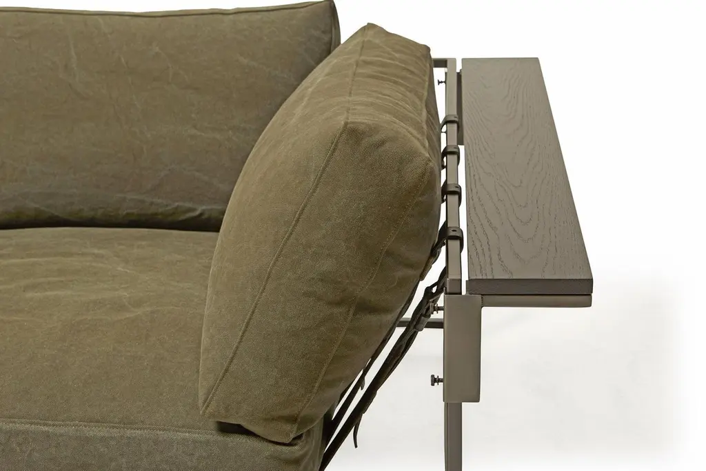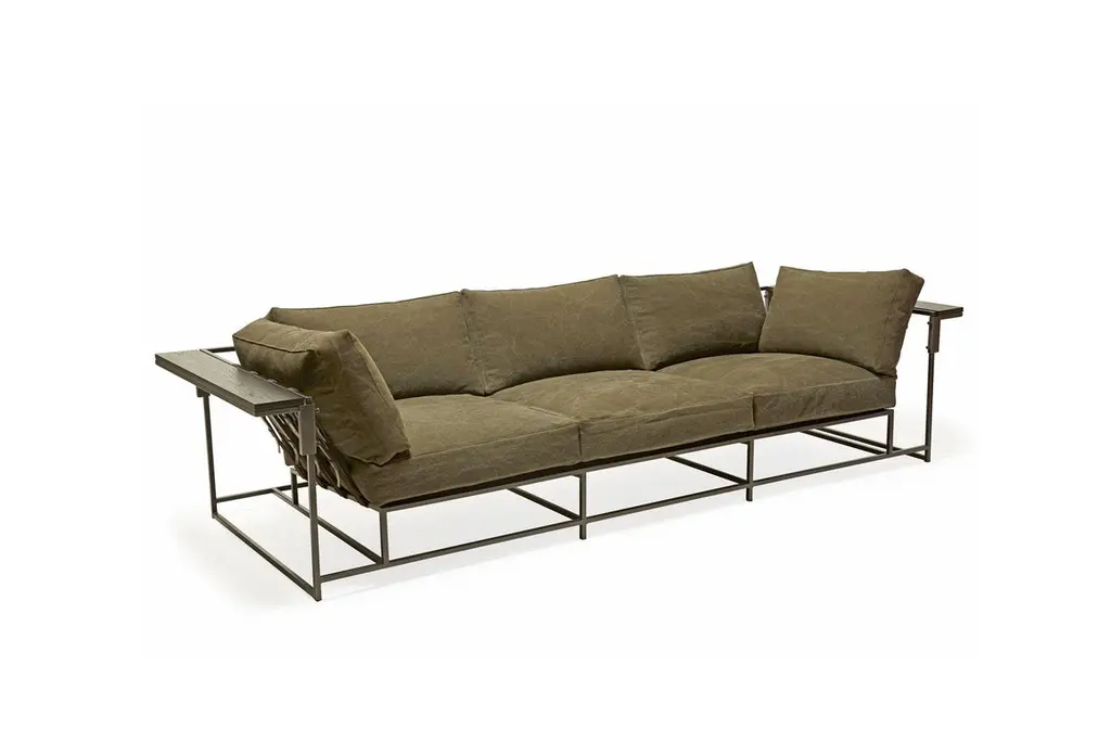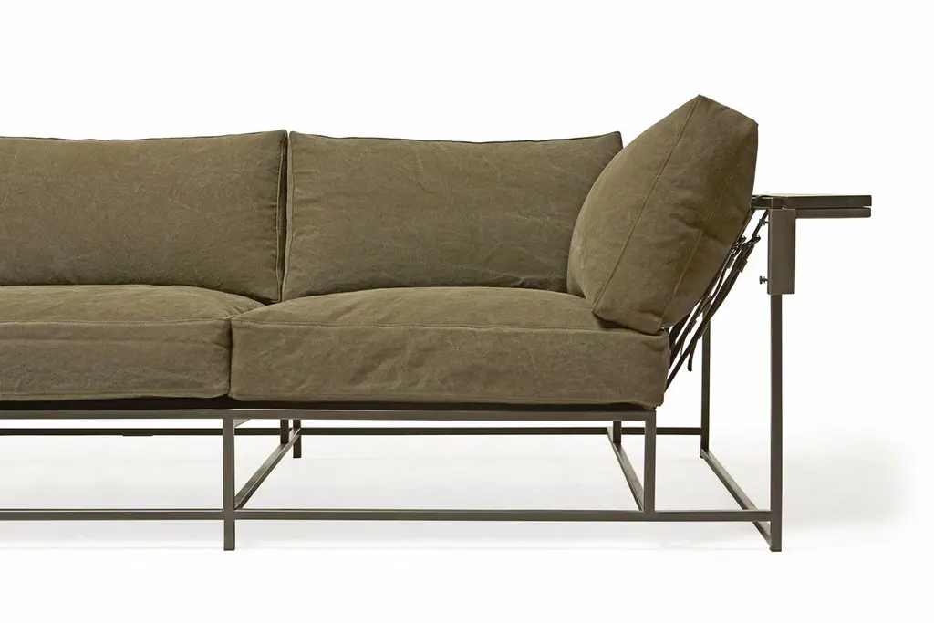 This Sofa set from the Stephen Kenn Inheritance Collection was designed for maximum comfort and functionality.The Sofa was originally conceived in 2011 as the first piece in The Inheritance Collection. Beginning from a place of curiosity about how furniture was constructed, the Inheritance Collection is a result of reimagining typical upholstered seating. The Sofa is paired with a large, deep Ottoman to allow for comfortable lounging. The set is upholstered in a heavy-weight olive deadstock canvas with beautiful shade variation for visual depth. Sitting atop blackened steel frames, the traditional foam seat cushions have been wrapped in polyfiber for a plush seating experience. The sofa features exposed support belts with tonal olive webbing, black leather straps, and blackened steel buckles.The sleek arms of the Sofa are finished with removable Wing Tables on either end in a matching blackened steel frame finish and ebonized oak tabletop. The Wing Tables clip to the arm as a convenient surface for a drink or a book.This set contains 1 Sofa, 2 Wing Tables and 1 Ottoman.Every Stephen Kenn piece is made to order through our Los Angeles studio. We create these pieces utilizing a number of small businesses and fabricators in the LA area. We welcome inquiries about custom dimensions or custom material combinations to best fit your space and personal aesthetic.