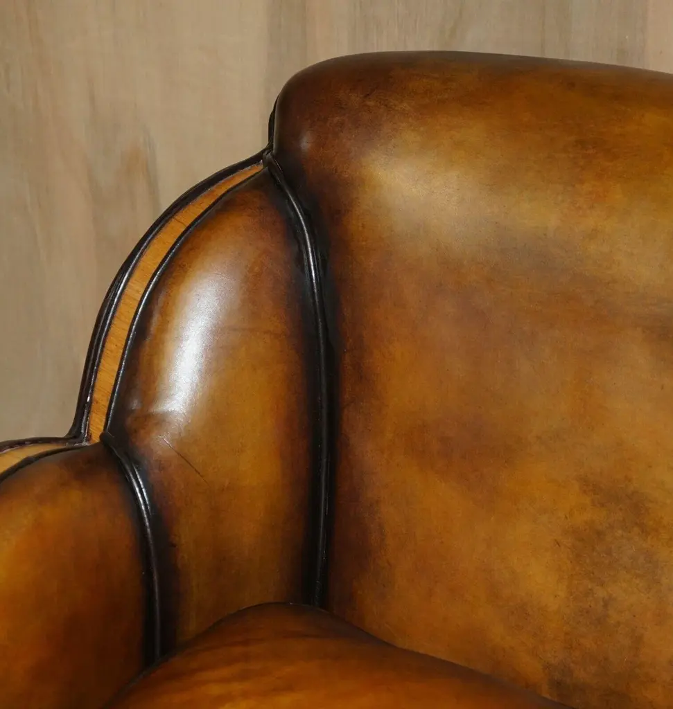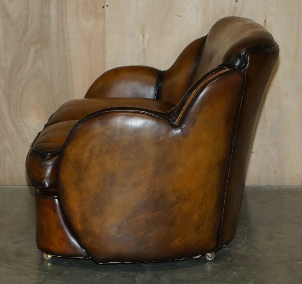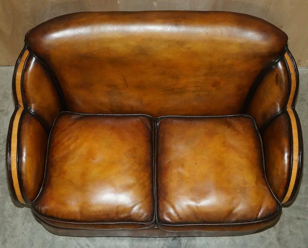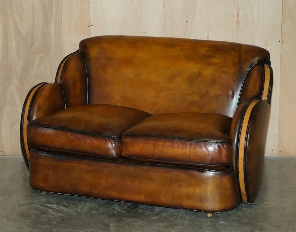 Royal House AntiquesRoyal House Antiques is delighted to offer for sale this 1 of 2 of very rare Harry & Lou Epstein Art Deco two seat Cloud sofas with Birch frames and one of a kind, hand dyed brown leather upholstery.Please note the delivery fee listed is just a guide, it covers within the M25 only for the UK and local Europe only for international, if you would like an accurate quote, please send me your postcode and I’ll provide you with the exact price.This sale is for one sofa with the option to purchase the pairA very stylish and decorative sofa. The birch panels have a sublime colour which is very rich. The lines, form and general look is all very Art Deco, this pair would look charismatic in any setting.The sofa has been fully restored to include being hand dyed six times, antiqued, sealed, waxed down and then polished, there are only two sofas in the world with this exact colour finish and they are available here to purchaseSofa dimensionsHeight:- 81.5cmWidth:- 134cmDepth:- 90.5 cm#RPlease note all measurements are taken at the widest point, if you would like any additional or specific measurements please ask.Any questions please feel free to ask before you bid. ConditionPlease view the very detailed pictures as they form part of the description around conditionPlease note vintage period and original items such as leather seating will always have natural patina in the form of cracking creasing and wear, we recommend regular waxing to ensure no moisture is lost, also hand dyed leather is not recommended to sit in direct sunlight for prolonged periods of time as it will dry out and fade.