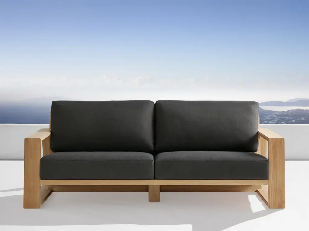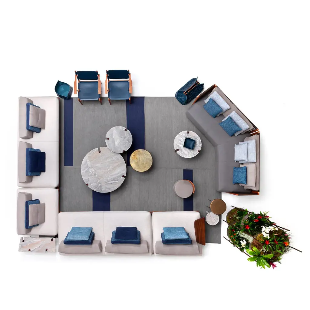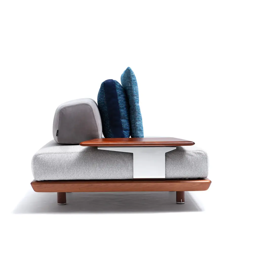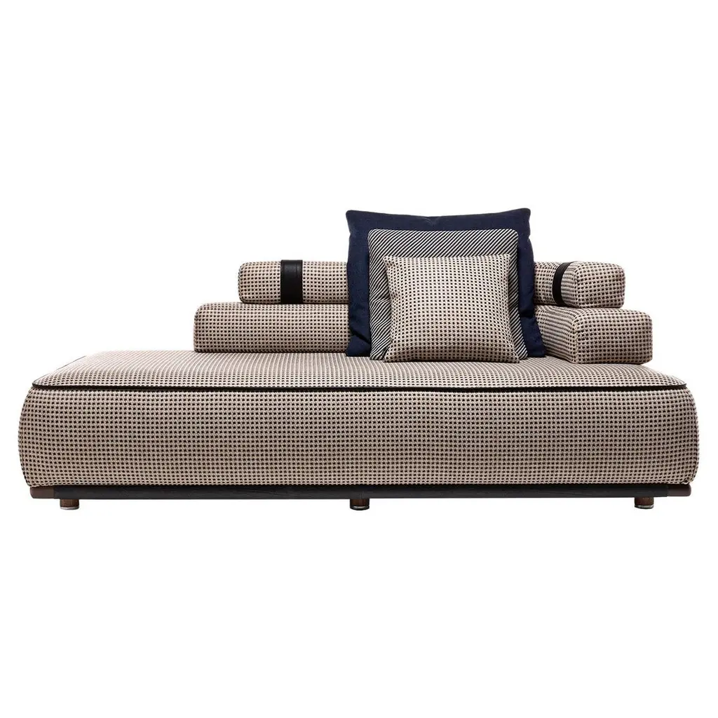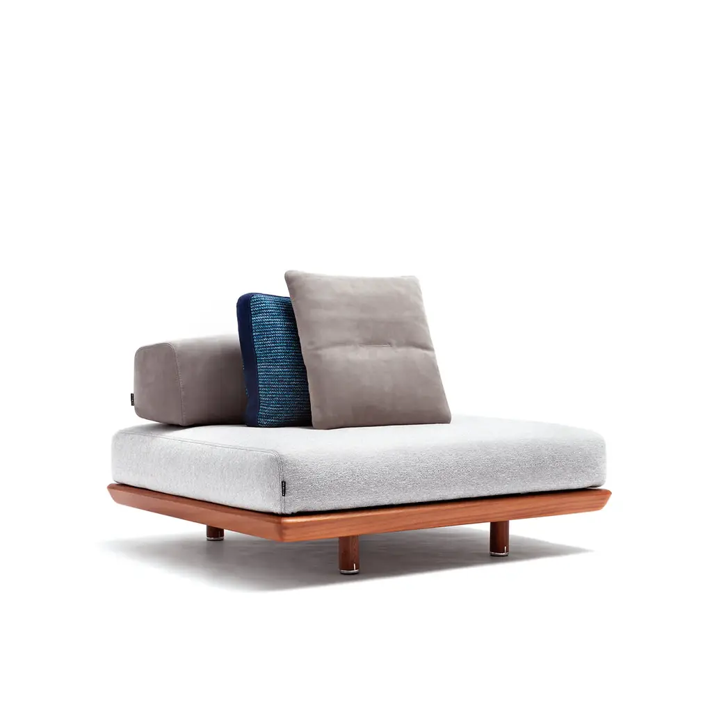 Part of a seating system that will embrace space with infinite compositional possibilities, this extraordinary design by Massimo Castagna is best showcased alongside others from the Caprera series. Its sleek design elegantly combines simple, essential lines with the natural preciousness of mahogany, matched to fine upholsteries. Cushions included. This piece is available for customization upon request to the Concierge. An outdoor cover is recommended to protect the piece when left outside. If the products are placed completely outside, nightcovers that can be purchased at an extra price are recommended. Please contact the Concierge for further information and options.