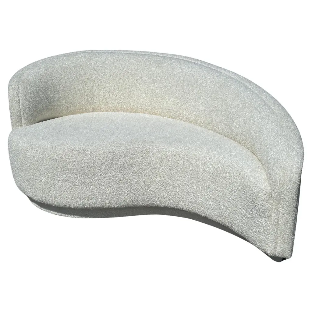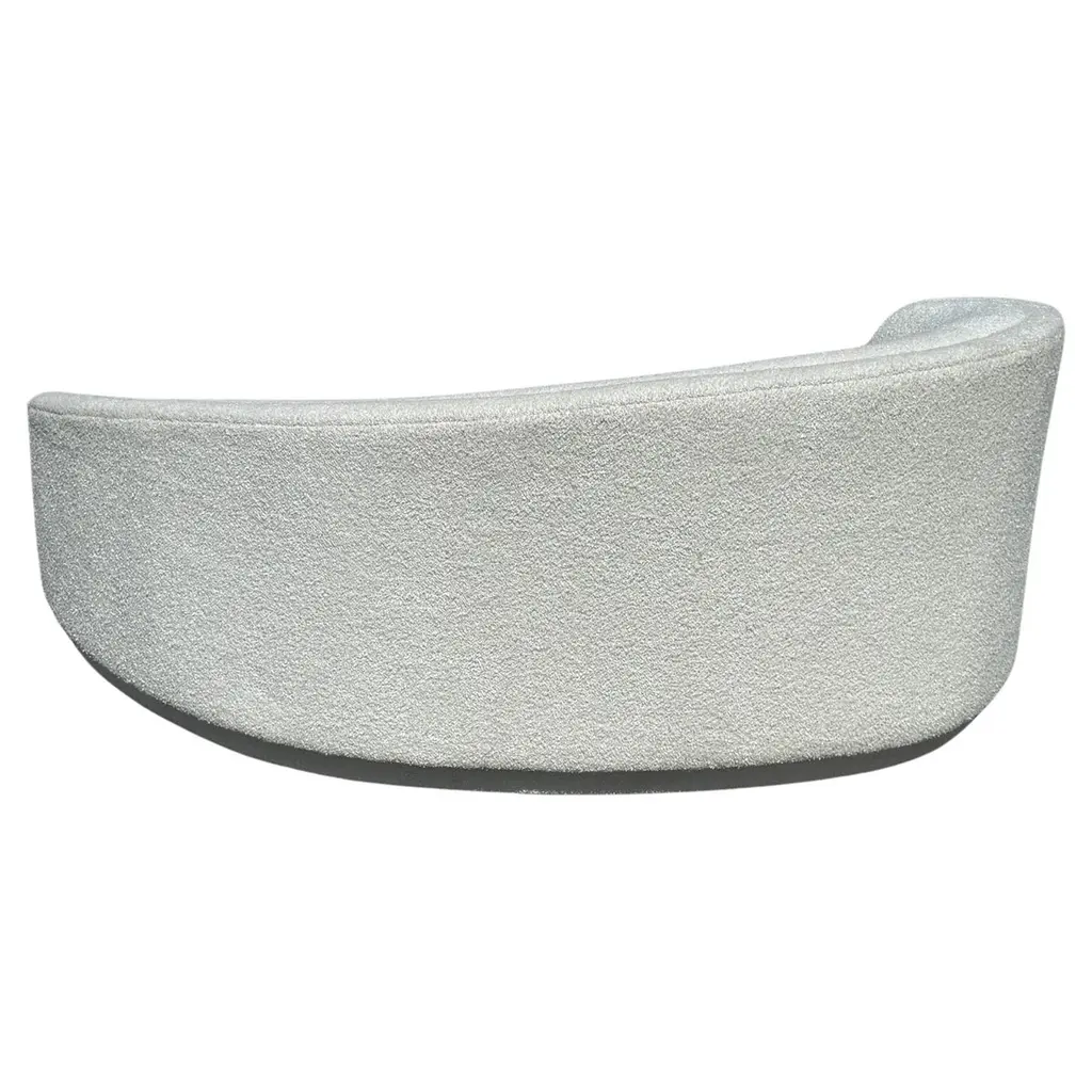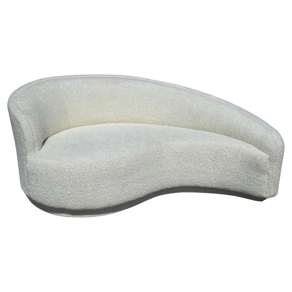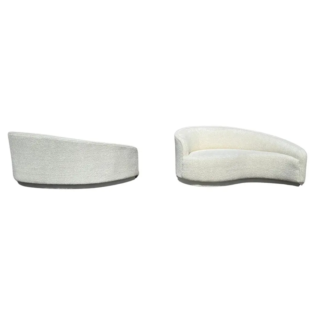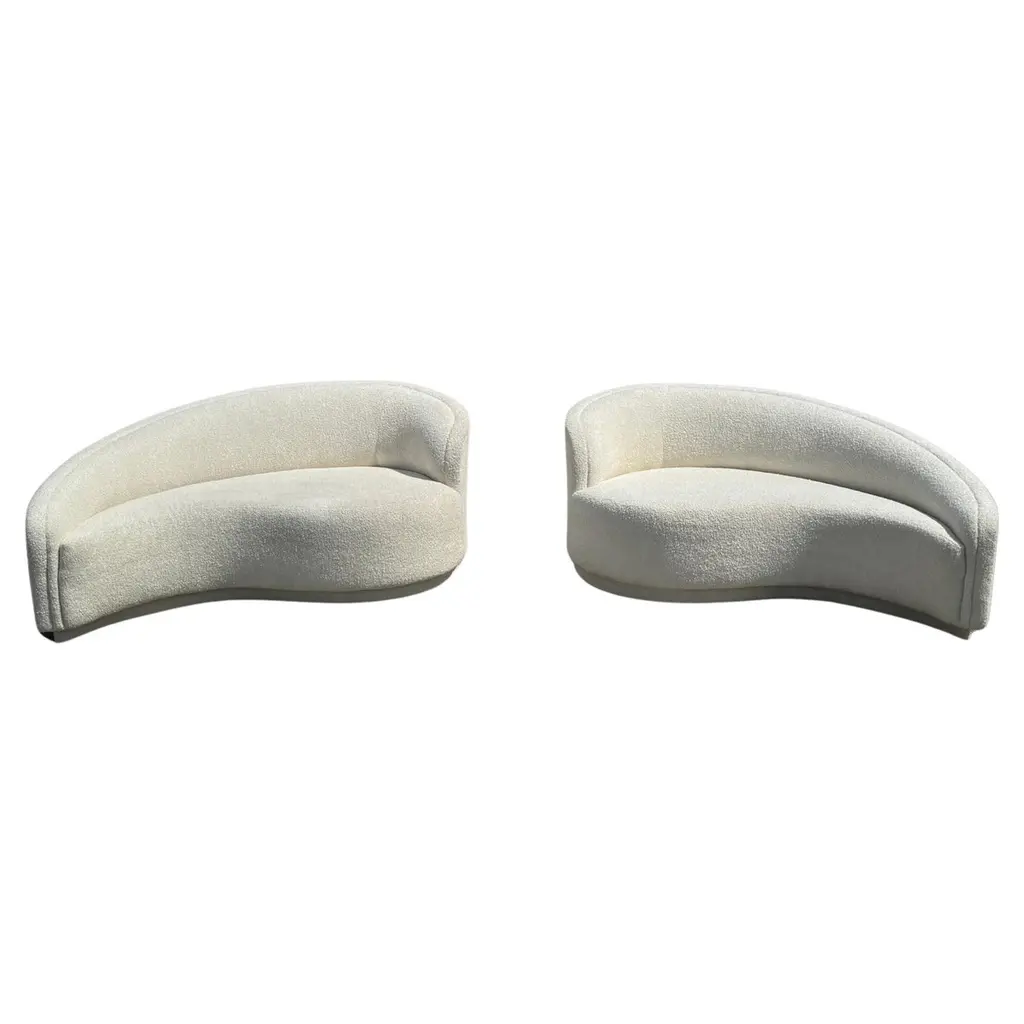 Two 1980s petite sofas or chaise lounge, both right and left arm versions by Weiman / Preview. comma or nautlius form, in the original off white bouclé fabric. They have been professionally cleaned, Right armed sofa has light discoloration to seat, with a few stains and whiter clean spot from cleaning product. The left arm sofa was used less, and had no discoloration, but cleaned anyway. Right arm should be reupholstered if perfection is sought, left arm is good to go. Retains Weiman / Preview labels. Vladimir Kagan also designed for Weiman.