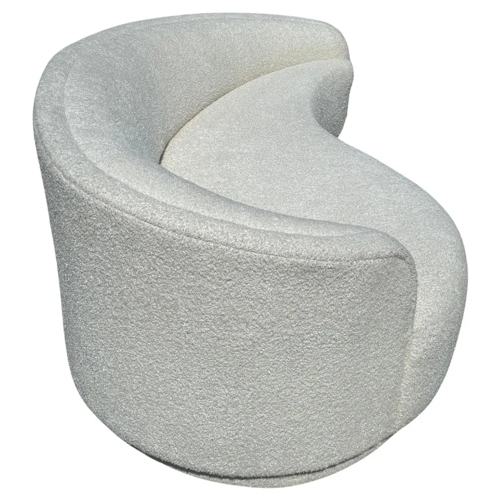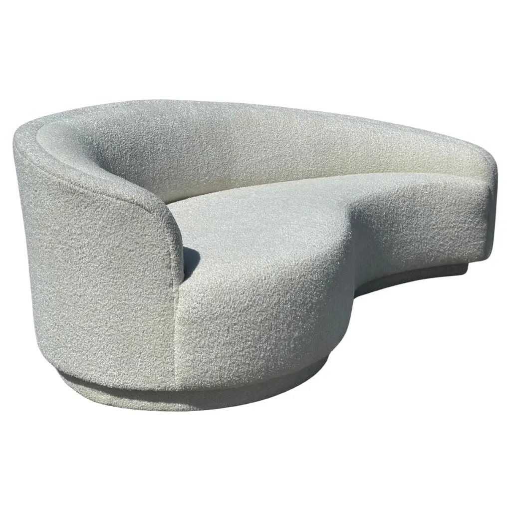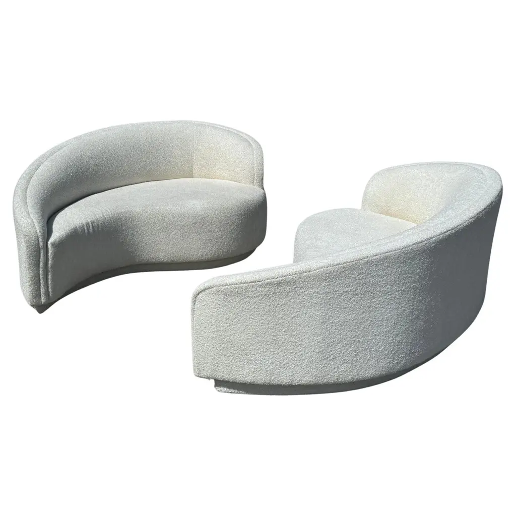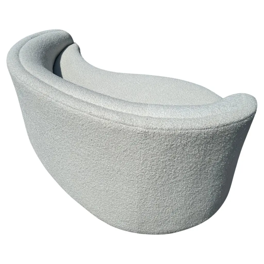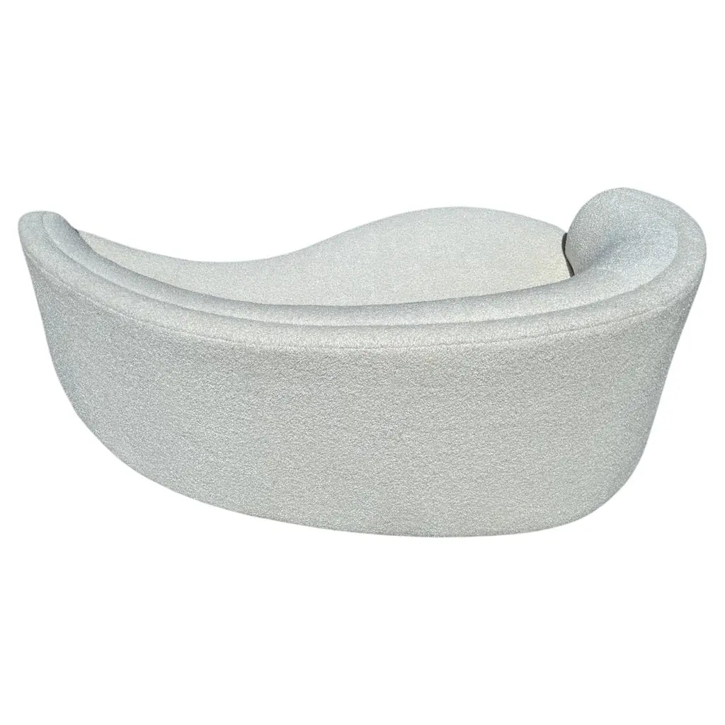 Two 1980s petite sofas or chaise lounge, both right and left arm versions by Weiman / Preview. comma or nautlius form, in the original off white bouclé fabric. They have been professionally cleaned, Right armed sofa has light discoloration to seat, with a few stains and whiter clean spot from cleaning product. The left arm sofa was used less, and had no discoloration, but cleaned anyway. Right arm should be reupholstered if perfection is sought, left arm is good to go. Retains Weiman / Preview labels. Vladimir Kagan also designed for Weiman.