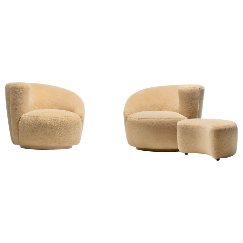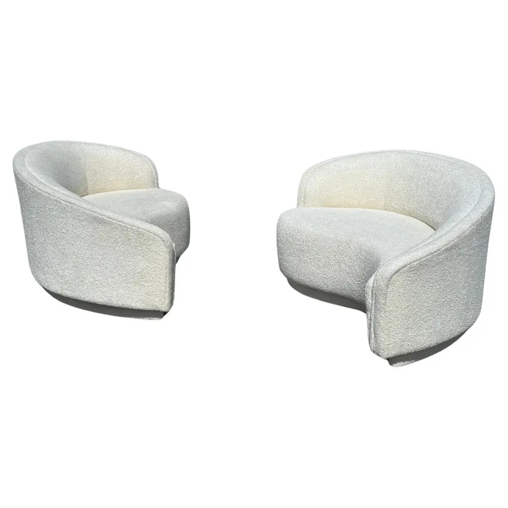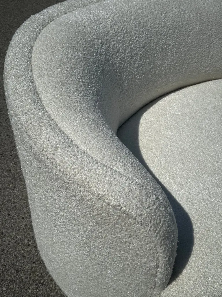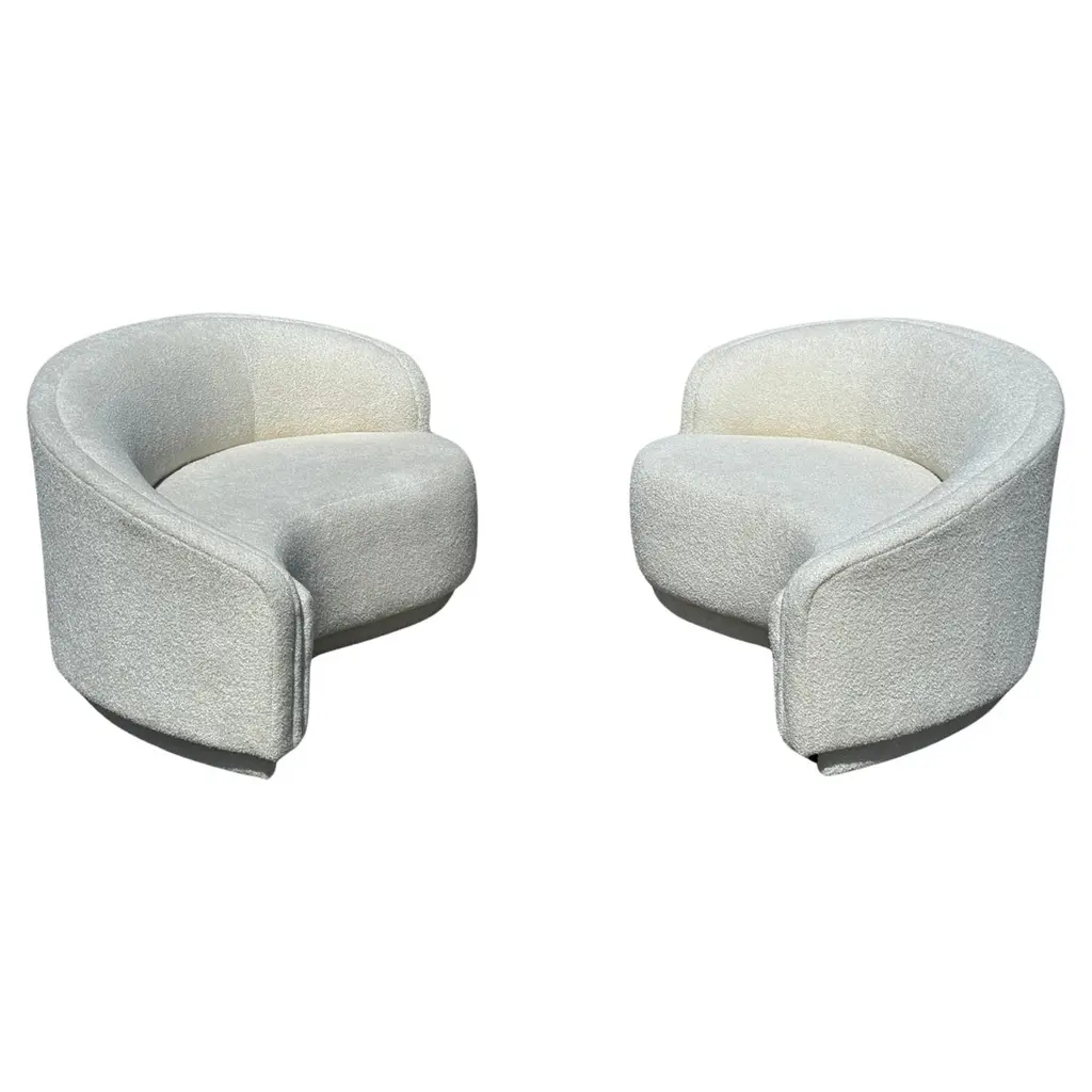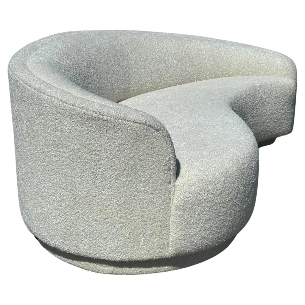 Two 1980s petite sofas or chaise lounge, both right and left arm versions by Weiman / Preview. comma or nautlius form, in the original off white bouclé fabric. They have been professionally cleaned, Right armed sofa has light discoloration to seat, with a few stains and whiter clean spot from cleaning product. The left arm sofa was used less, and had no discoloration, but cleaned anyway. Right arm should be reupholstered if perfection is sought, left arm is good to go. Retains Weiman / Preview labels. Vladimir Kagan also designed for Weiman.