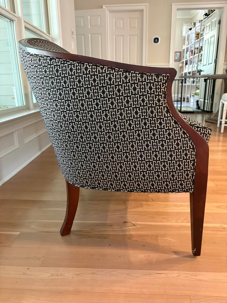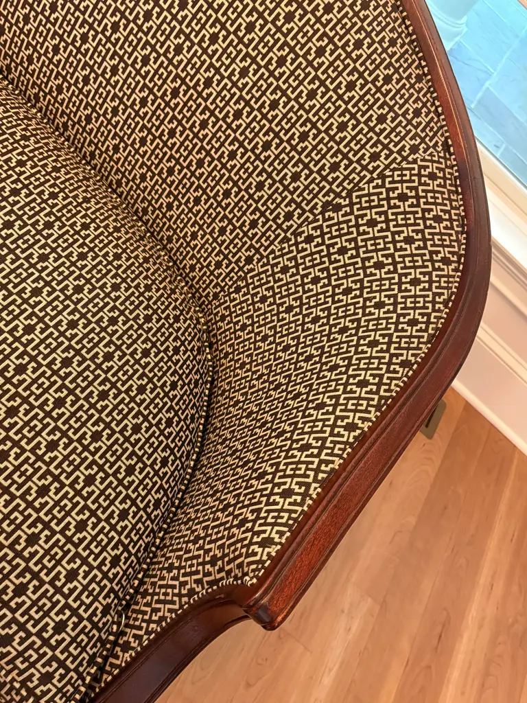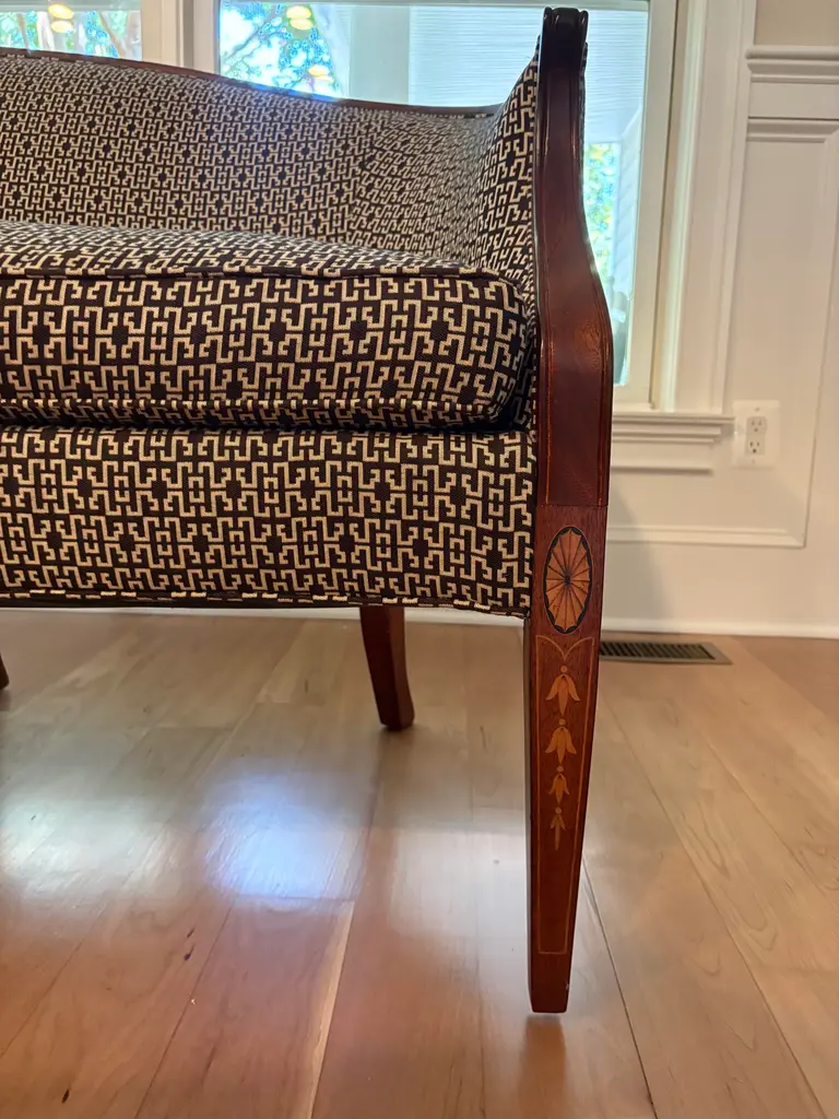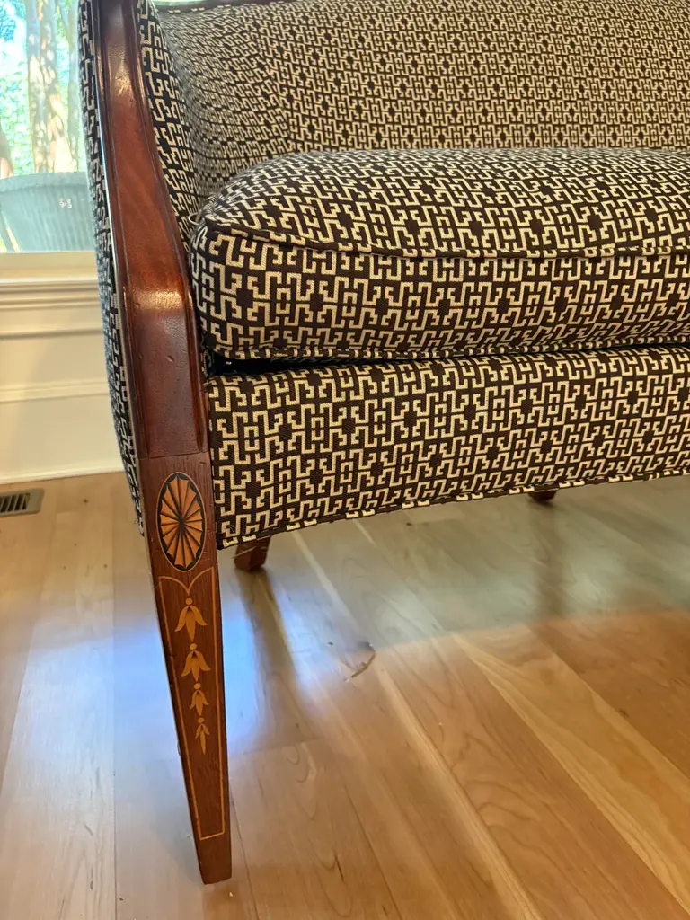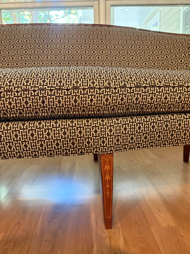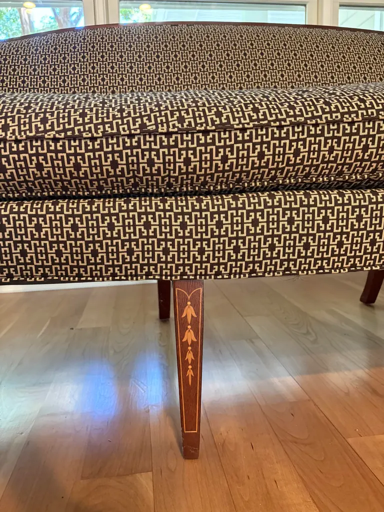 These two Chippendale sofas were used in a large room facing each other with a round table in between. They have seen many happy gatherings. The upholstery is very neutral classic, with goose down filling, and will work well in almost any setting. The legs and trim are a beautiful mahogany wood with absolutely gorgeous maple inlay on all 4 front legs. These come as a pair for $1950.00 or will sell separately for $1000..00 each. Either way, be prepared to love them!