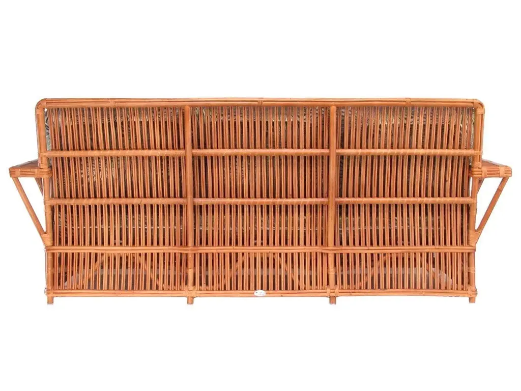 Stick Rattan “Nantucket” Three-Seat Sofa This striking Nantucket 3-seater sofa features classic stick rattan framing with tightly woven wicker wrappings, offering both form and function. Each arm includes thoughtful built-in conveniences: a magazine holder on one side and a drink rest on the other — perfect for relaxed, all-day lounging. Dimensions: 35" H × 86" W × 32" D (Seat Height: 18") Optional Matching Pieces Available (Inquire for Pricing): Additional Lounge Chair Additional Ottoman Coffee Table Two-Seat Sofa Living Room Set All our rattan, bamboo, and wicker furniture is hand-selected to meet the highest standards of quality. Every joint and wrapping is personally inspected by “The Rattan Man,” Harvey Schwartz, ensuring a product that will last for decades in any home or office setting. Our lineage traces back to Tropical Sun Rattan, founded in 1934 in California — a pioneer of the Golden Era of American Rattan. Harvey Schwartz, a recognized authority on vintage rattan and author of “Rattan Furniture: Tropical Comfort Throughout the House,” brings this tradition to life through each piece. His 160-page hardcover book is widely respected by collectors, designers, and enthusiasts alike. As featured on the cover of Architectural Digest (2019) and spotlighted in AD PRO (2020), Harvey's on Beverly remains the definitive source for original, expertly restored tropical rattan furniture. Browse our full collection online — look for all rattan under “Harvey's on Beverly.”