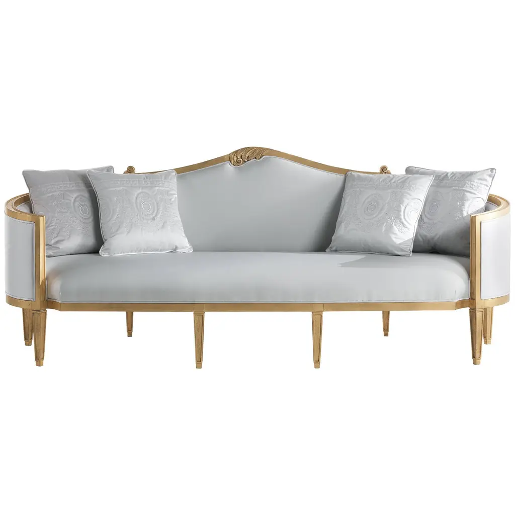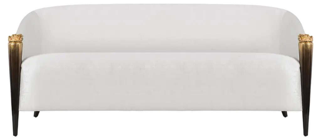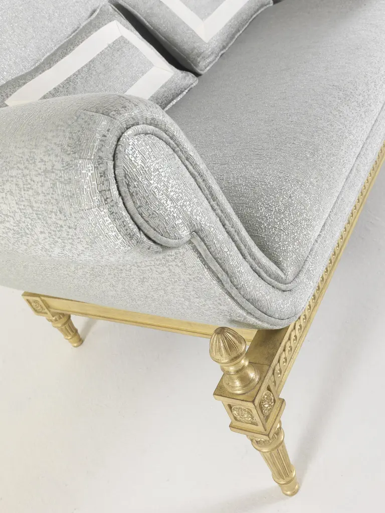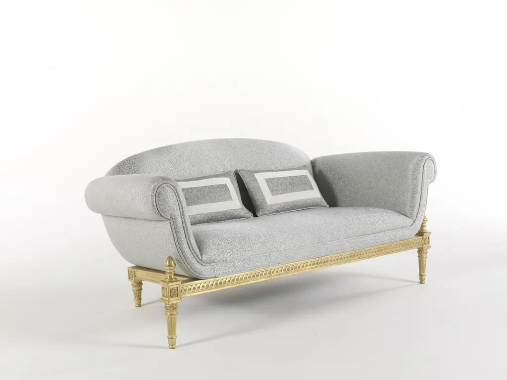 A stunning combination of classic and contemporary, Enigma furniture pieces best represent Jumbo Collection’s New Era concept, a new vision of classic style where tradition and experimentation create something new. Upholstered in cotton velvet, they lend their fresh and bright touch to any room.Enigma 2-seater sofa with structure in hand-carved beechwood finished in antique gold with patina J288O. Padding in foam. Upholstery in fabric MIL.16.011. N° 2 pillows 50x30 cm included.