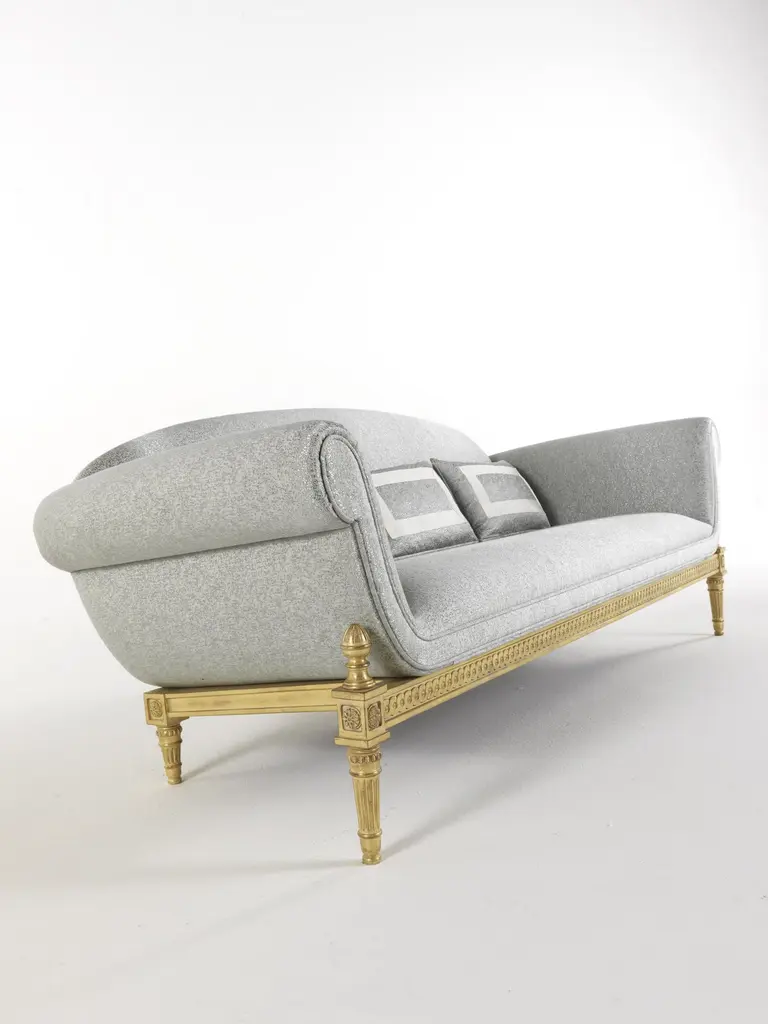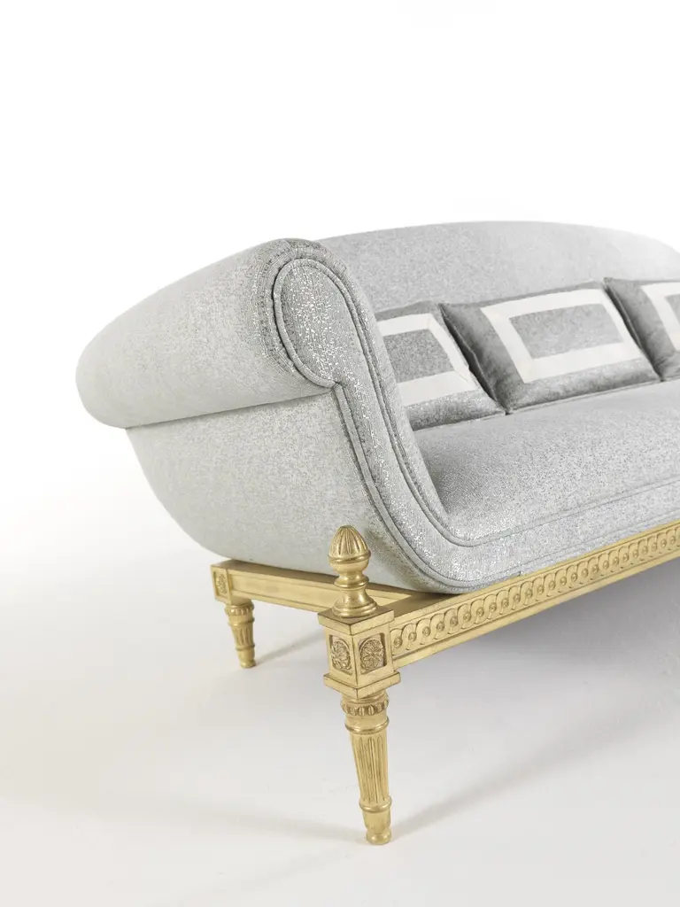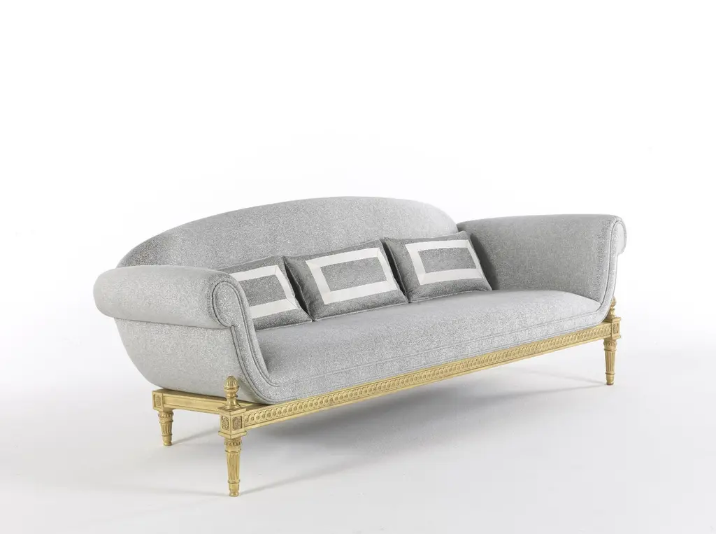 A stunning combination of classic and contemporary, Enigma furniture pieces best represent Jumbo Collection’s New Era concept, a new vision of classic style where tradition and experimentation create something new. Upholstered in cotton velvet, they lend their fresh and bright touch to any room.Enigma 3-seater sofa with structure in hand-carved beechwood finished in antique gold with patina J288O. Padding in foam. Upholstery in fabric MIL.16.011. N° 3 pillows 50x30 cm included.
