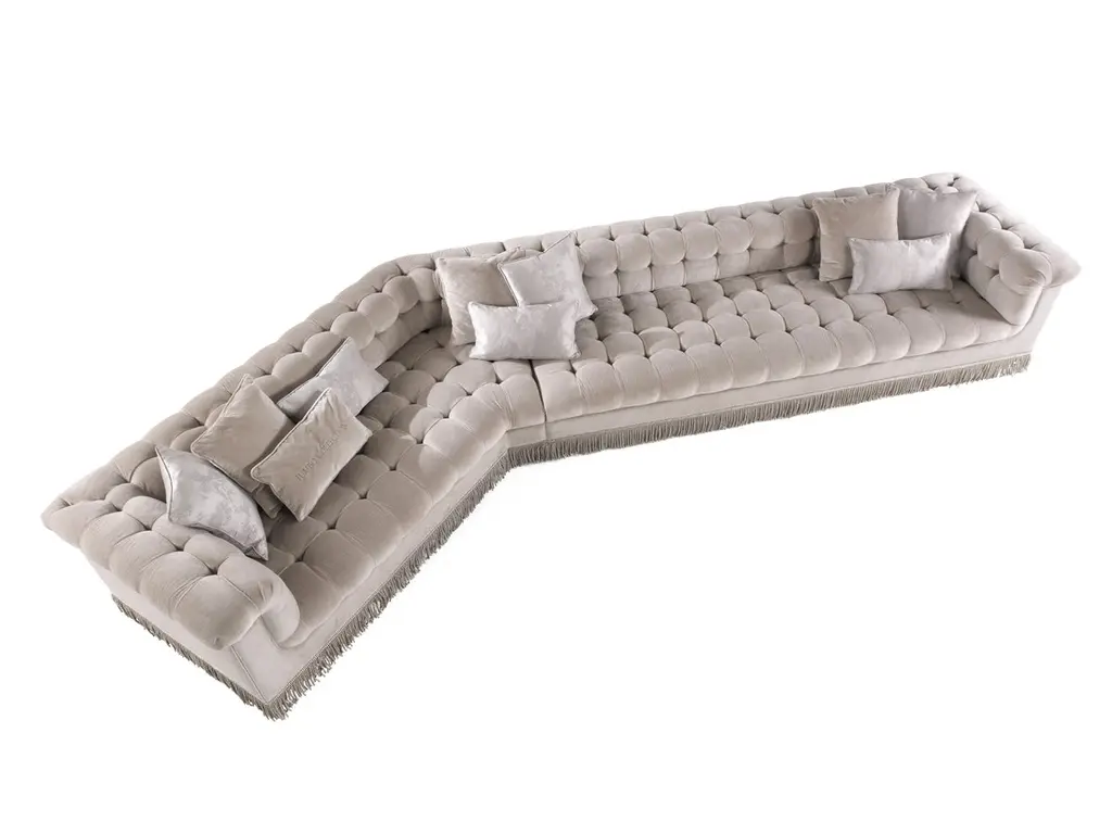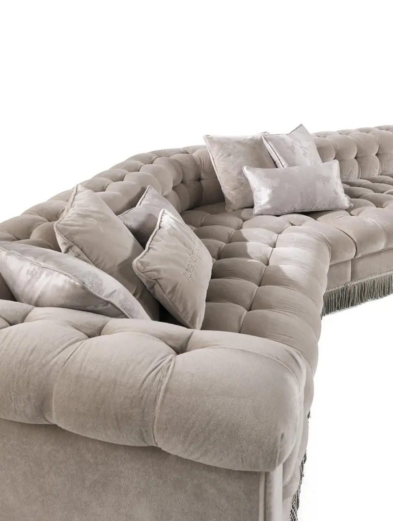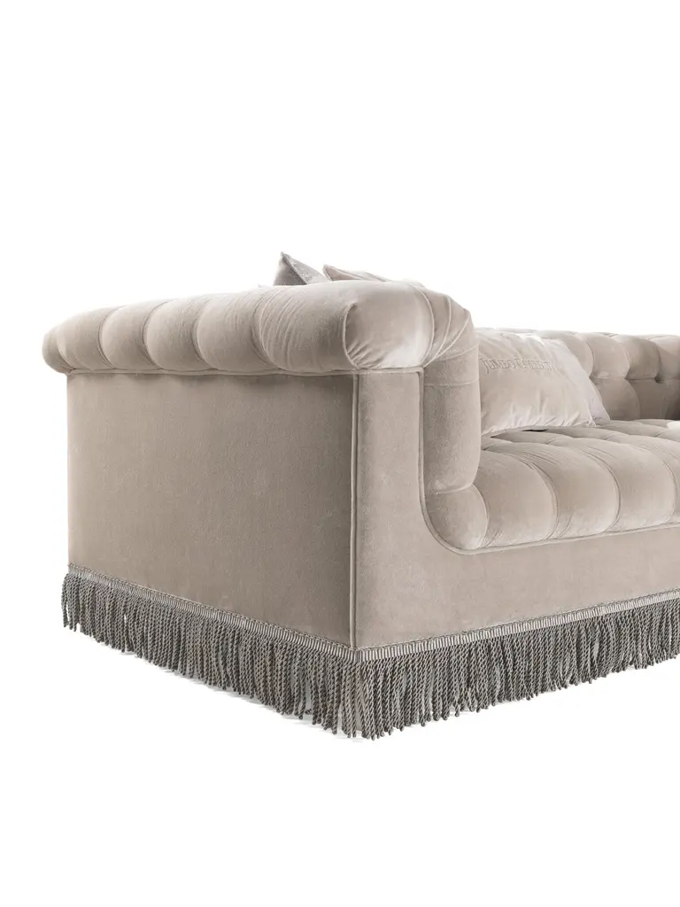 Grand Armée is a line with soft and welcoming shapes, enhanced by the timeless charm of the capitonné manufacturing. The decorative fringes in fabric add a classic note, for versatile and eclectic pieces of furniture in line with the identity of the Jumbo Collection brand.Grand Armée sofa with structure in wood. Padding in foam. Seat, back and arms fully upholstered in velvet MIL.21.23 with capitonné.Fringe in fabric.N° 6 pillows 50 x 50 cm,N° 3 pillows 50 x 30 cm,N° 1 pillow 50 x 30 cm with logo Jumbo Collection included